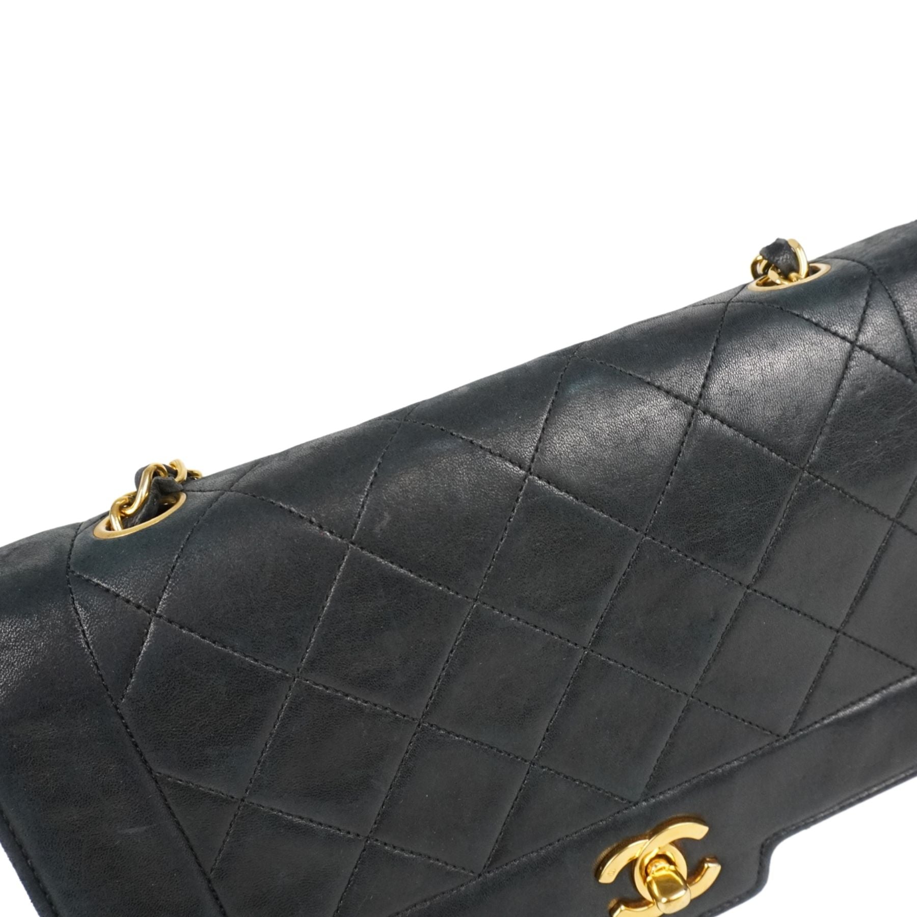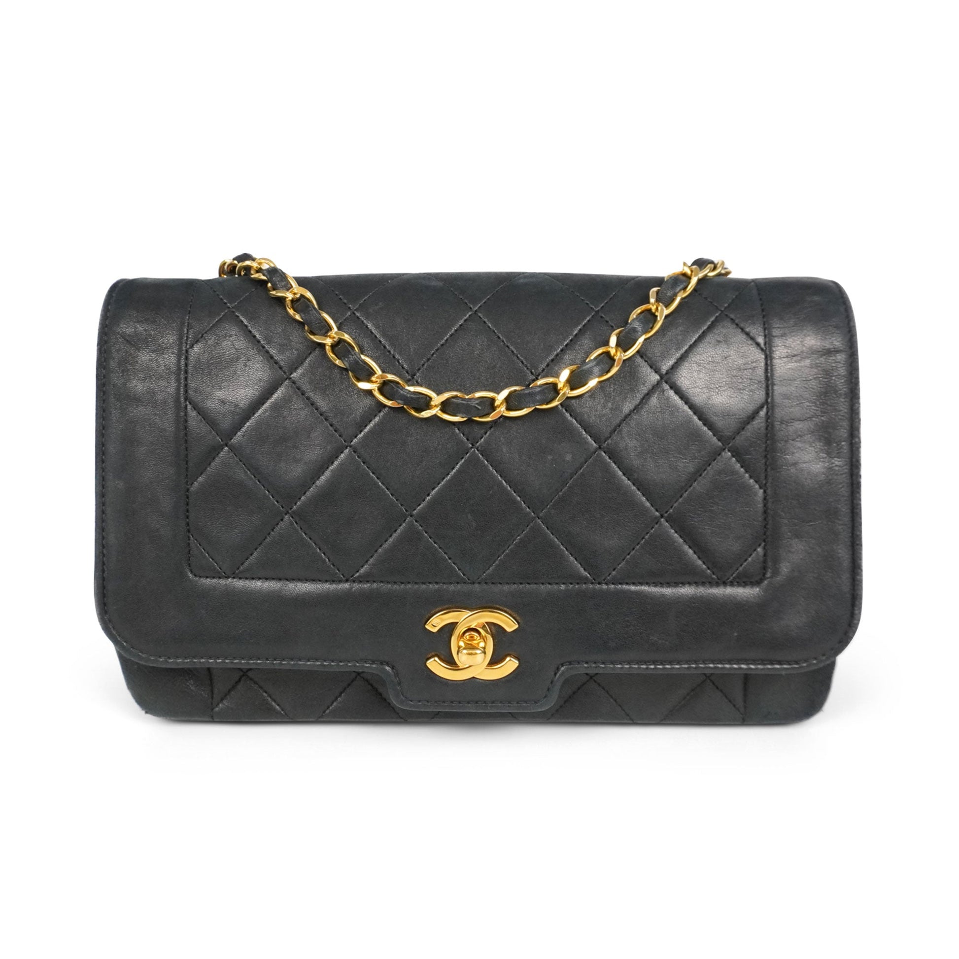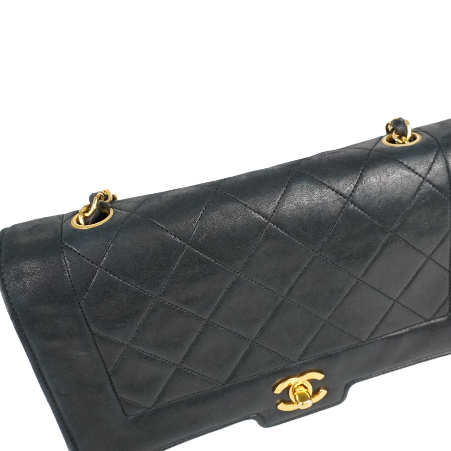 Chanel 'Diana' handbag in black quilted lambskin leather with a front flap turn-lock closure in gold hardware. Features a chain link strap, an inner burgundy lining with an inner zip and open pocket.