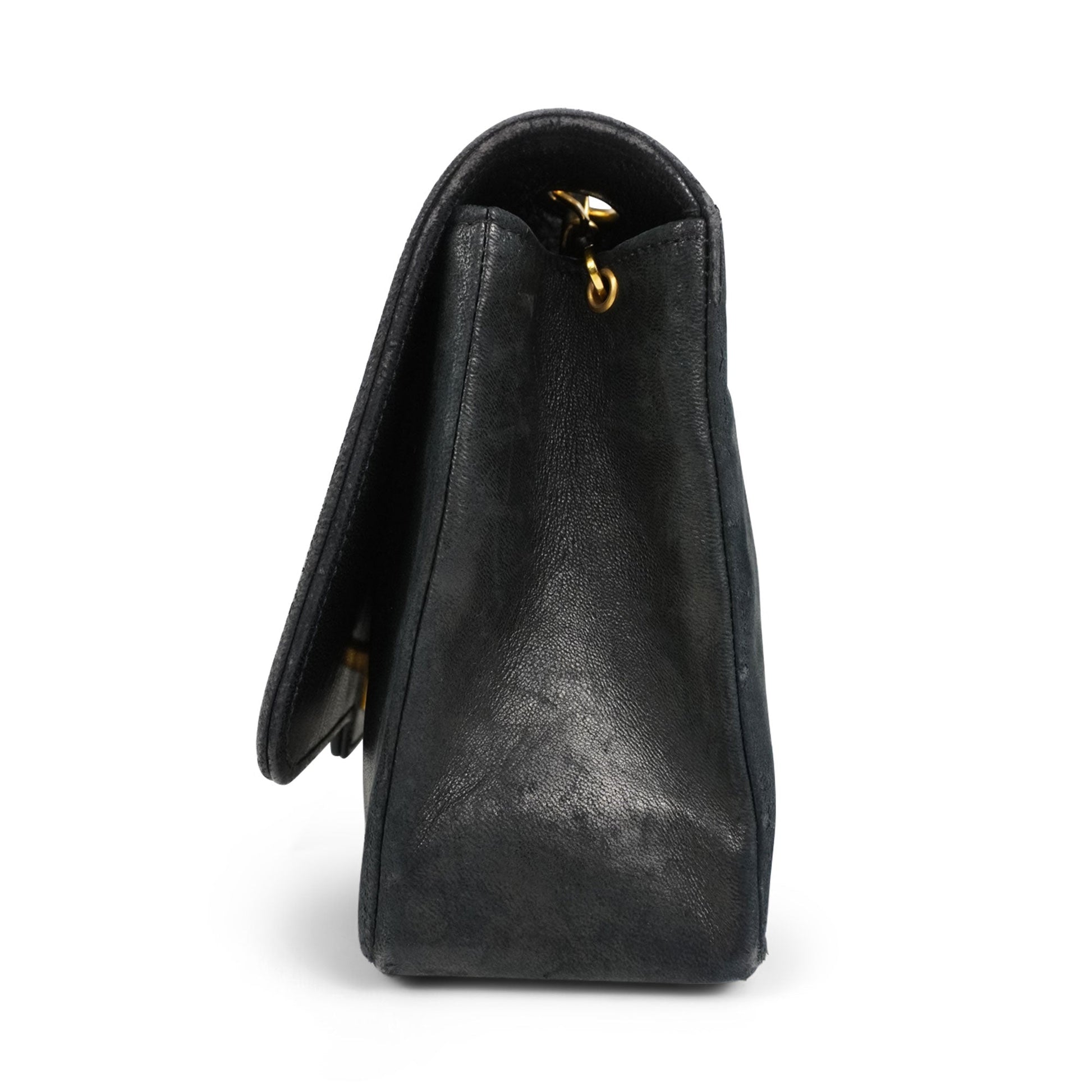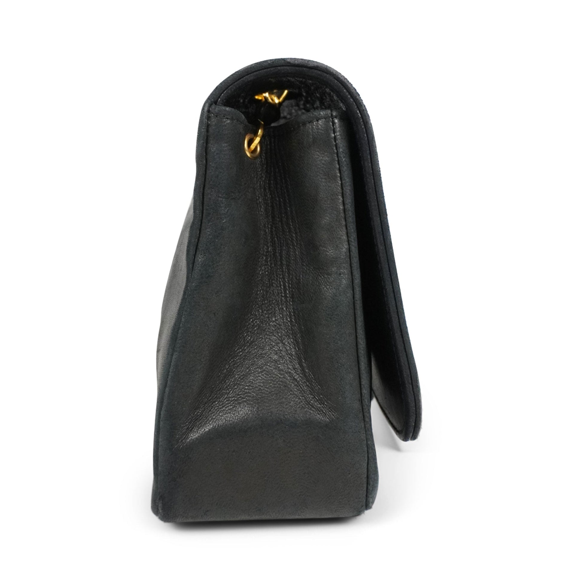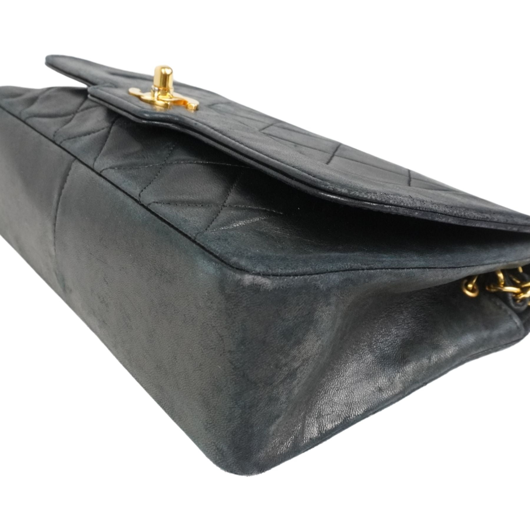 Chanel 'Diana' handbag in black quilted lambskin leather with a front flap turn-lock closure in gold hardware. Features a chain link strap, an inner burgundy lining with an inner zip and open pocket.