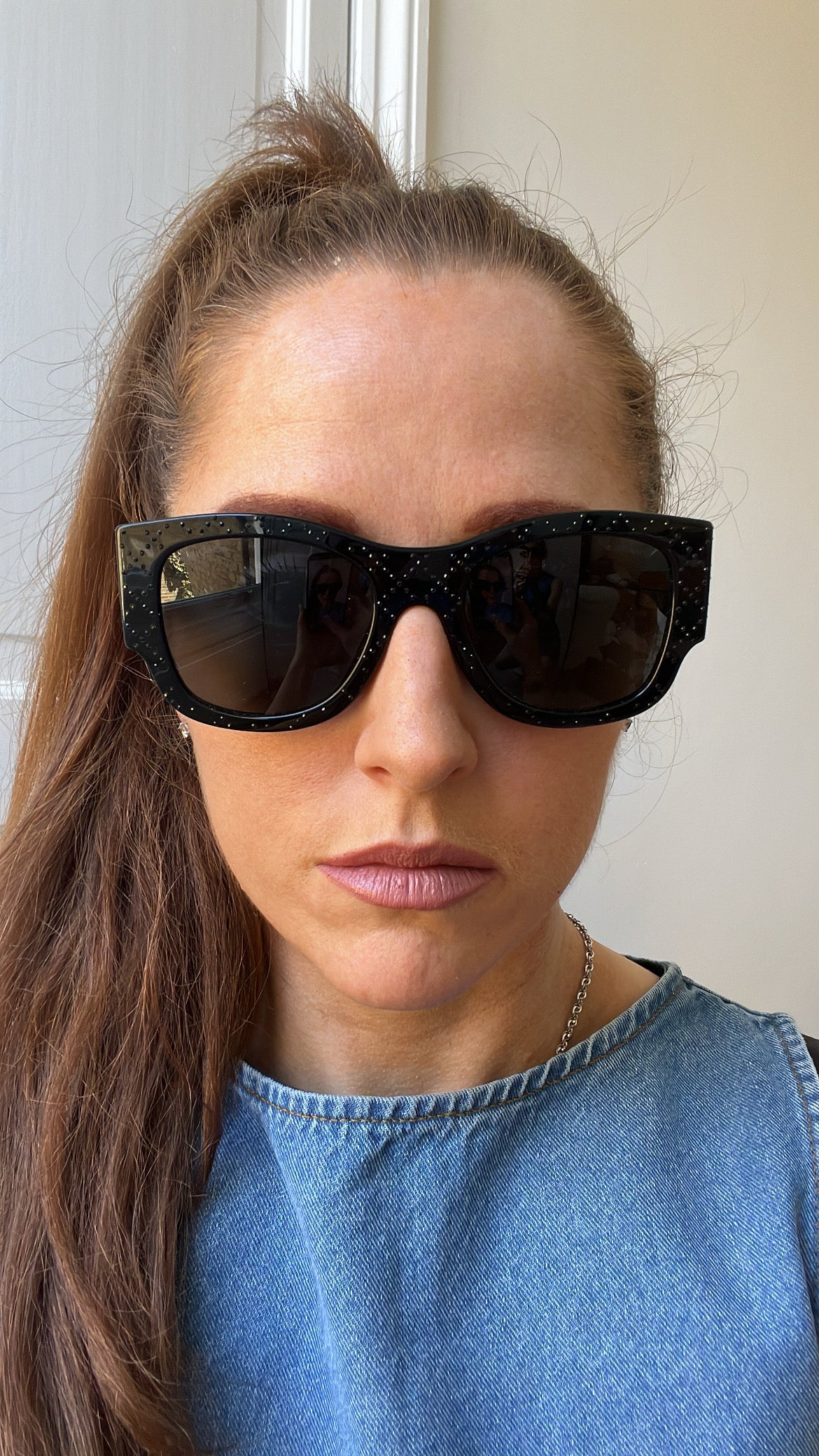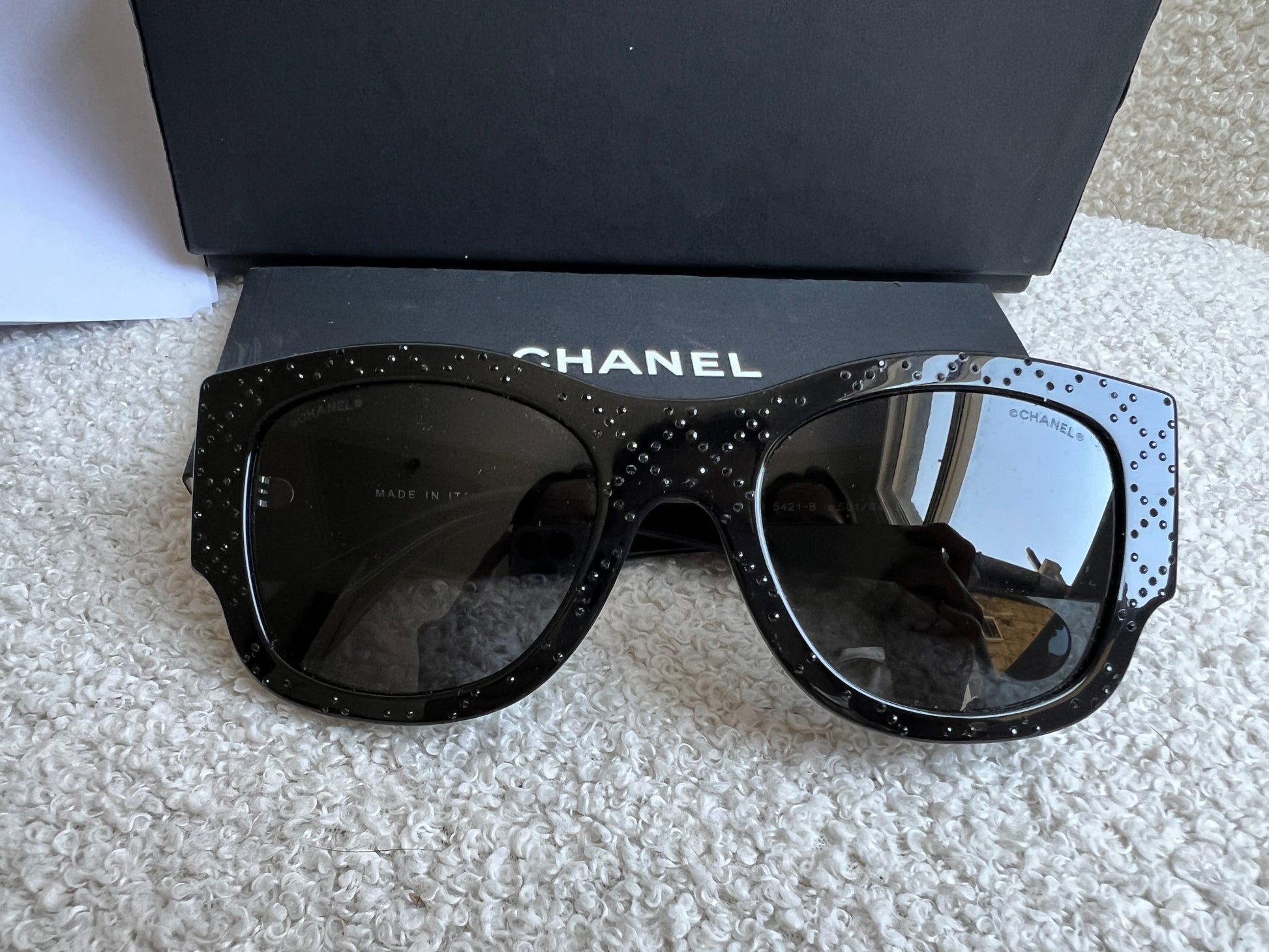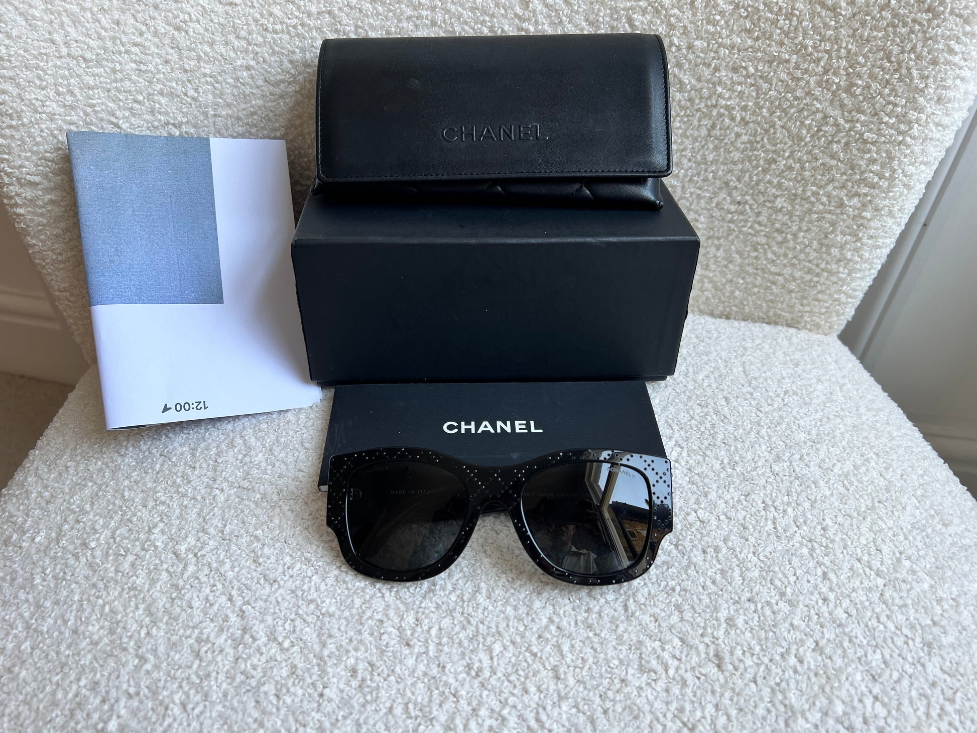 Chanel Black Sunglasses with diamanté detailing on the sides. CC details on the temples. Purchases from Selfridges for £646.