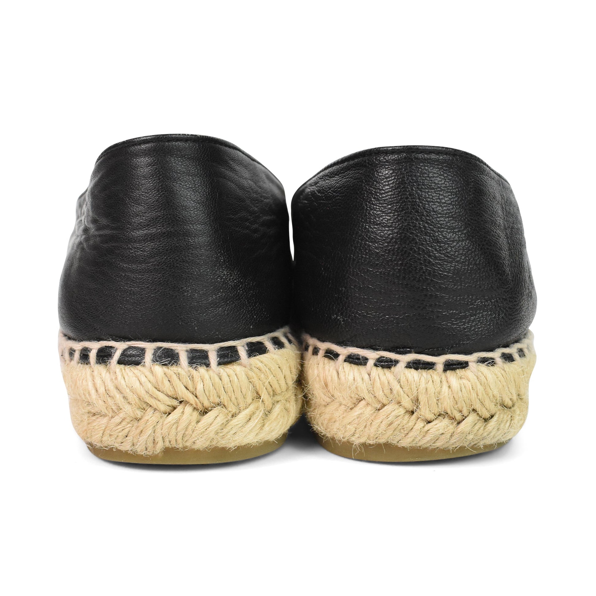 Chanel espadrilles in black leather with an embossed CC, white contrast stitching, and a raffia sole.