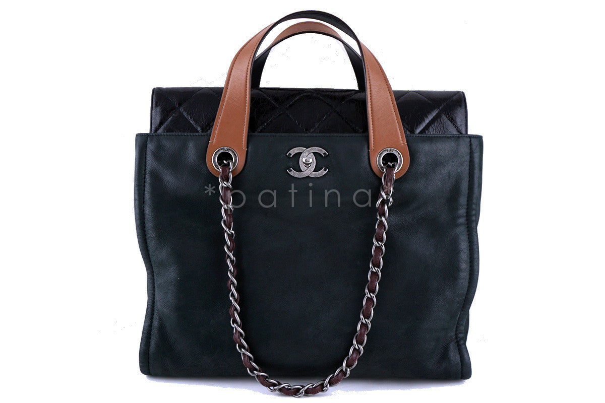 Chanel Black In the Mix Portobello Soft CC Turnlock Tote Bag showcases Chanel both casual and chic at the same time - soft leather, quilted structure, camel contrast leather accents and antiquated pewter hardware.