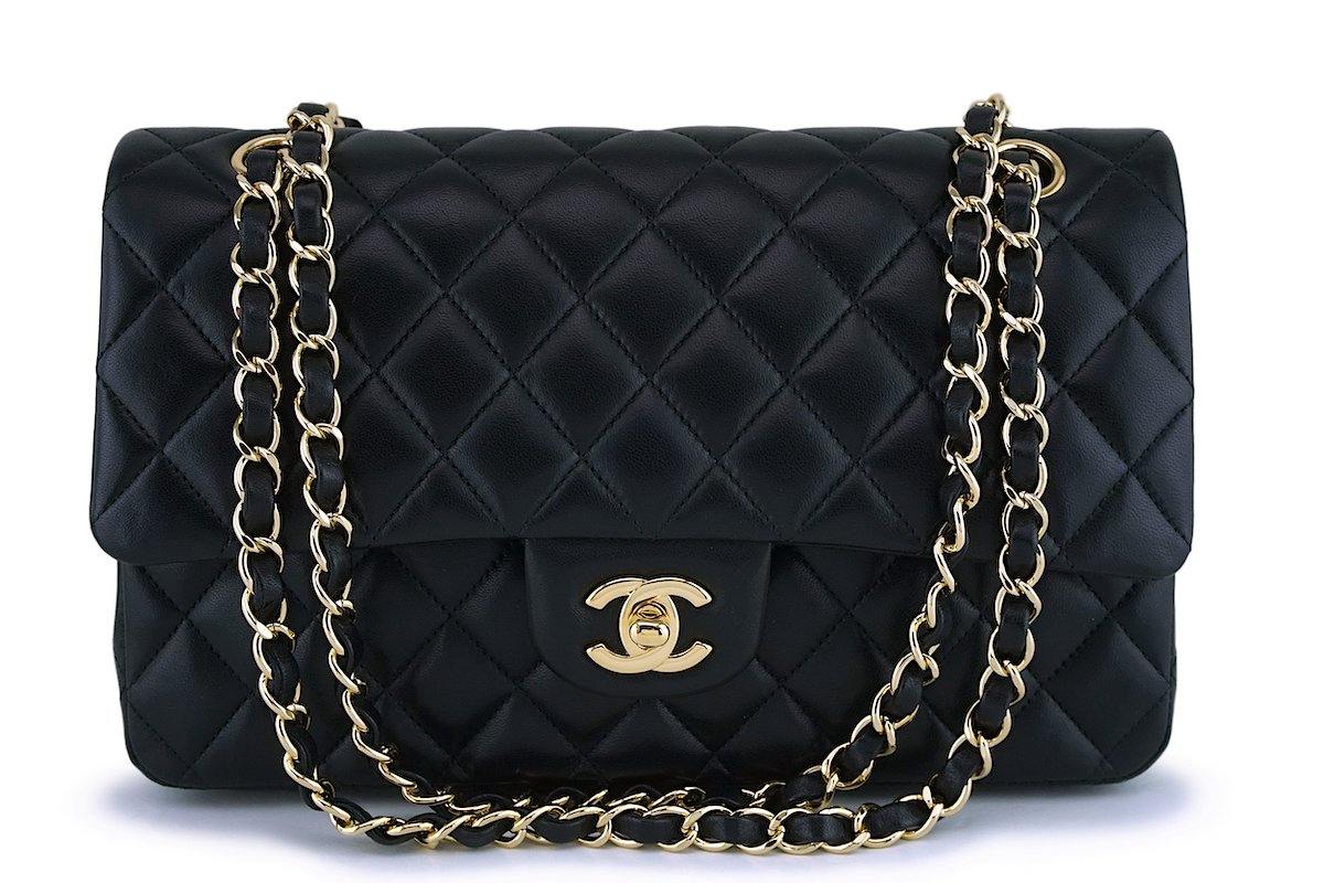 In Black lambskin leather and gold hardware. In lambskin leather, the original classic flap in all its glory with its petal soft quilts, true luxury.