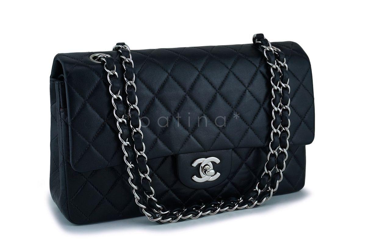 In black lambskin leather and silver hardware. In lambskin leather, the original classic flap in all its glory with its petal soft quilts, true luxury.