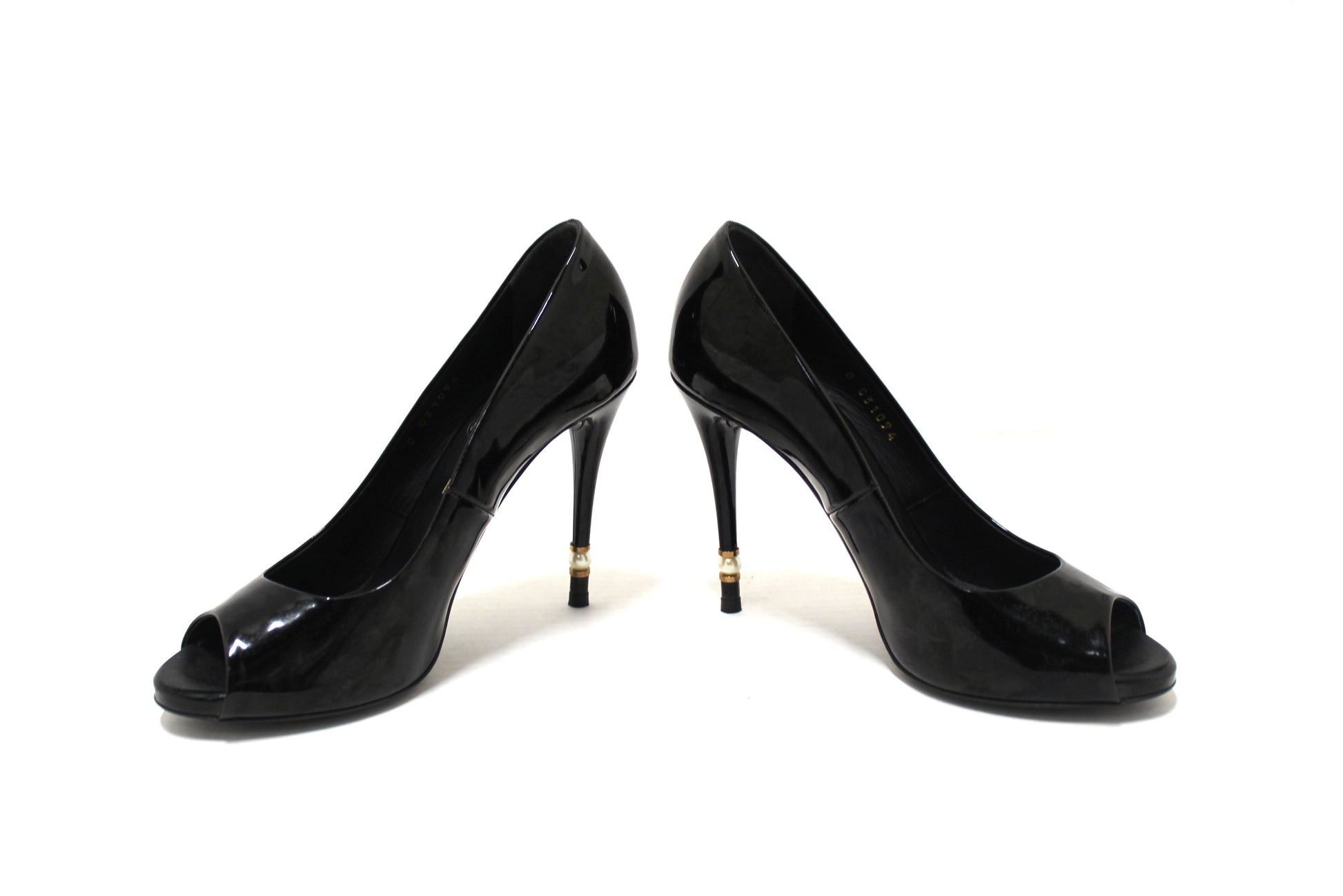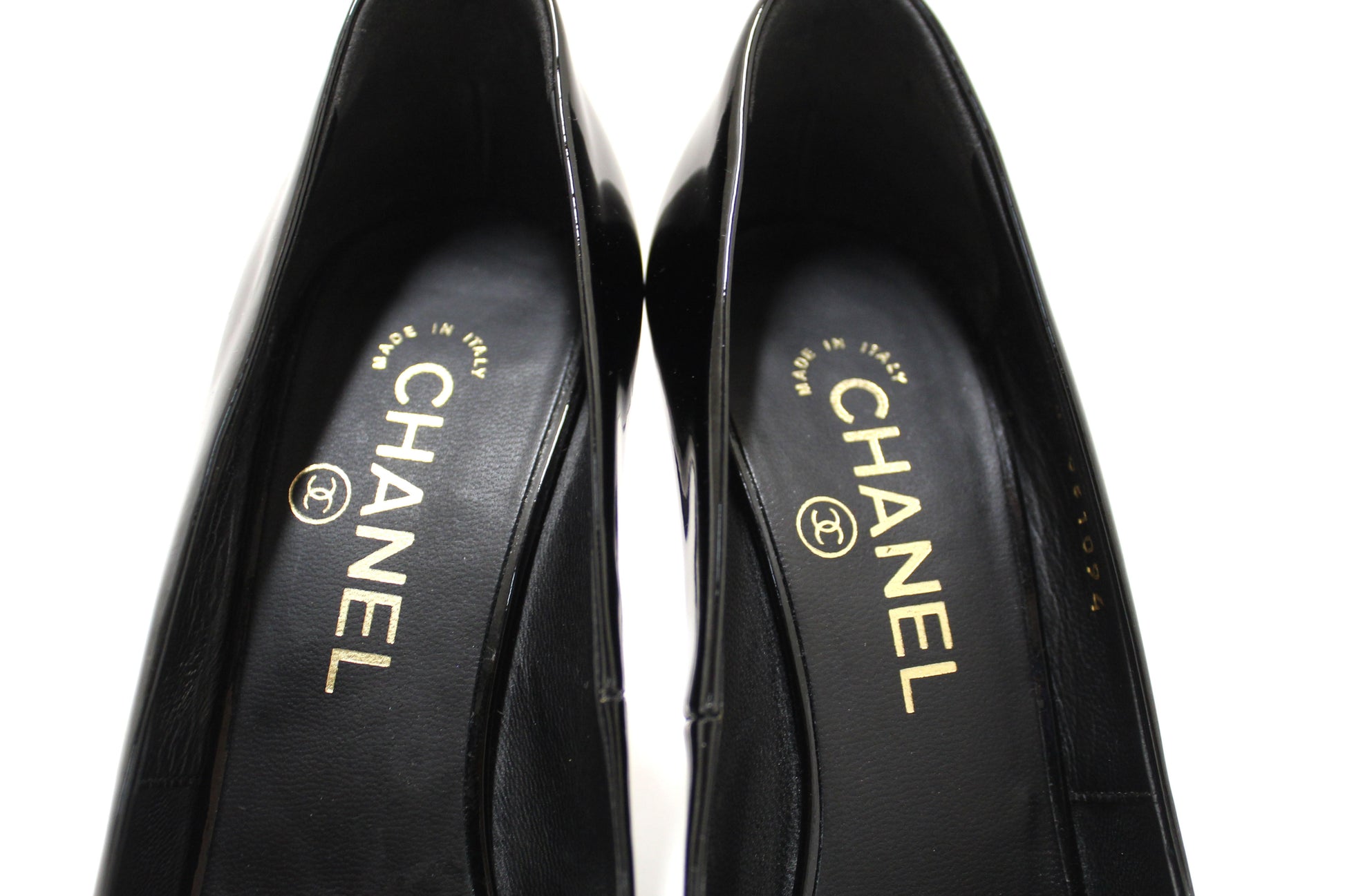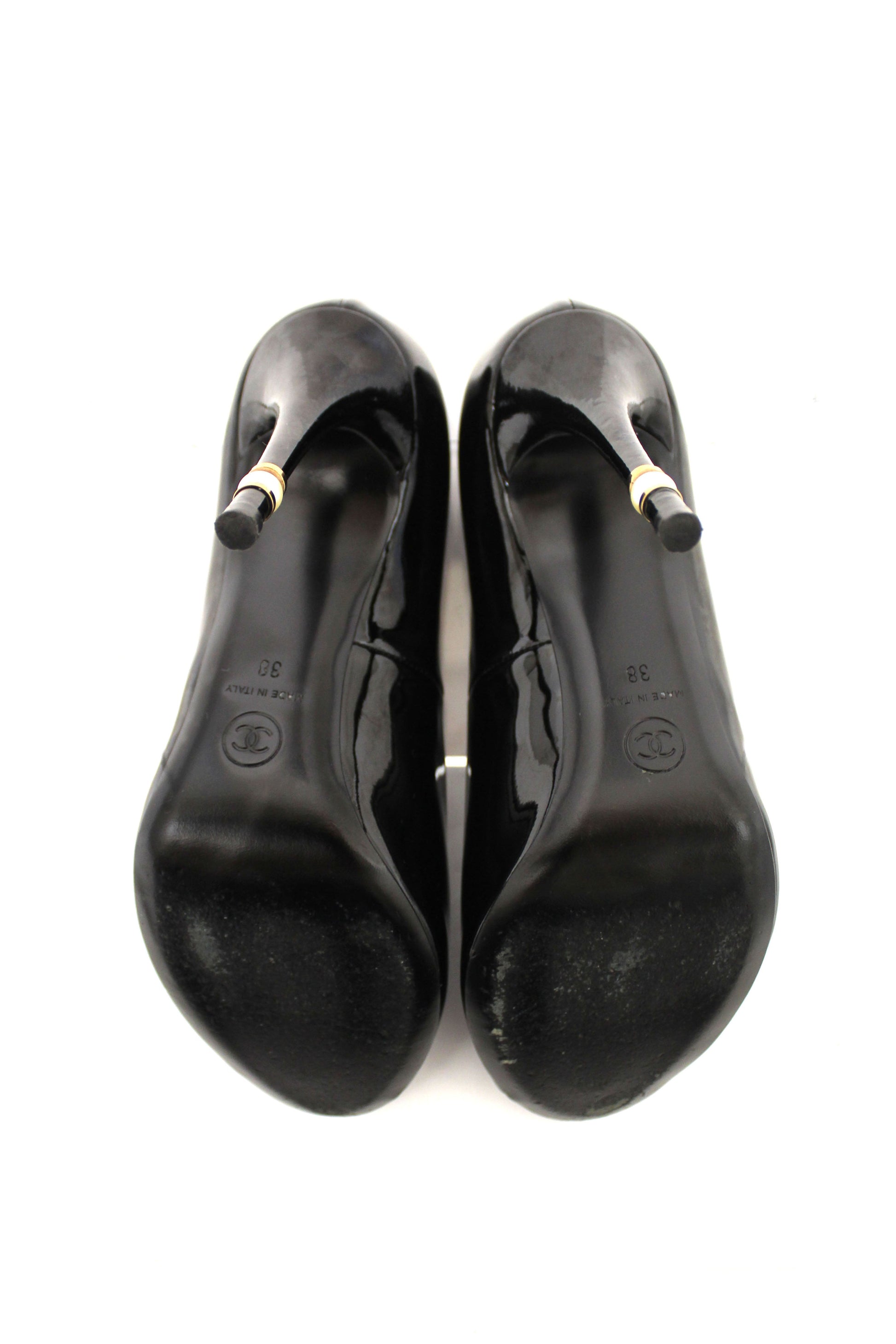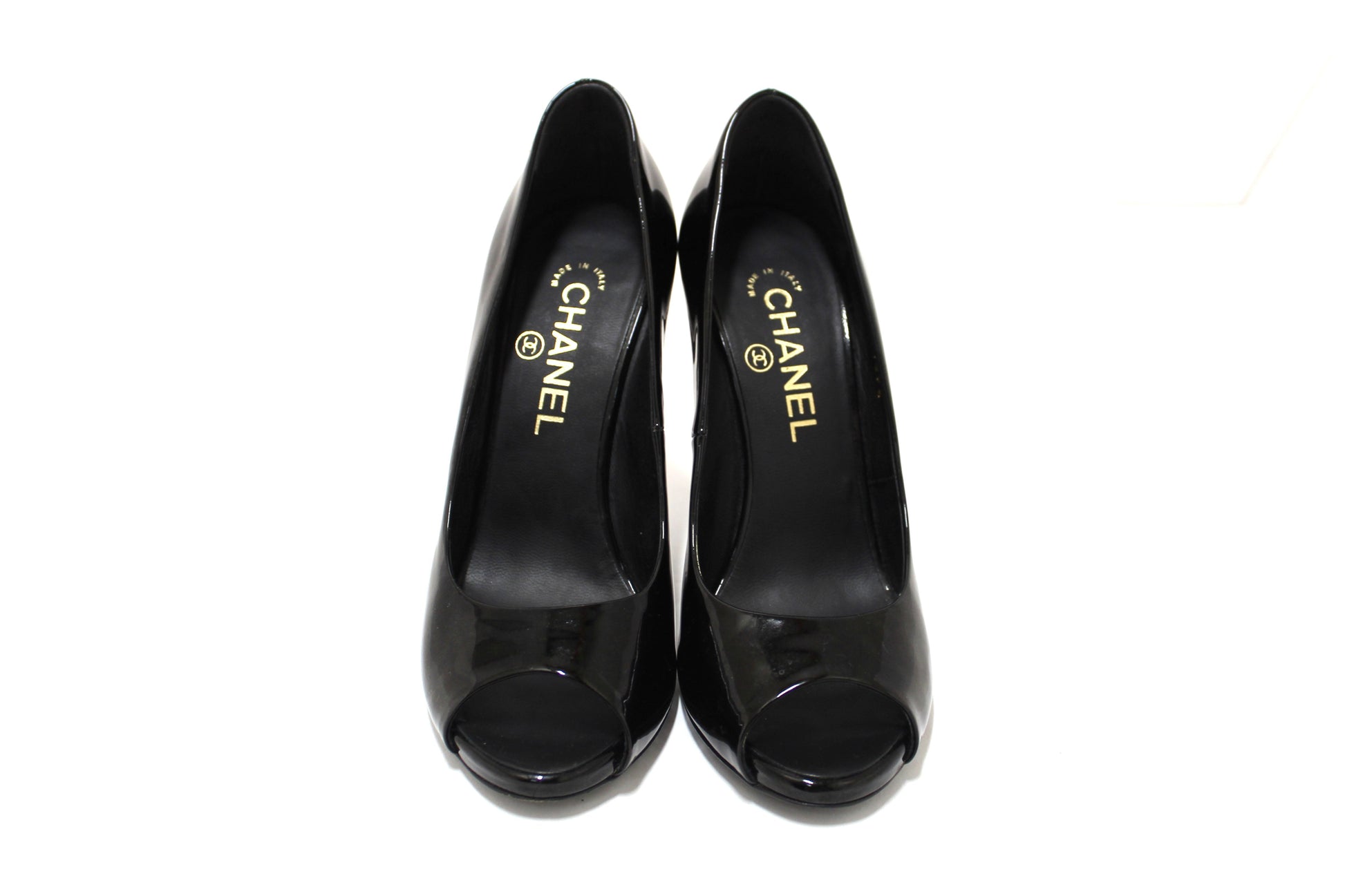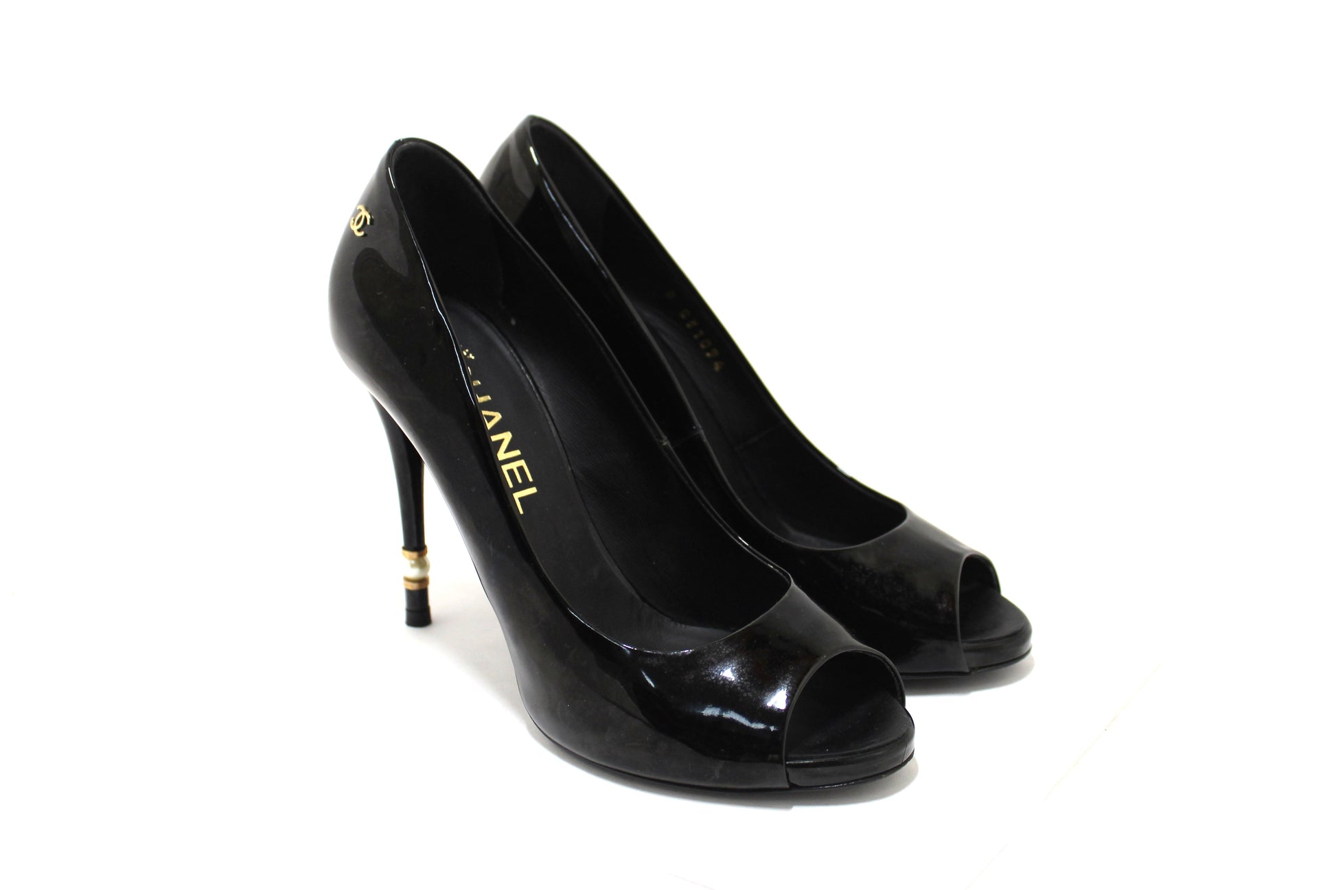Chanel Black Patent Leather CC Pearl Embellished Heel Peep Toe Pumps Size 38
