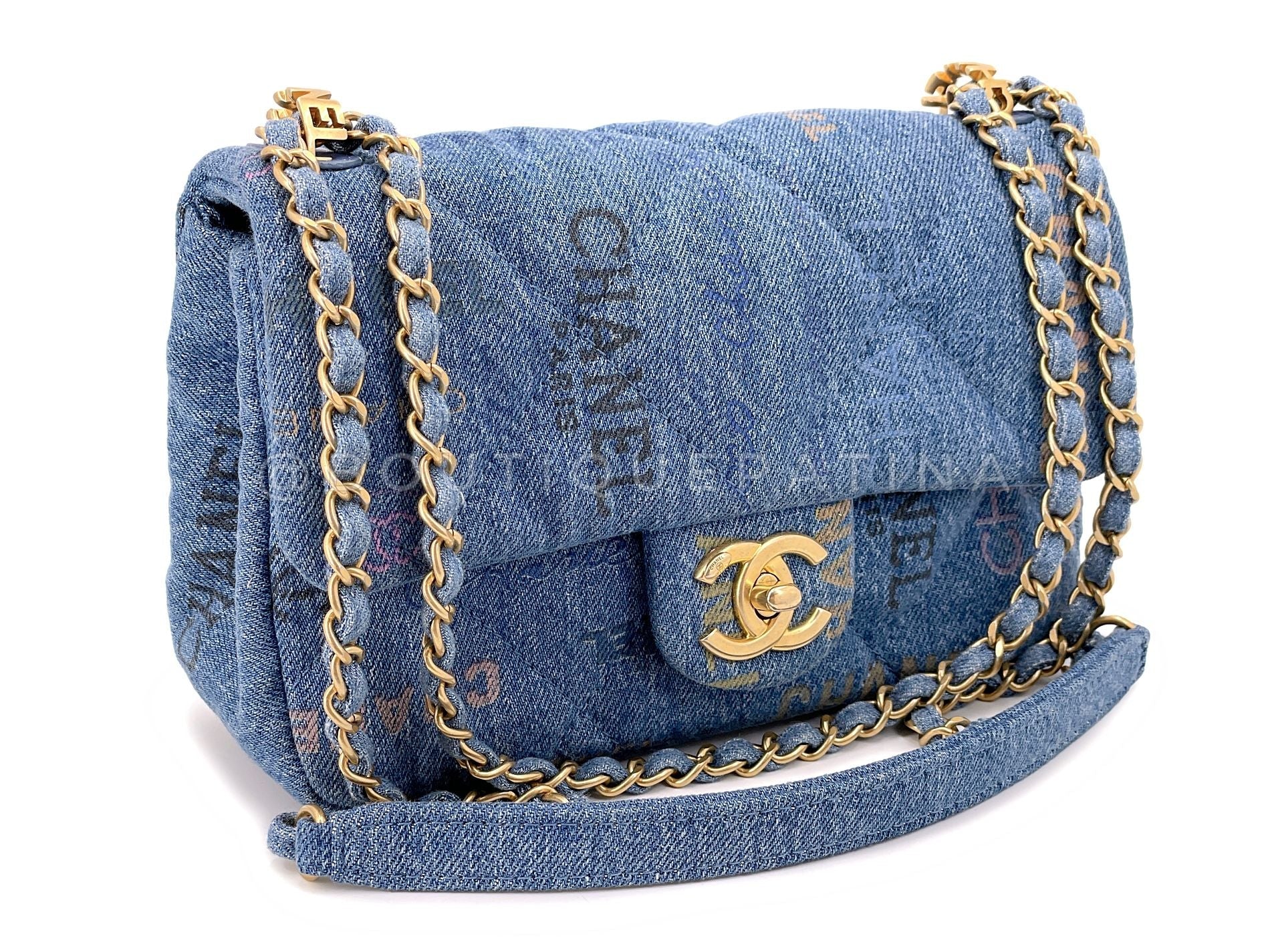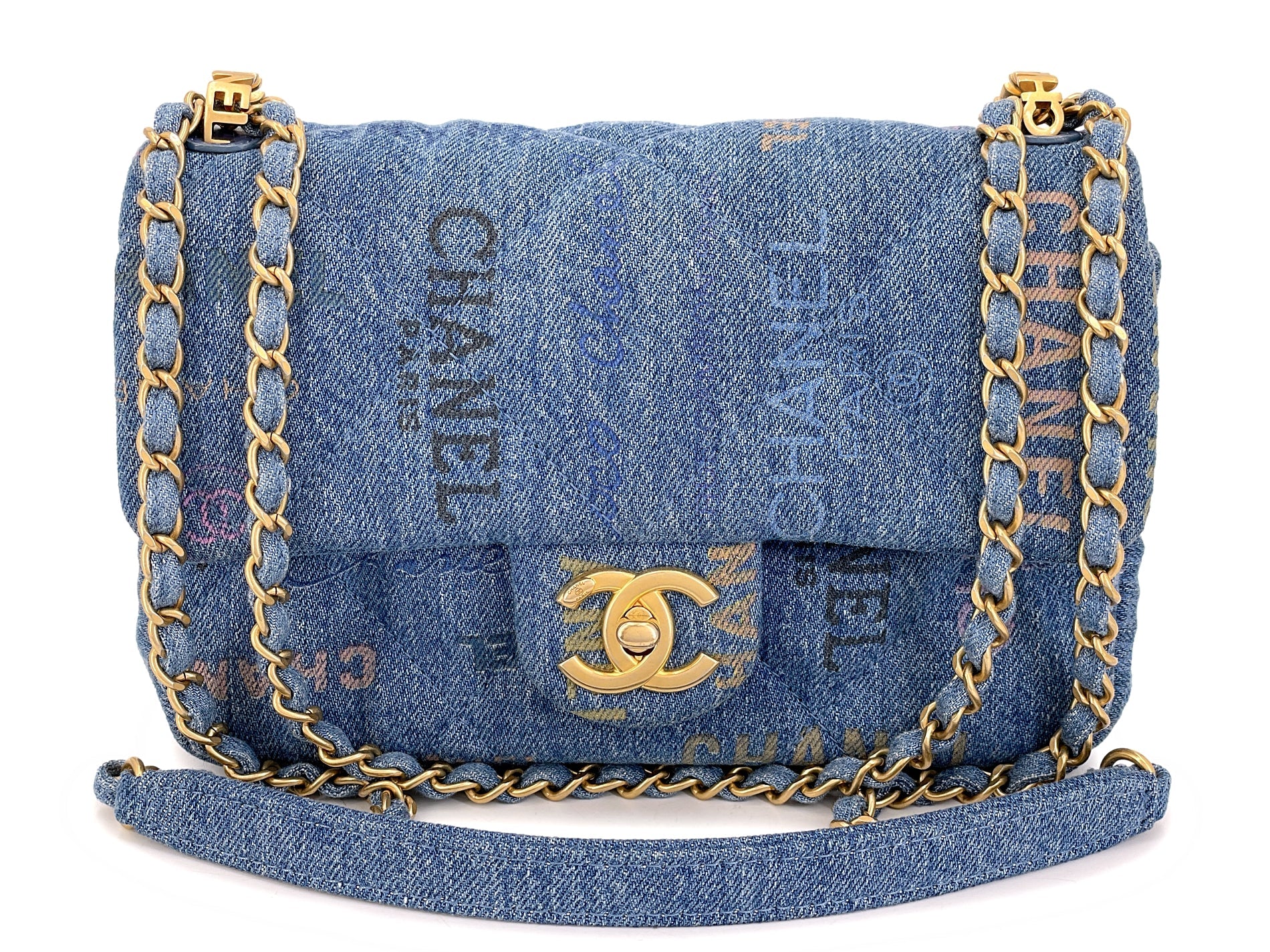 Blue quilted denim canvas and "logomania" type prints throughout the bag. Back pocket, crossbody chain with "CHANEL" grommets at top in brushed gold hardware. Interior lined in blue canvas.
