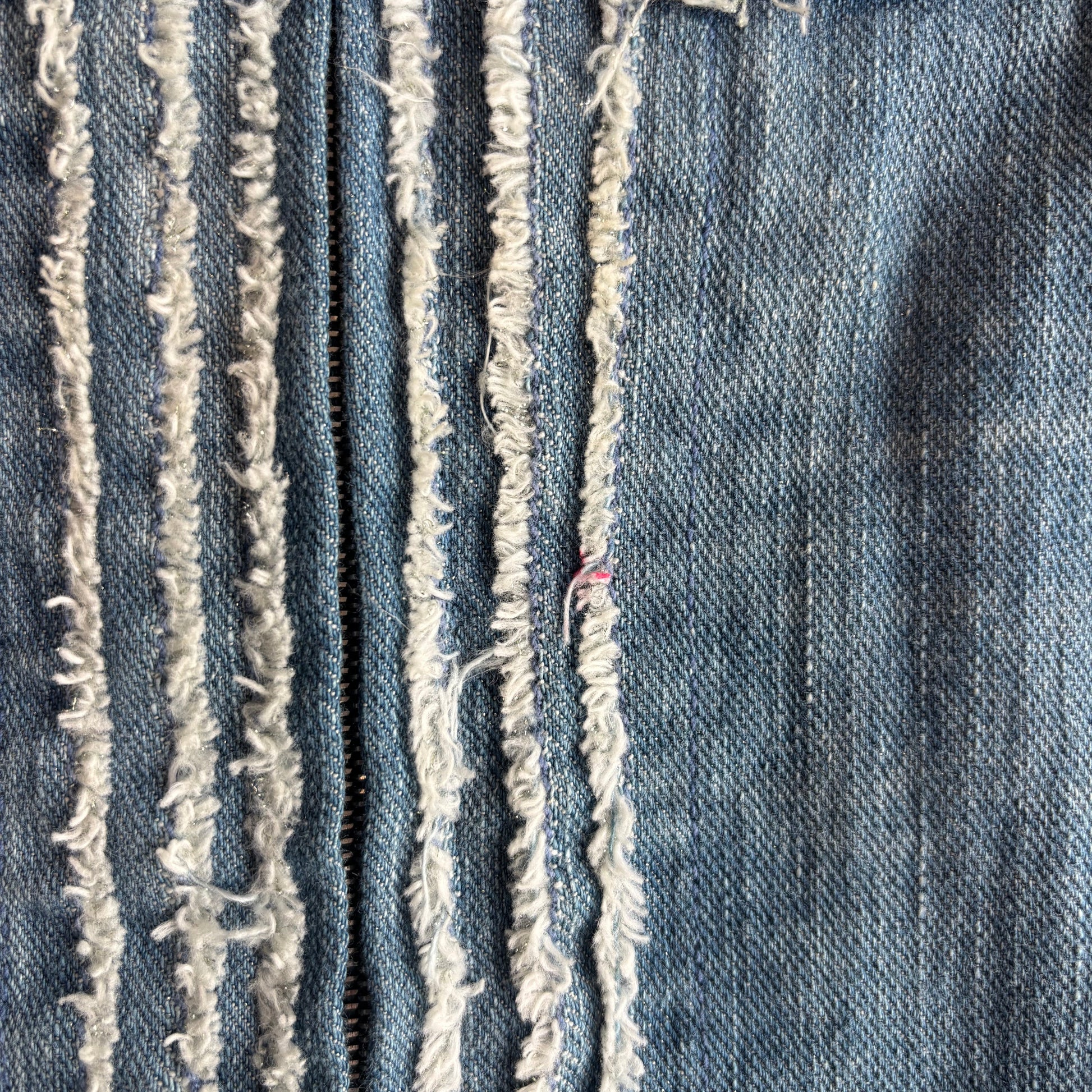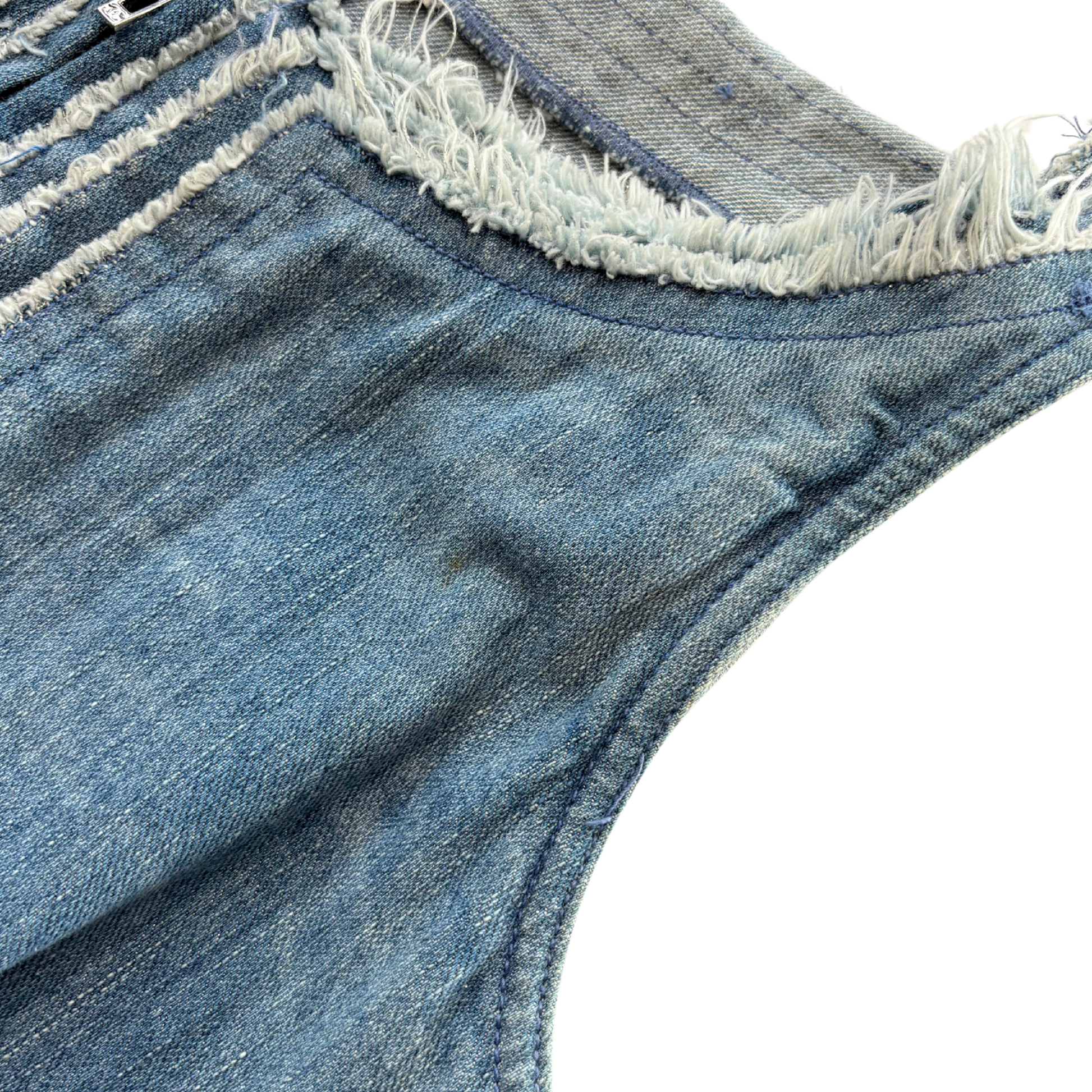 Chanel fitted sheath dress in pre-distressed mid wash stretch denim with subtle silver sparkle throughout. The dress has a two-way zipper down the front of the dress and pockets at the bust and hips. Features frayed raw hem detailing throughout and a small lion medallion on the left hip.