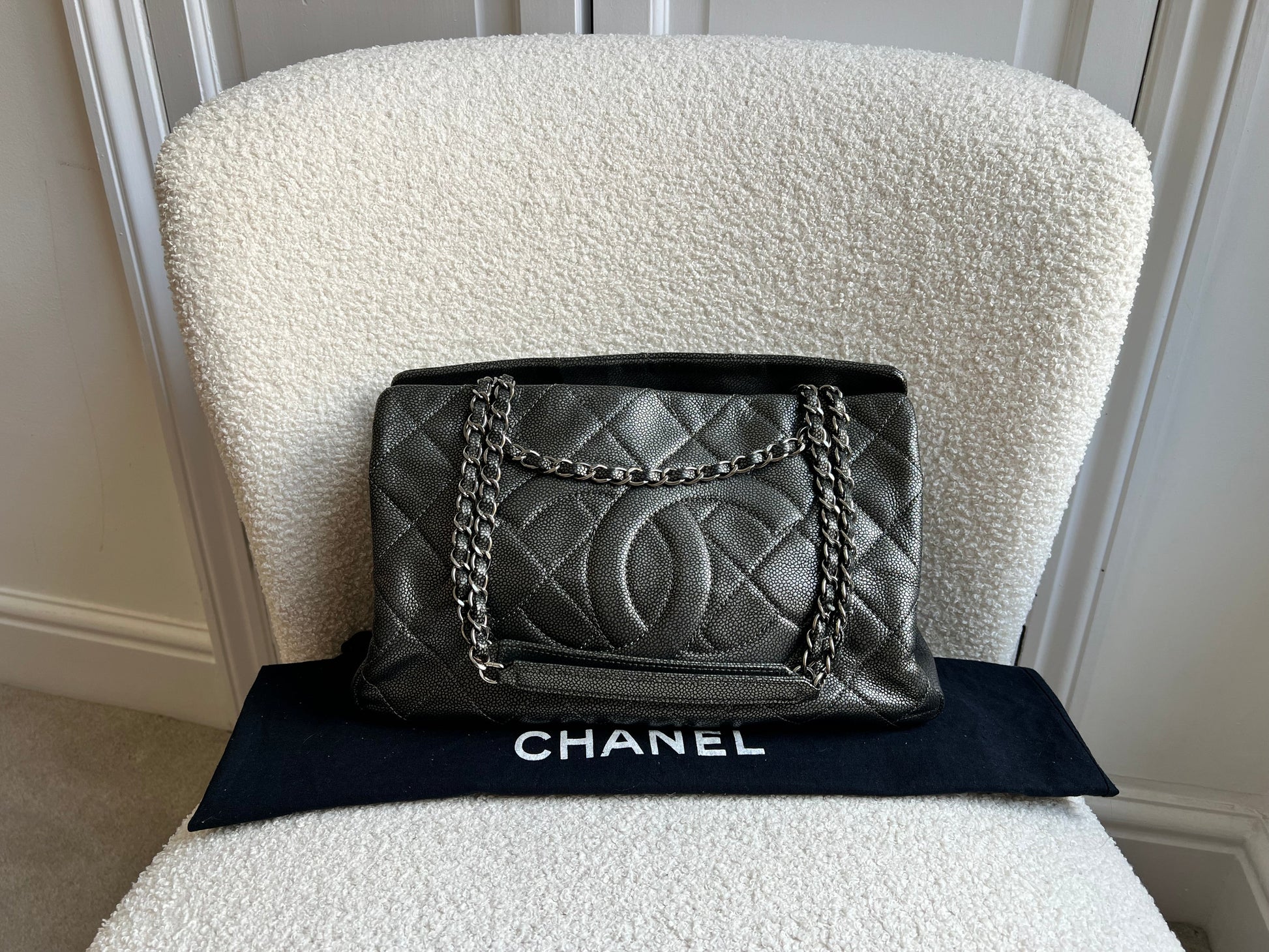 Chanel Tote in Bronze Quilted Caviar with silver hardware. This practical, slightly slouchy tote is ideal for day to day use and a good alternative to the GST style with a lower price tag. Medium in size, perfect for day to day use with the interwoven chain and leather straps with leather shoulder section. Fits over shoulder comfortably.