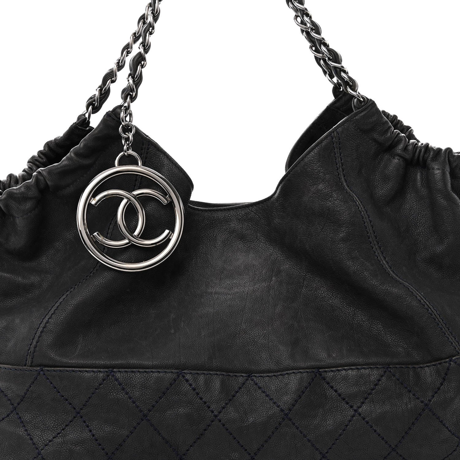It features silver chain link leather threaded strap handles with a diamond stitched bottom and a large polished silver circular CC charm. The top opens with magnets to a satin interior with zipper and patch pockets.