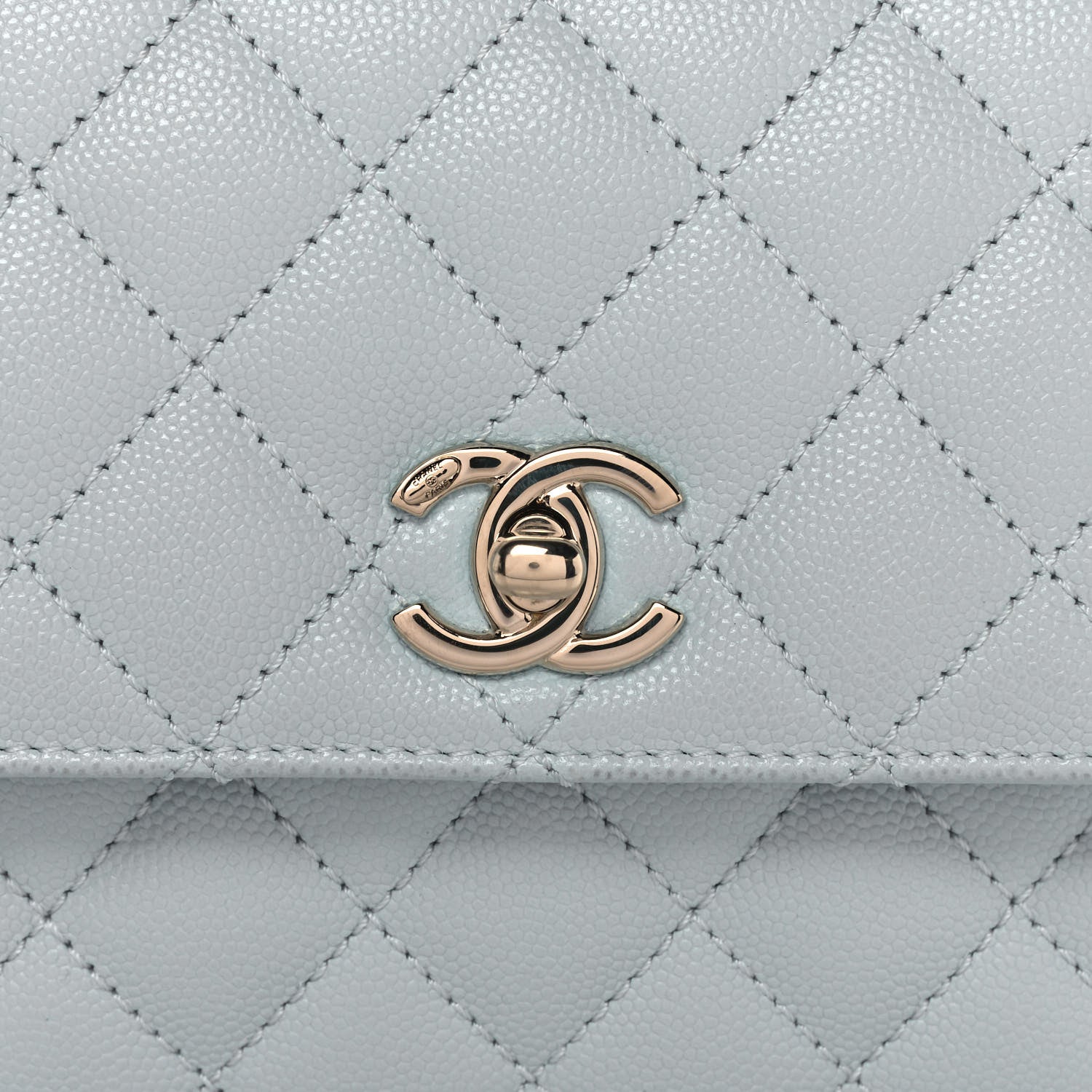 This Timeless and Elegant Chanel Coco Handle Mini Flap Bag is Crafted from Luxurious Diamond-quilted Caviar Leather in a soft light blue hue. It Features a structured silhouette with a rolled top handle, a light gold-tone leather-threaded chain shoulder strap, and the iconic CC turn-lock closure.