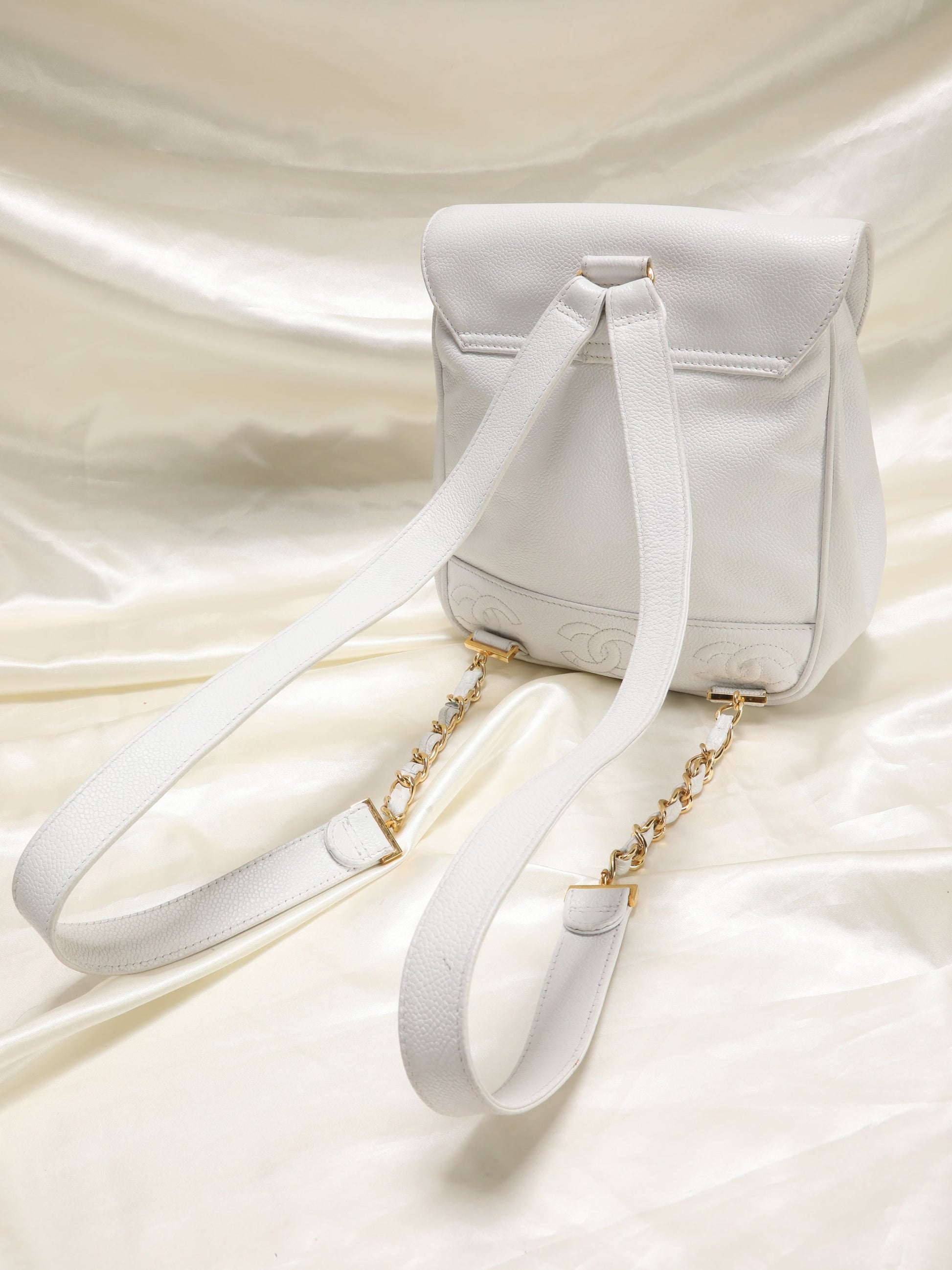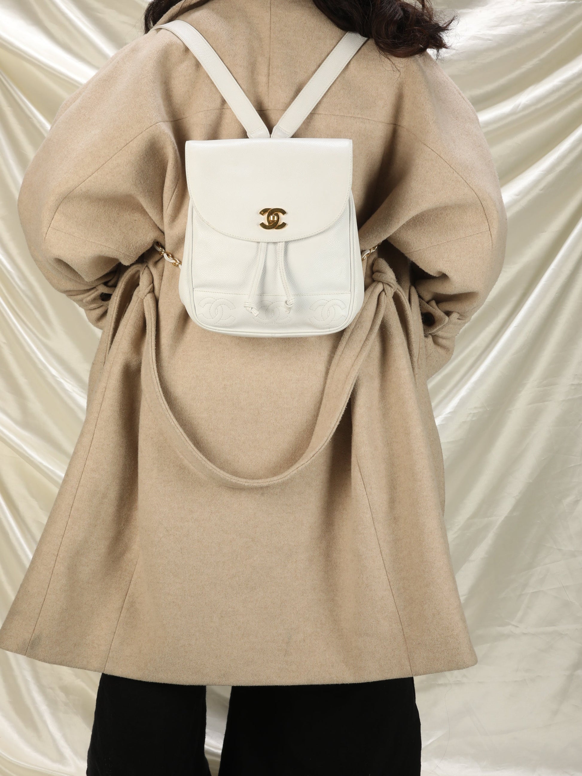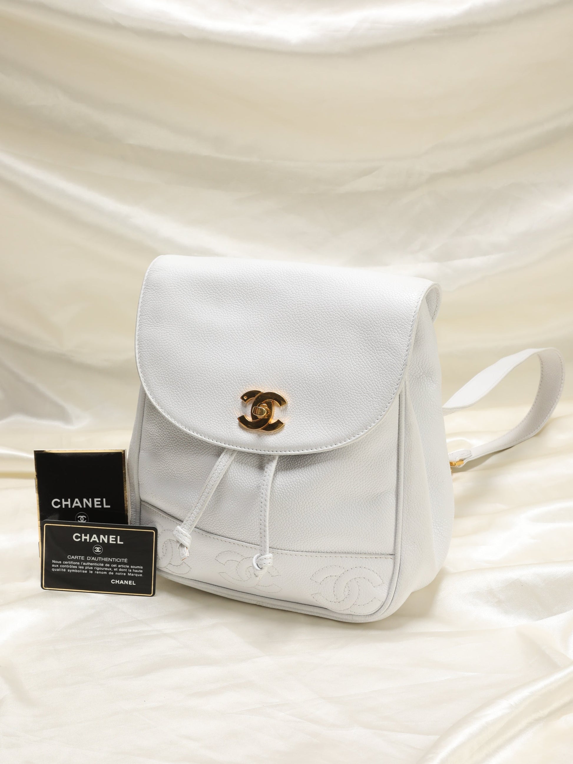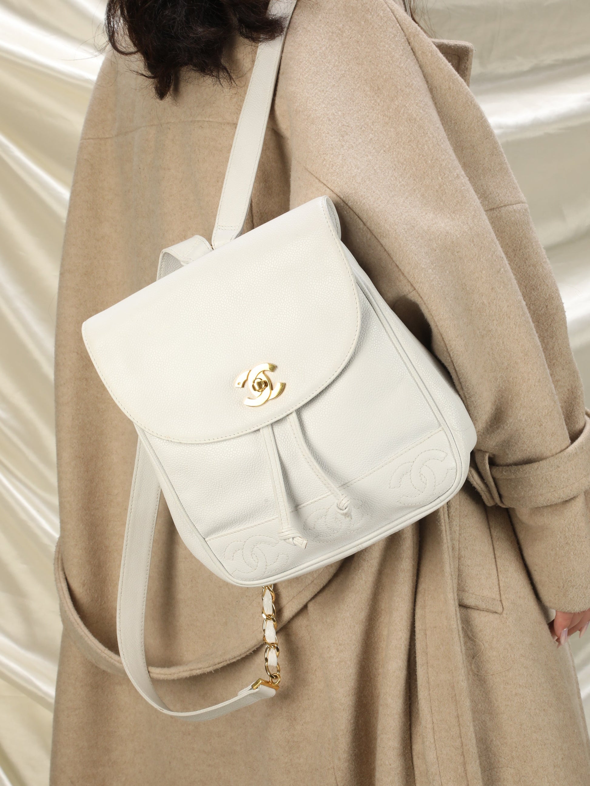Bringing to the shop a rare snow-white??¨Chanel caviar backpack! XL??¨24k plated gold cc logo. Timeless CC logos embossed on bottom of bag. Drawstring bucket for easy access. Perfect for festival season or travel! Spacious interior. 24k gold plated chain straps. Backpack currently going online for $3300-$6000.