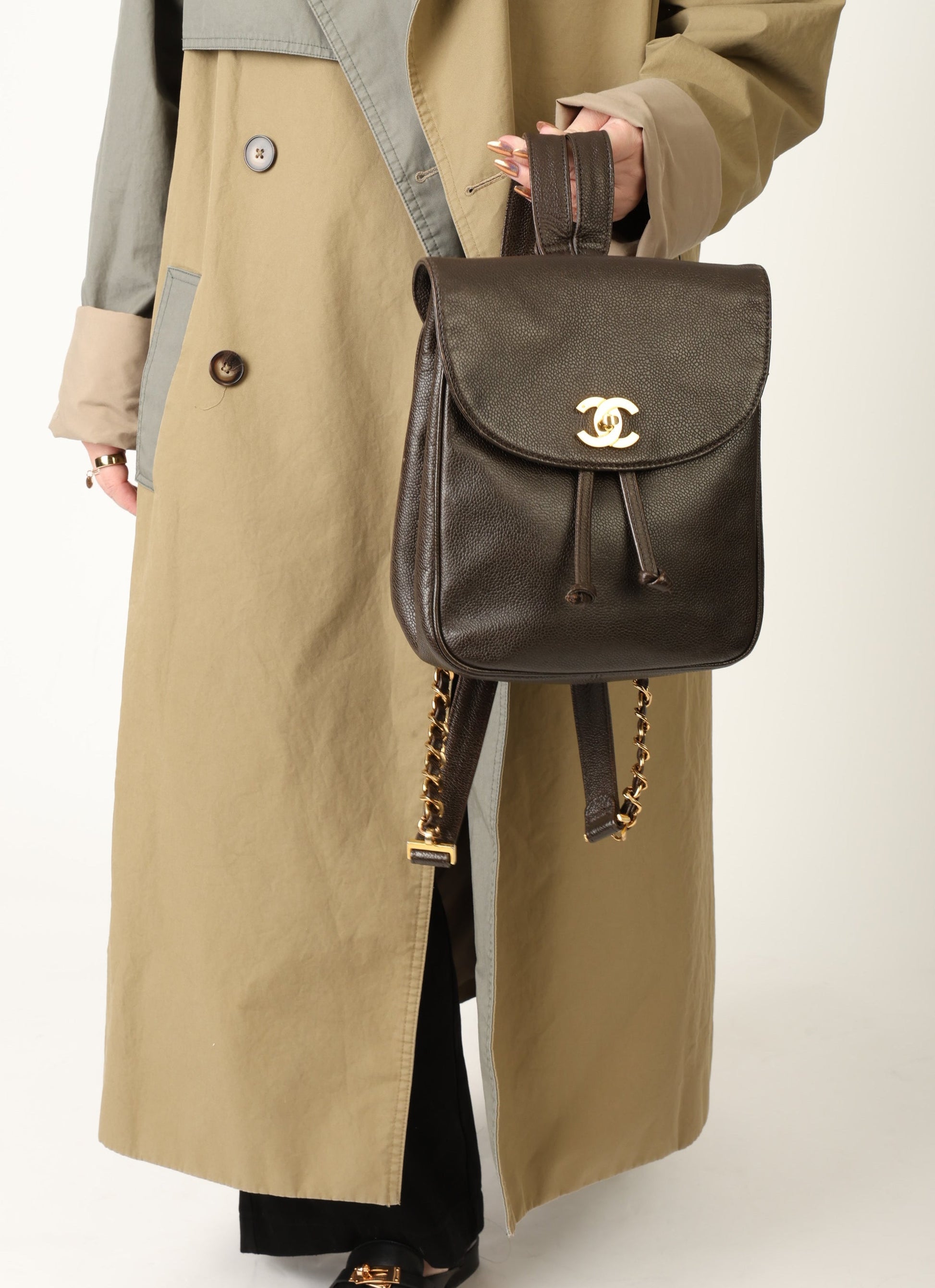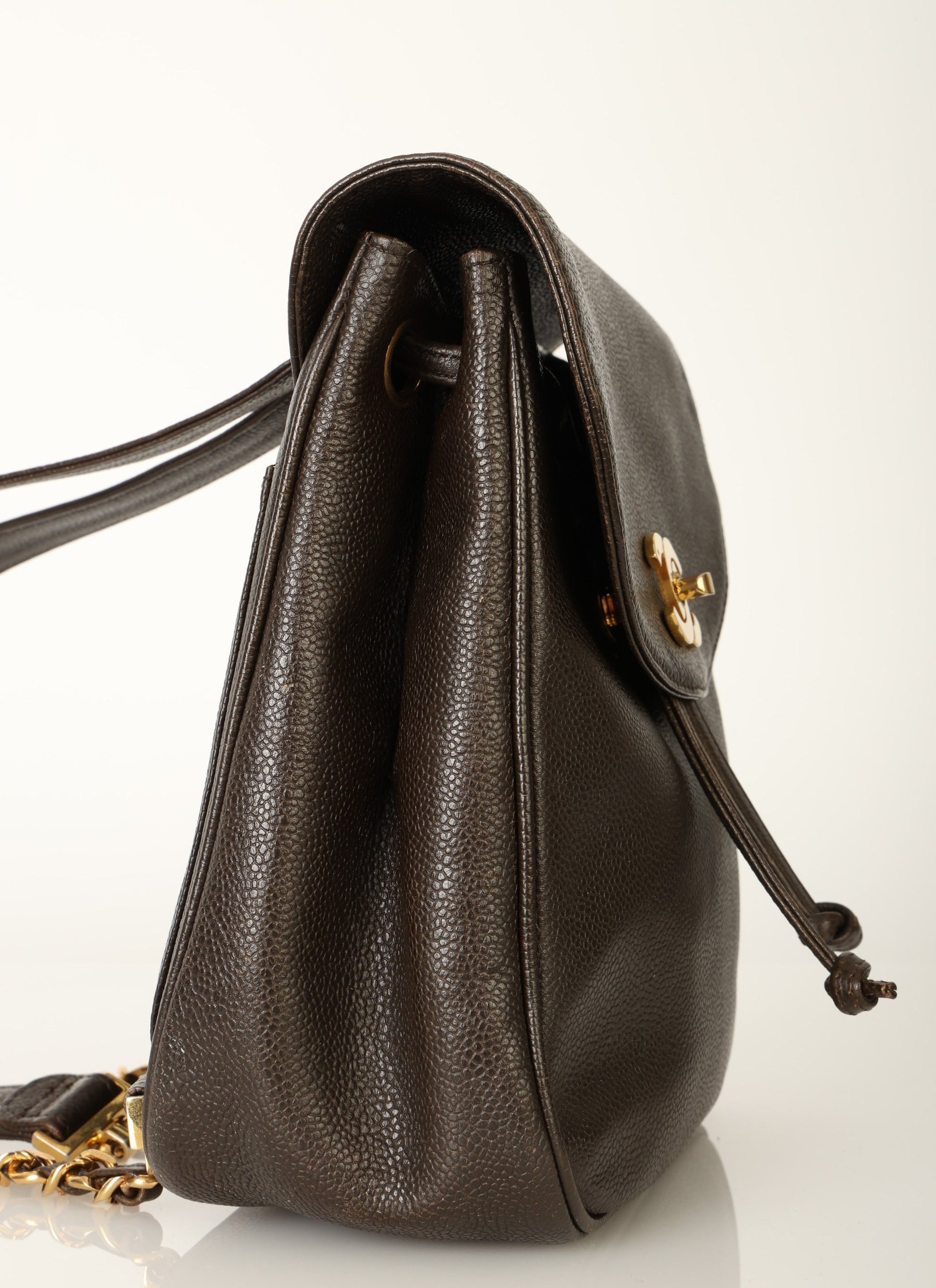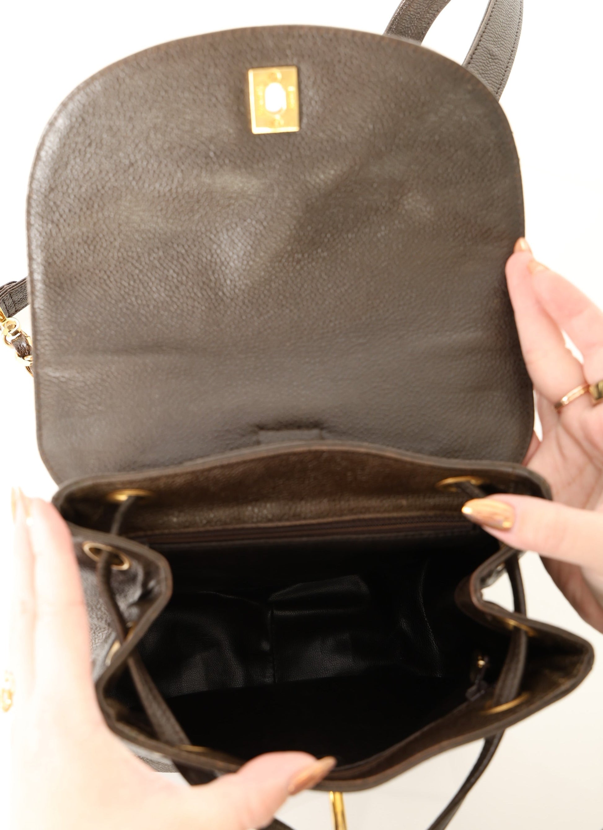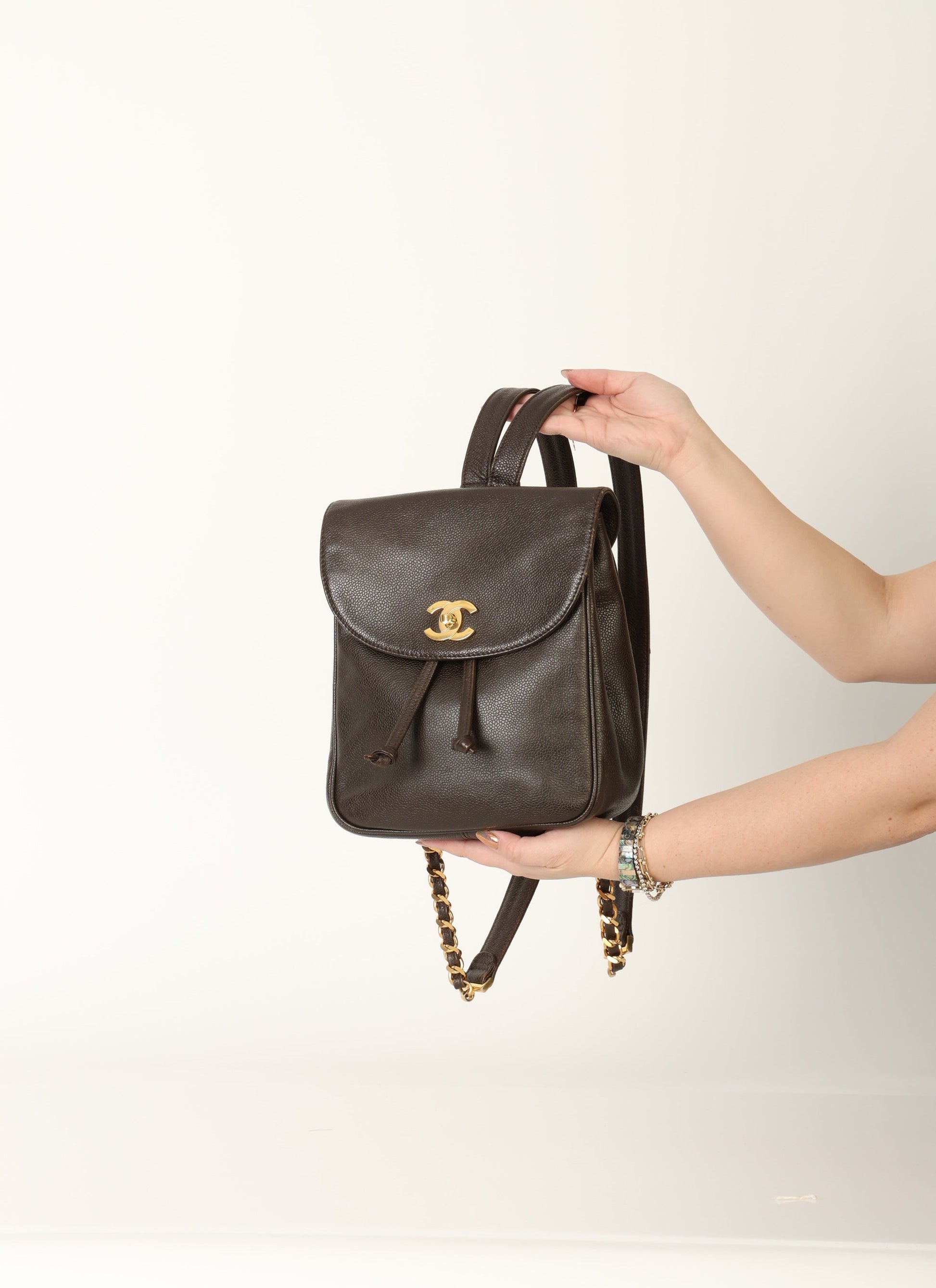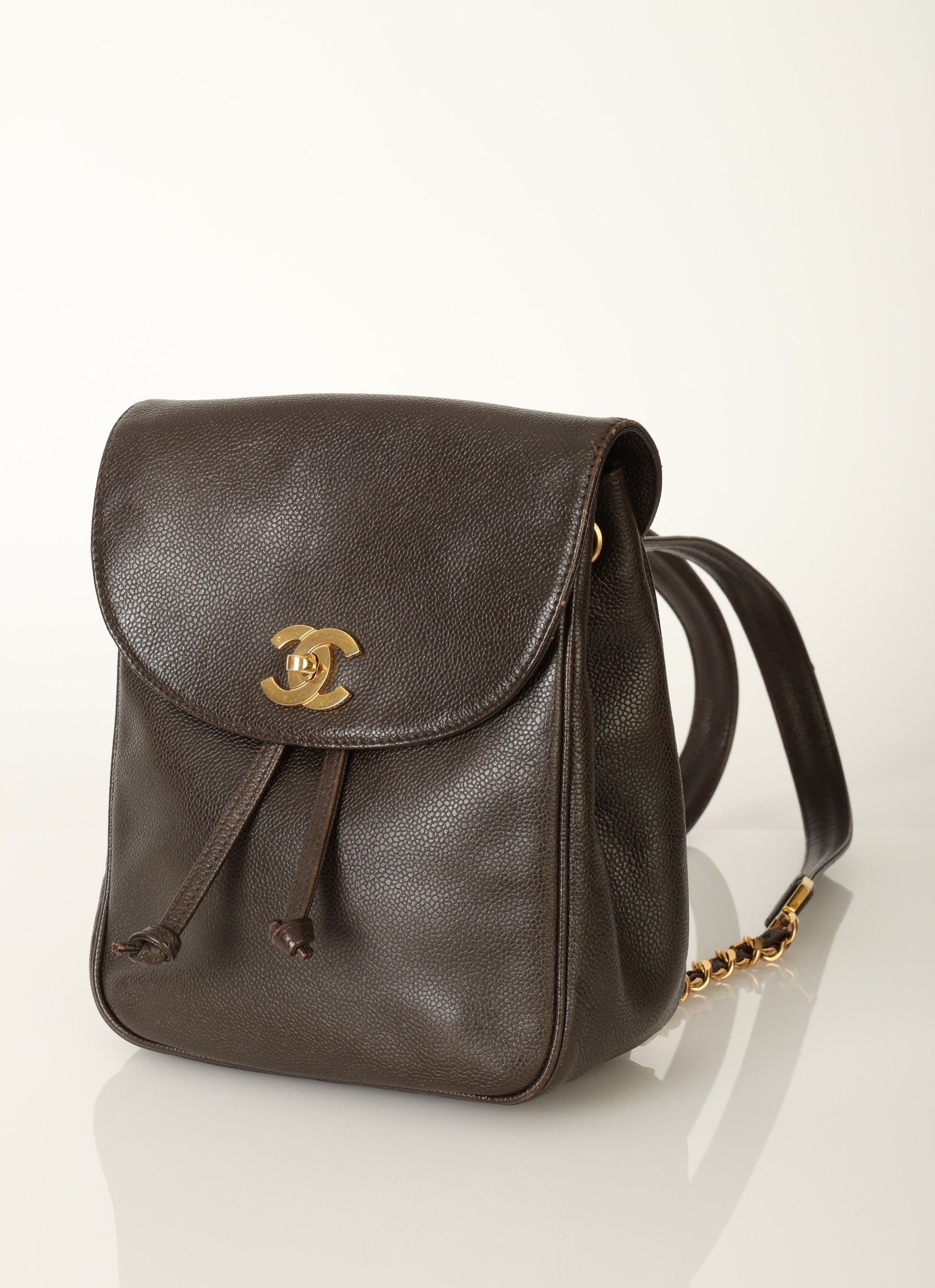 Dropping in the shop is a stunning Chanel Caviar Turnlock Backpack in a deep brown with 24k gold plated hardware.?ÿPerfect for travel or festival season! Features a drawstring closure and CC turnlock for added security. You can fit?ÿyour iPad Mini/Kindle and the rest of your daily essentials.?ÿ
