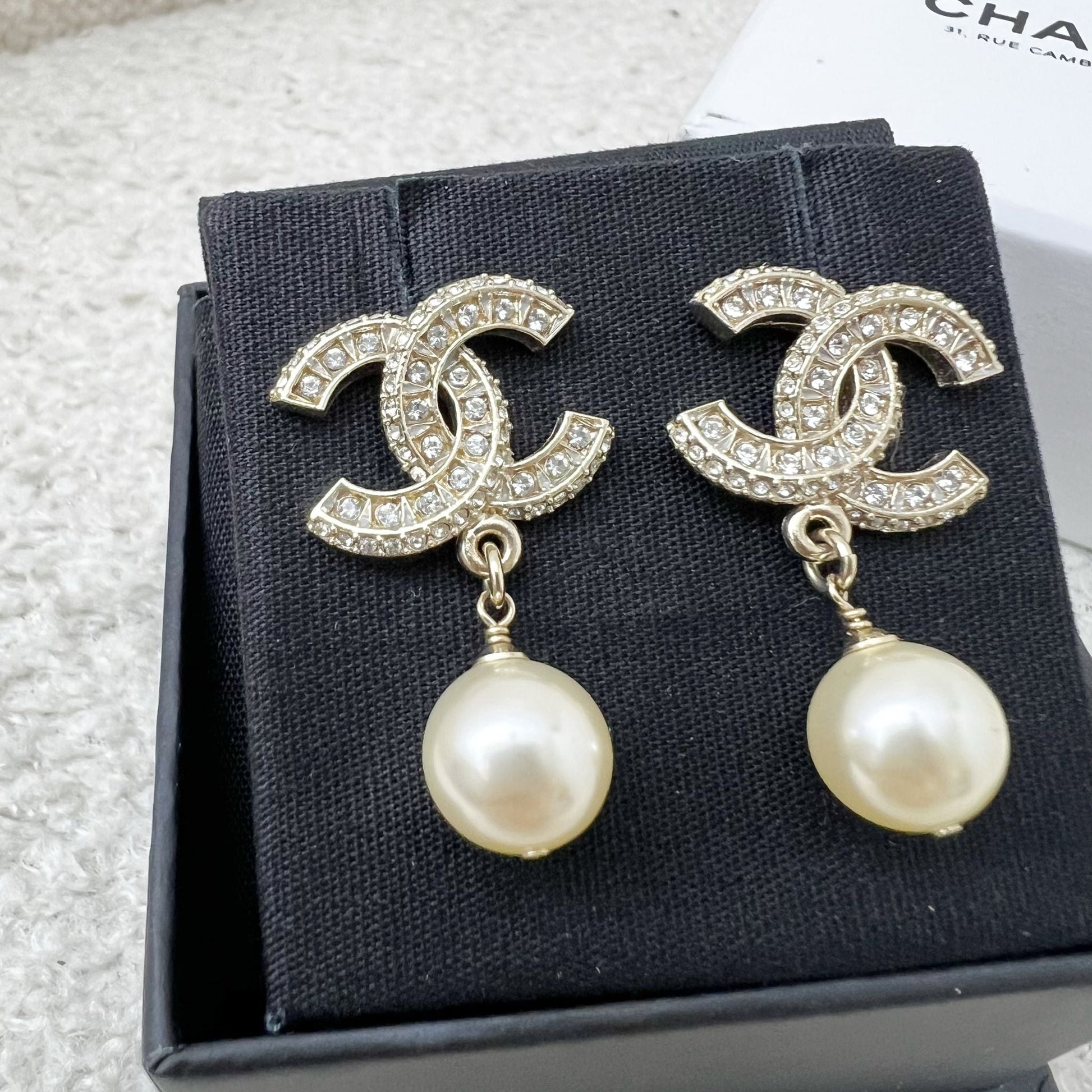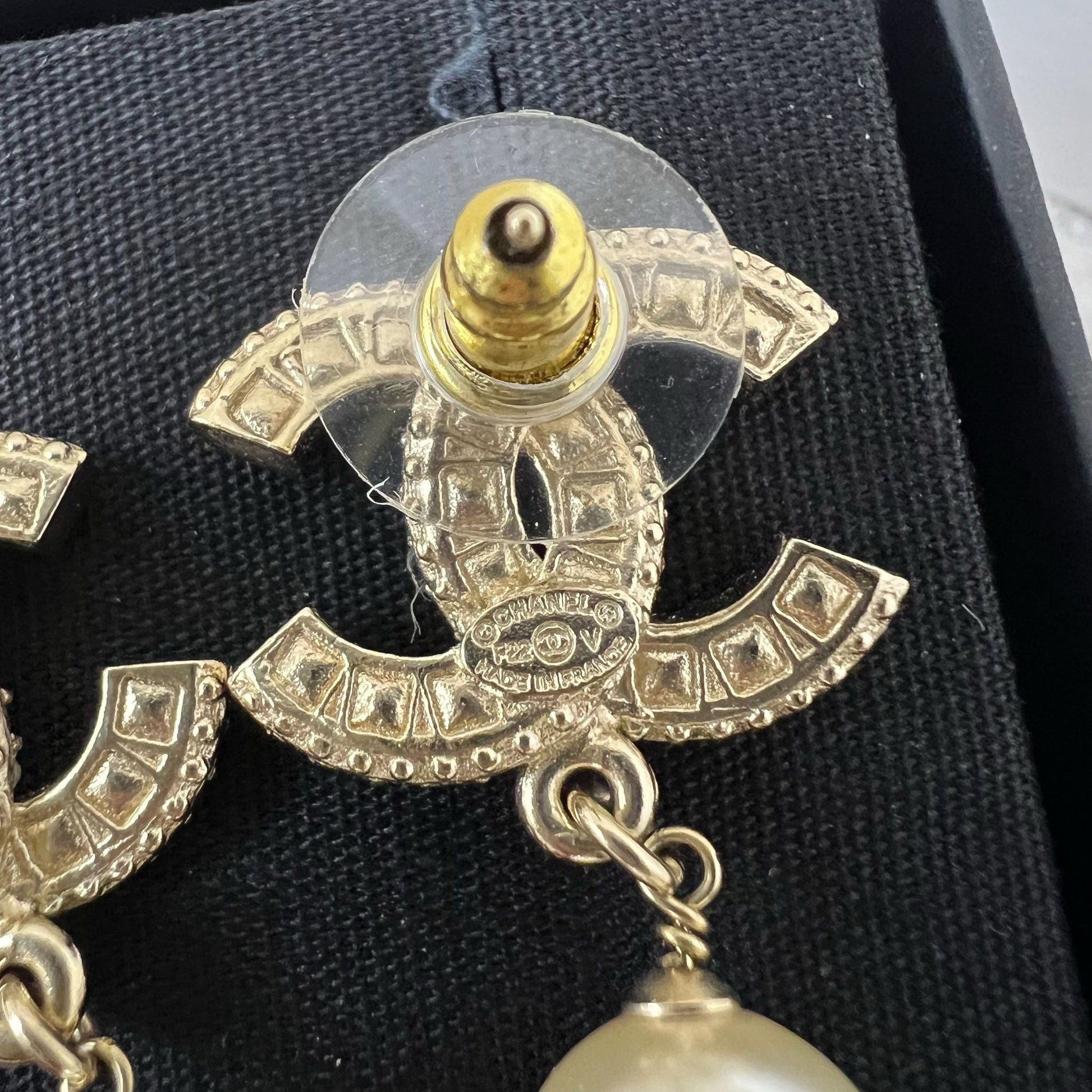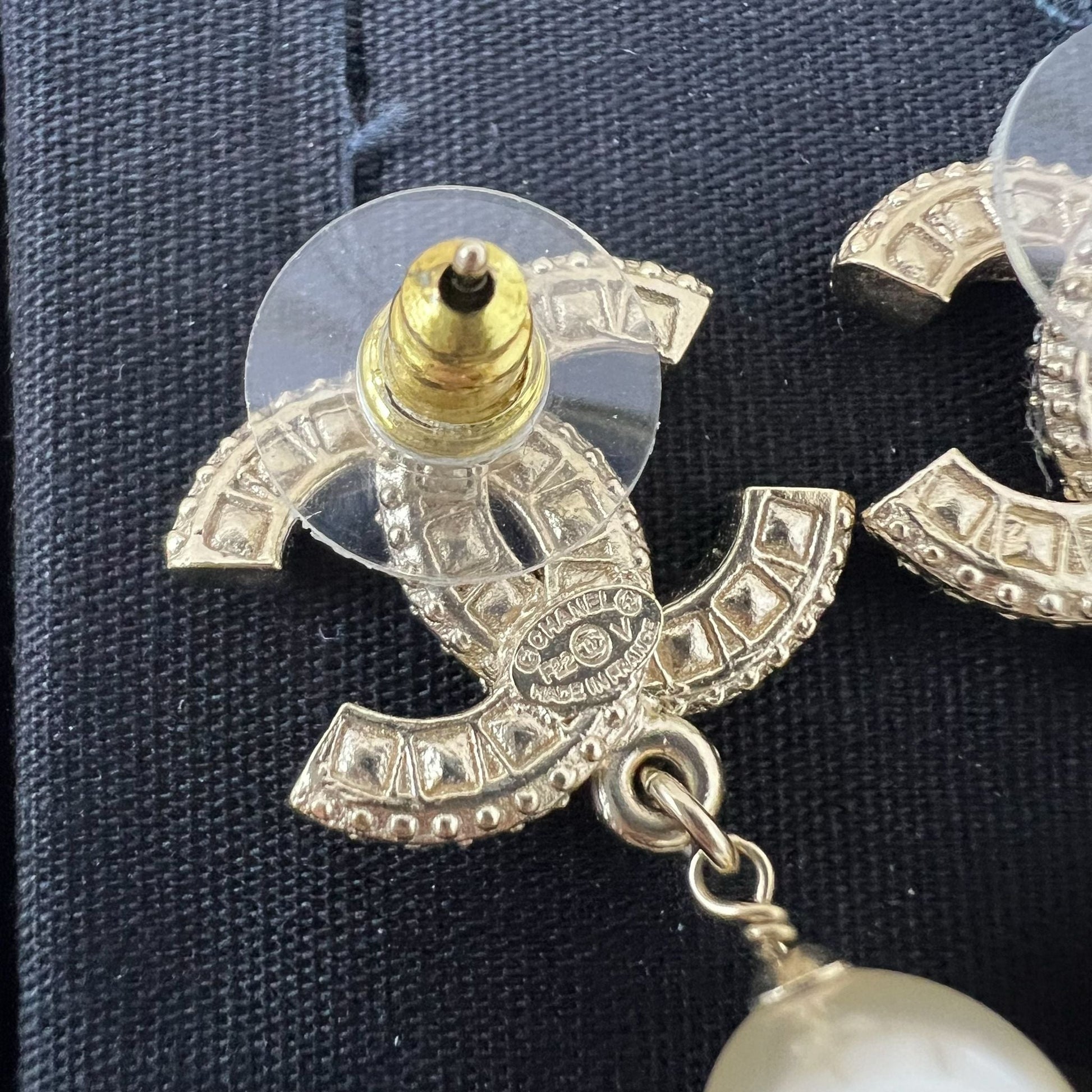 Chanel Classic CC Logo Dangling Earrings with Crystals and Pearls LGHW