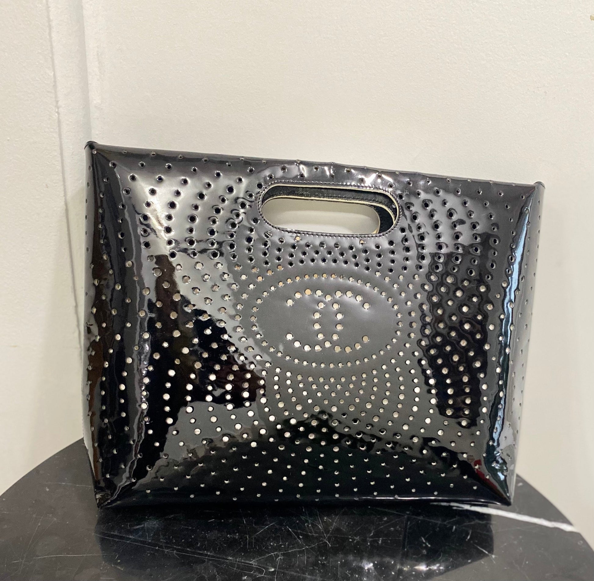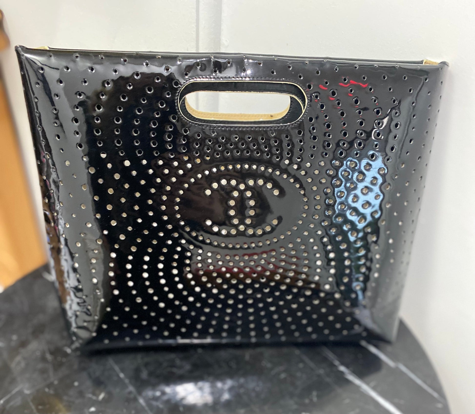 CHANEL CC PERFORATED PATENT CLUTCH BAG