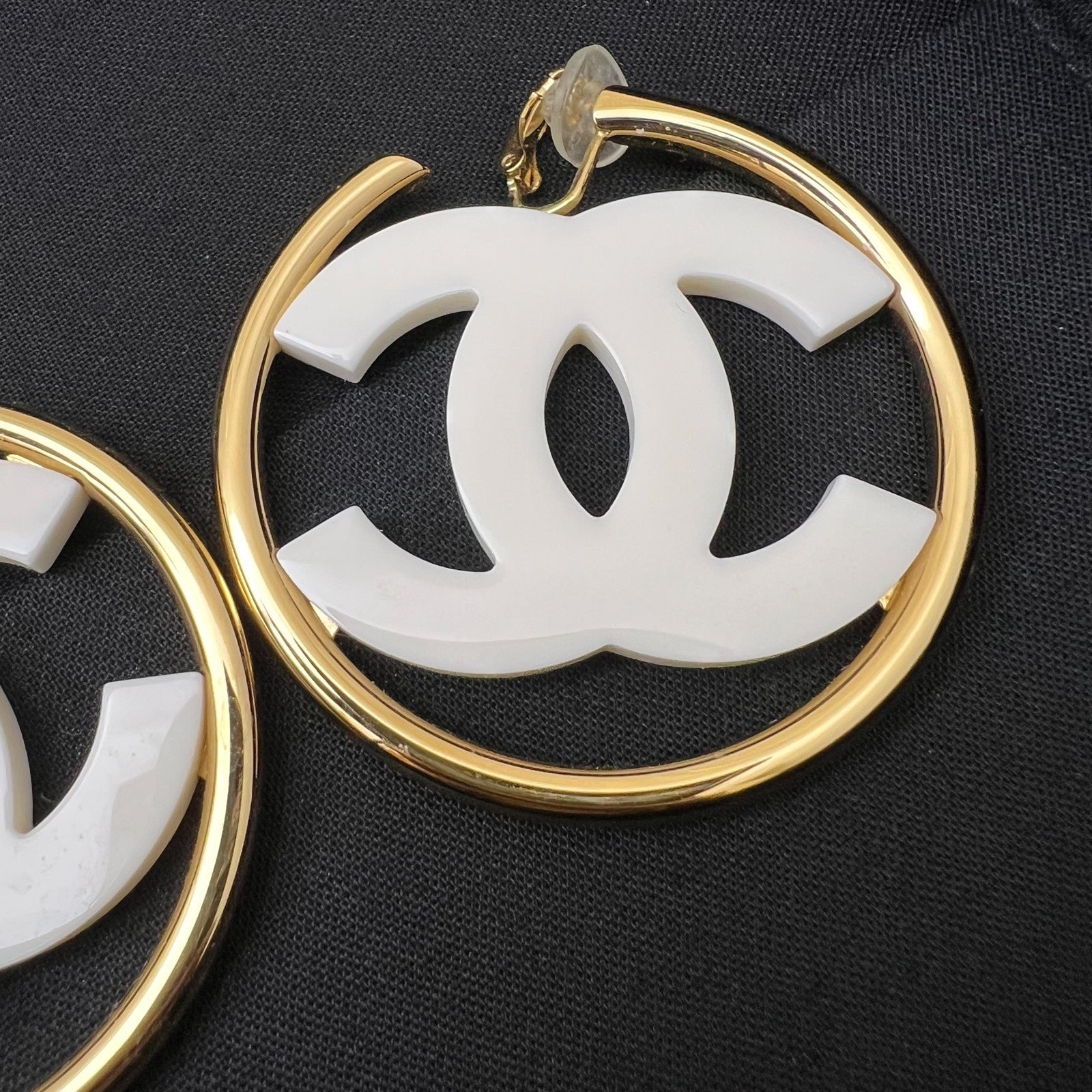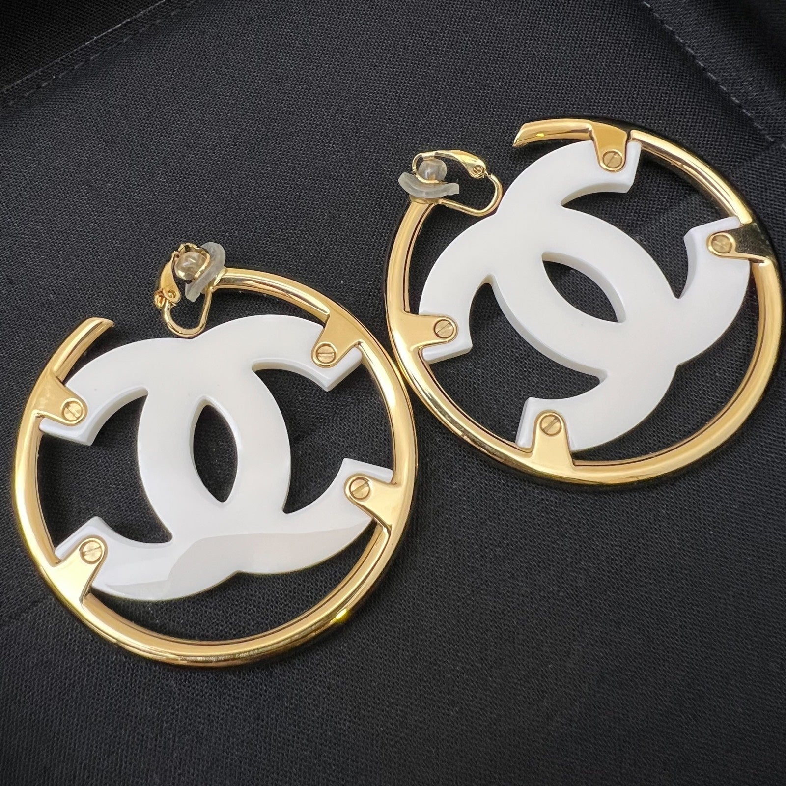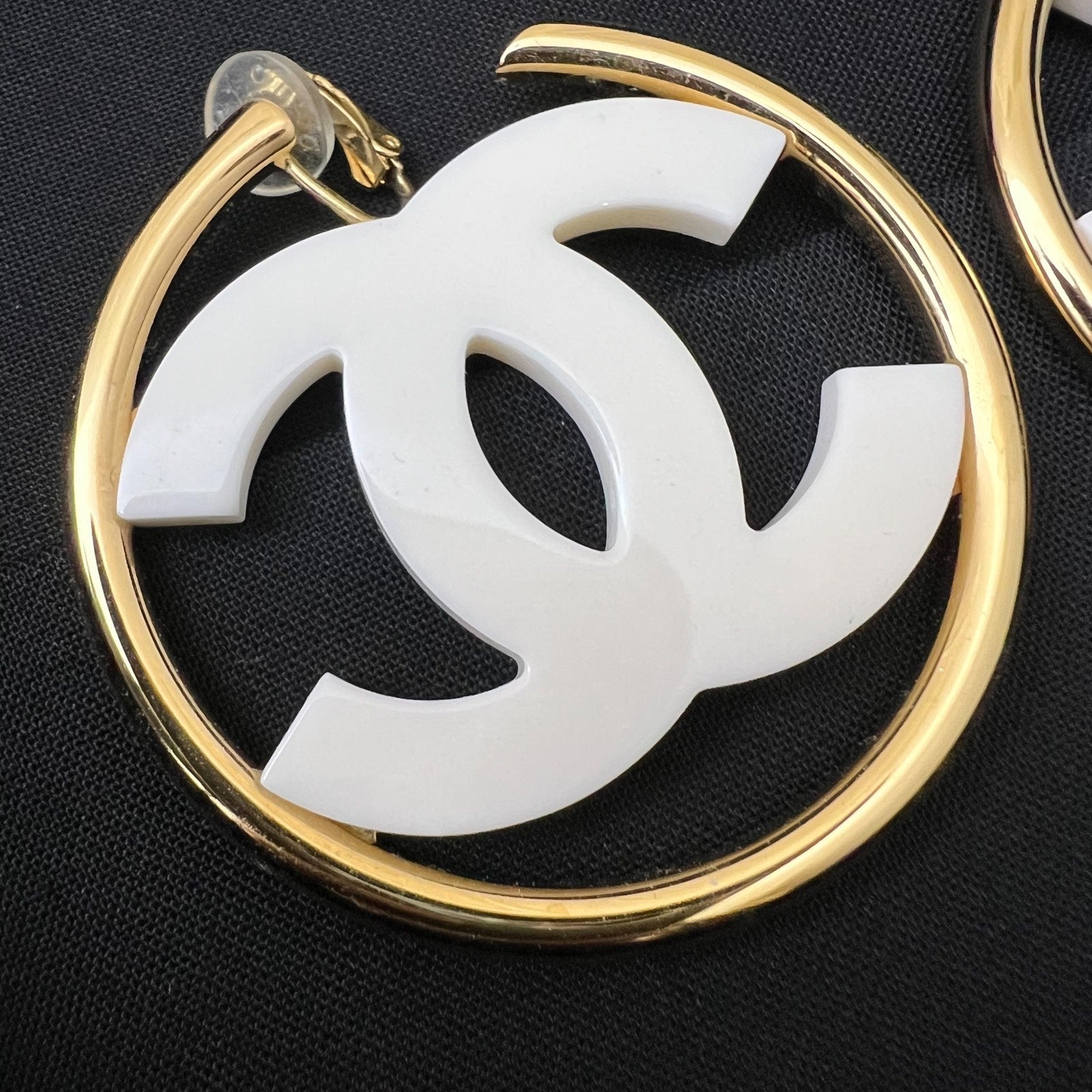 Chanel 24S Large CC Logo Hoop Clip-on Earrings with White Enamel in GHW