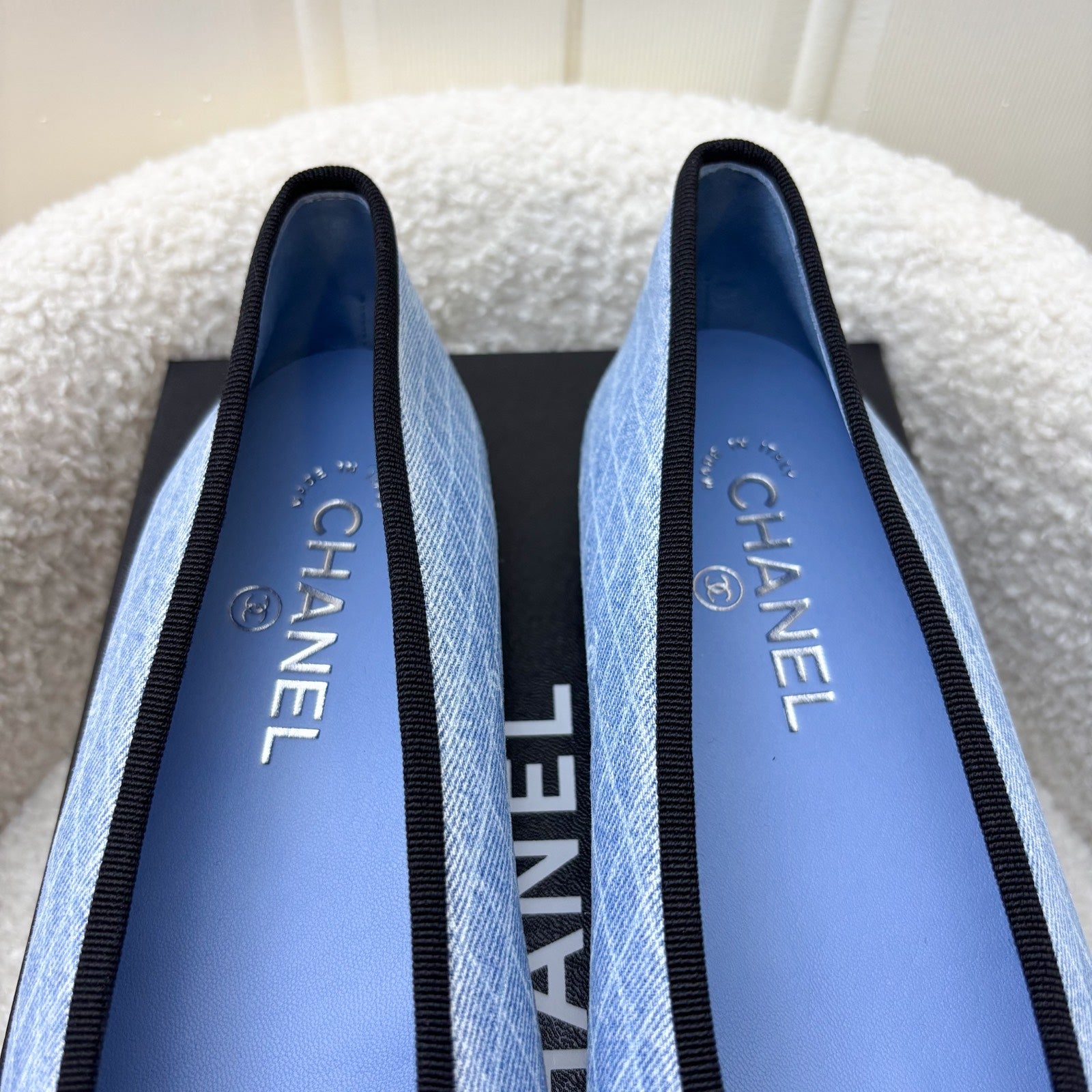 Chanel Classic Ballerina Pumps in Embroidered Light Blue Denim / Black Gosgrain Sz 37.5