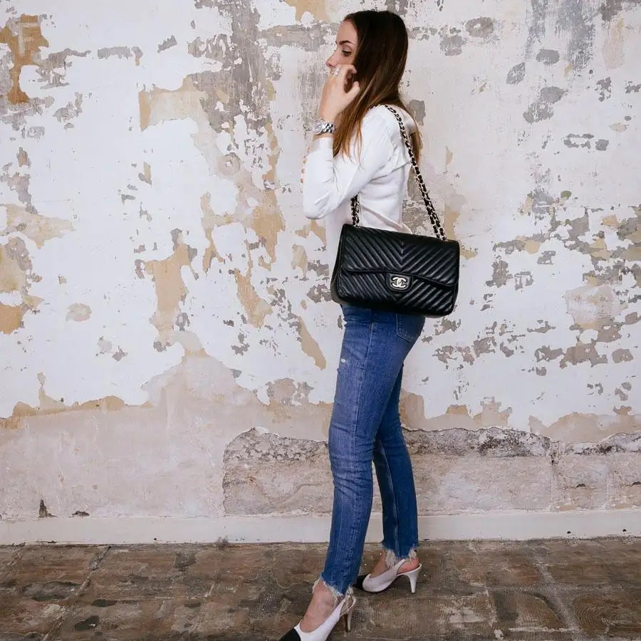 Chanel’s Jumbo Black Lambskin Classic Double Flap is a timeless bag that is Chevron-Quilted in this version! It’s paired with silver-tone hardware in the logo turnlock that opens the first flap which has a zippered pocket on its underside and a slide pocket beneath it. The second flap is logo-stitched on its underside and unsnaps to a slide pocket on the face and two slide pockets in the black-leather interior, while an additional slide pocket rides the bag’s back face.