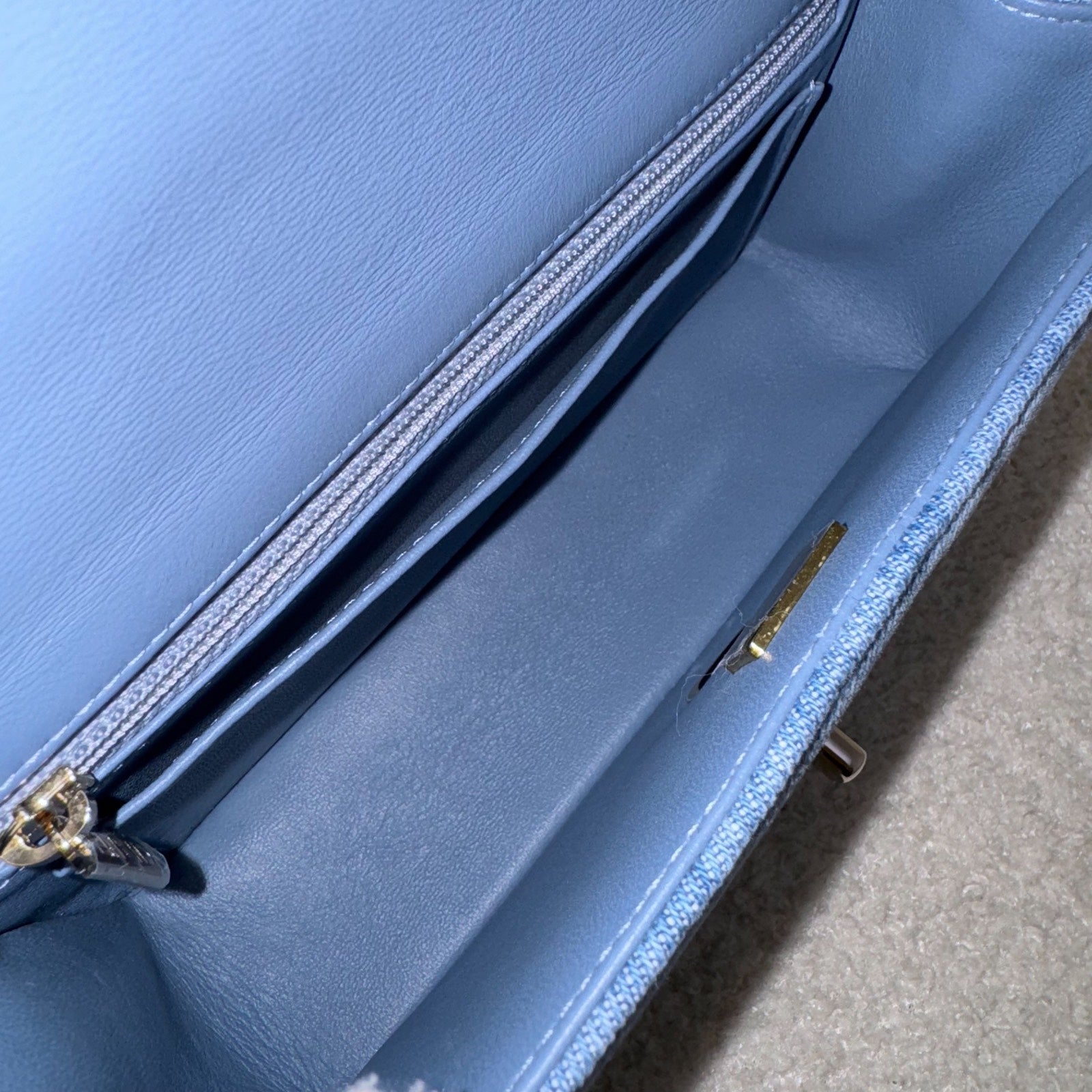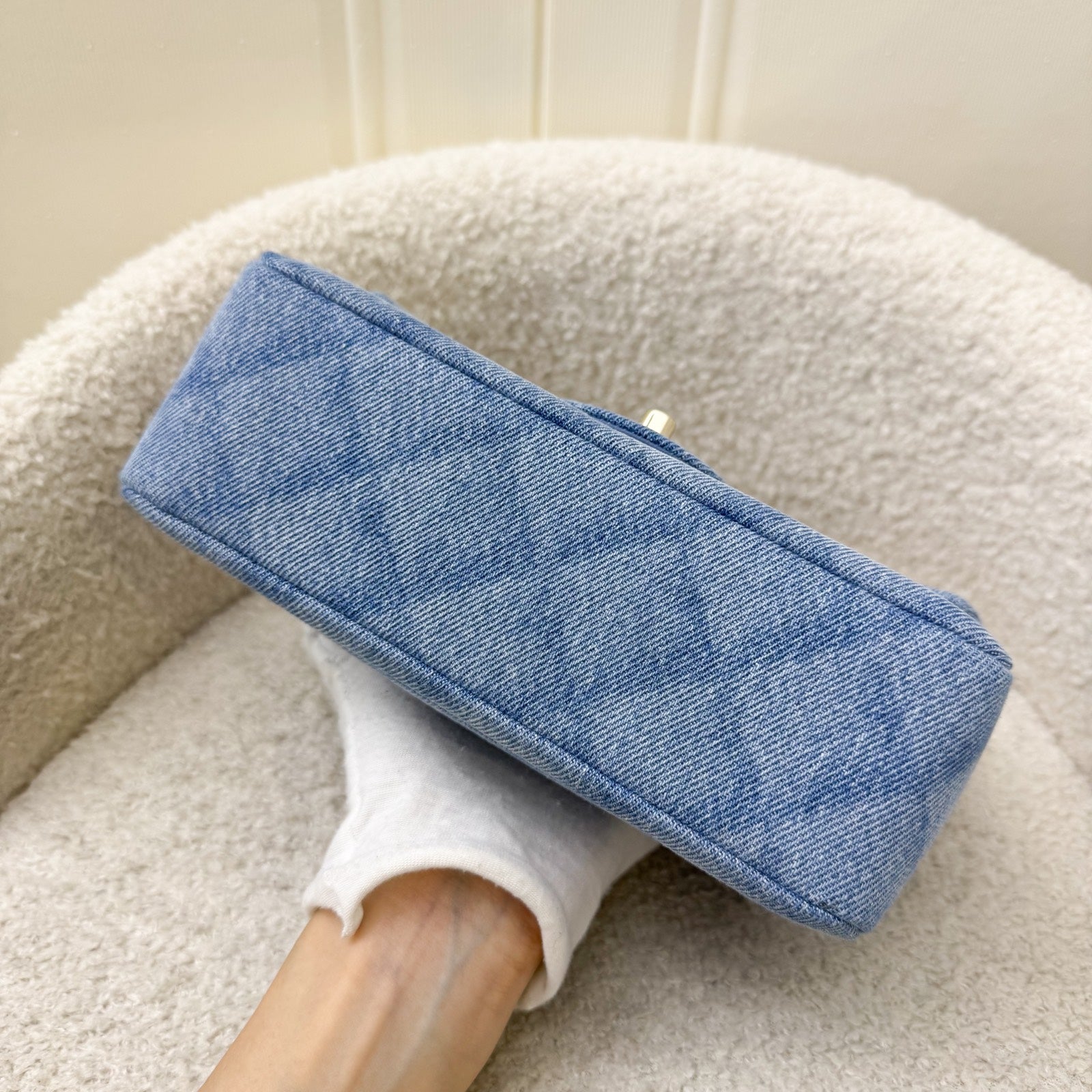 Est. Retail: About 7k. Prettiest light blue shadow denim with light Gold hardware from the 22B collection, Highly sought after colour and style!