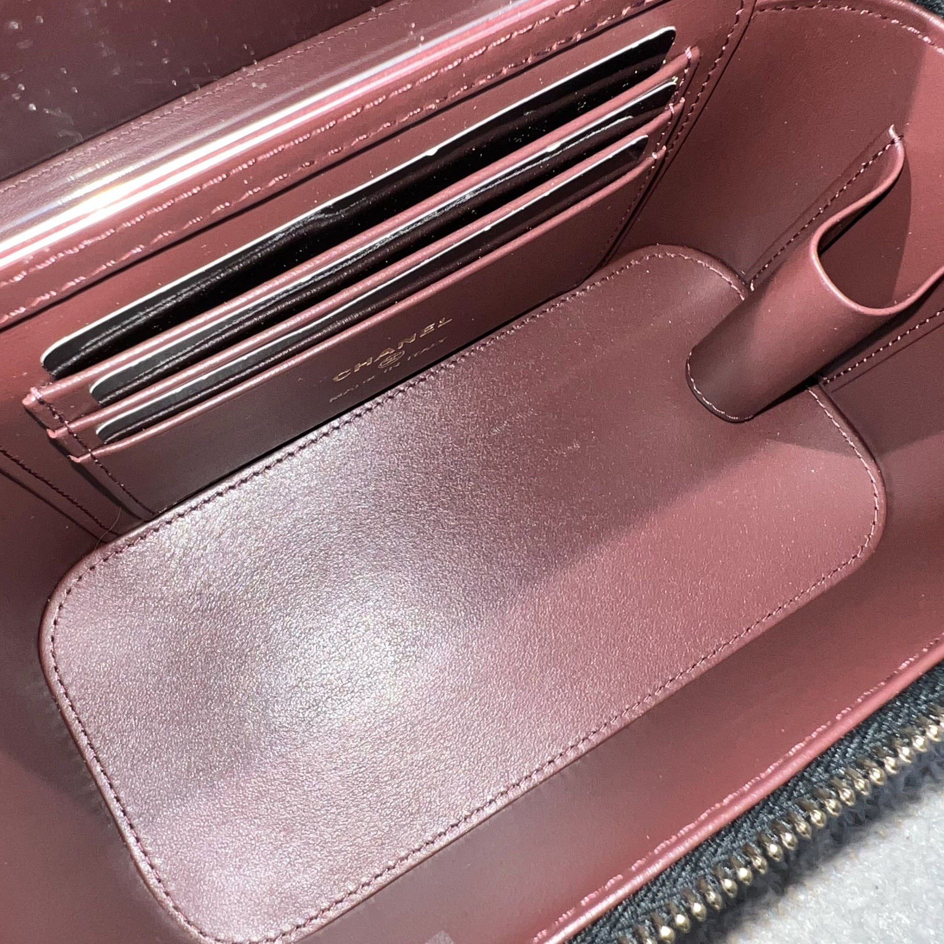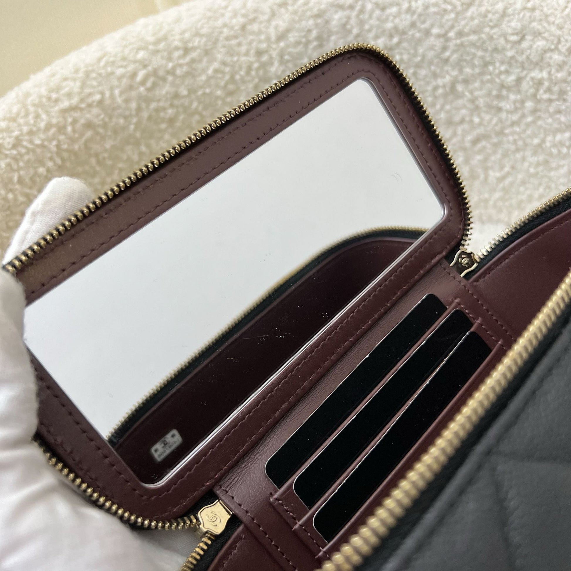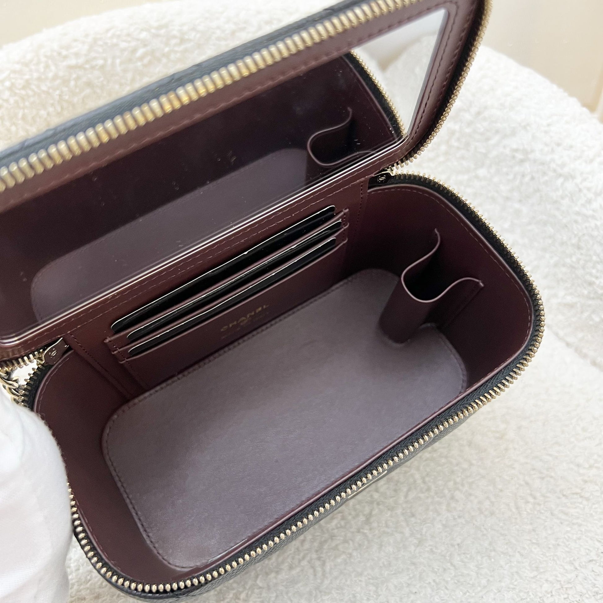 Super popular small vanity case in the most popular black caviar. With a cute mirror inside. Very functional and can fit as much as a Rectangle Mini. Get a bag at the price of an SLG!