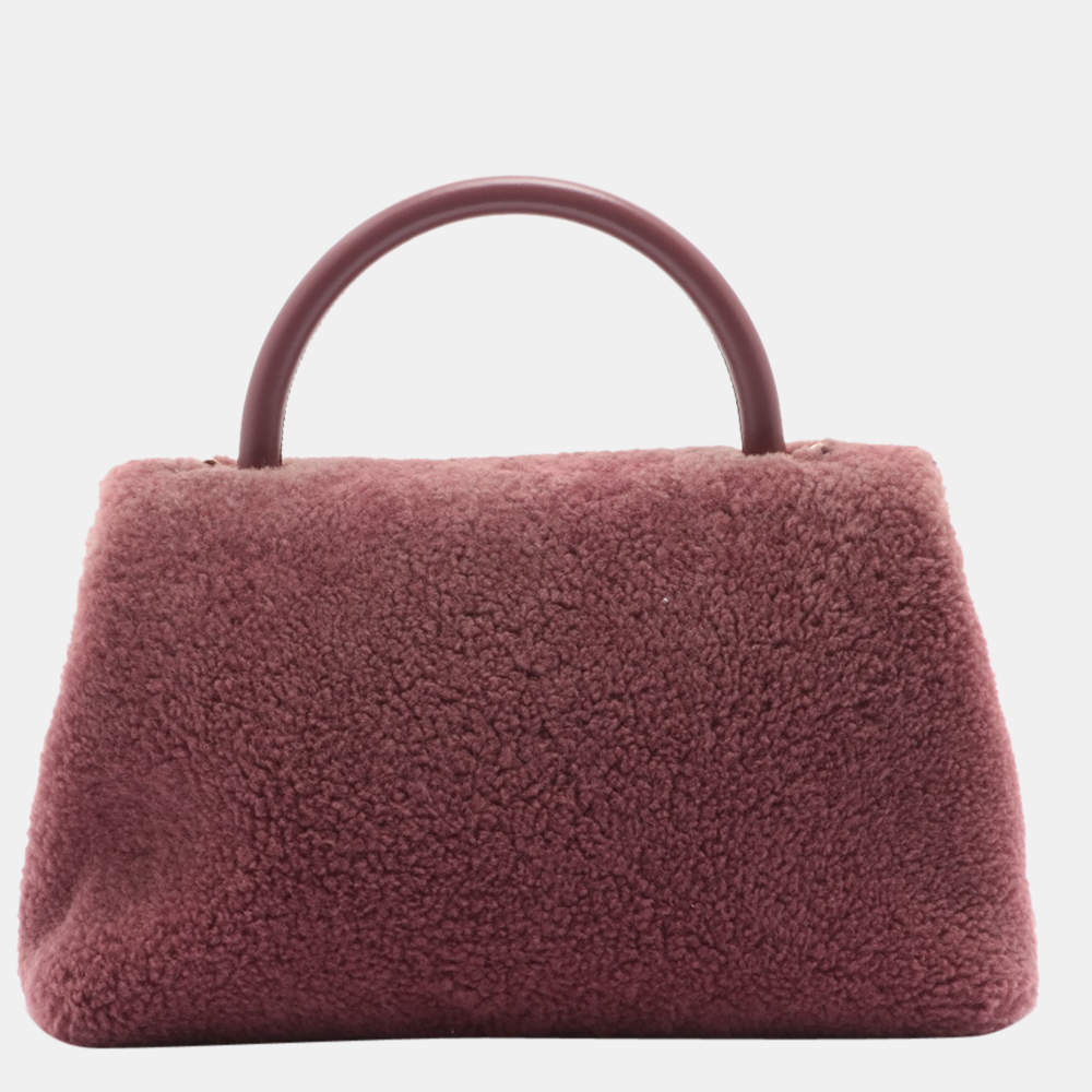 Shearling Lambskin Small Coco Handle Flap Pink. This chic tote is crafted of shearling wool in dark pink. The shoulder bag features a sturdy leather top handle, an aged gold chain link leather threaded shoulder strap with a shoulder pad, and an aged gold CC turn clock closure. This opens the flap to a partitioned matching fabric interior with a zipper pocket, patch pockets and a central dividing compartment.