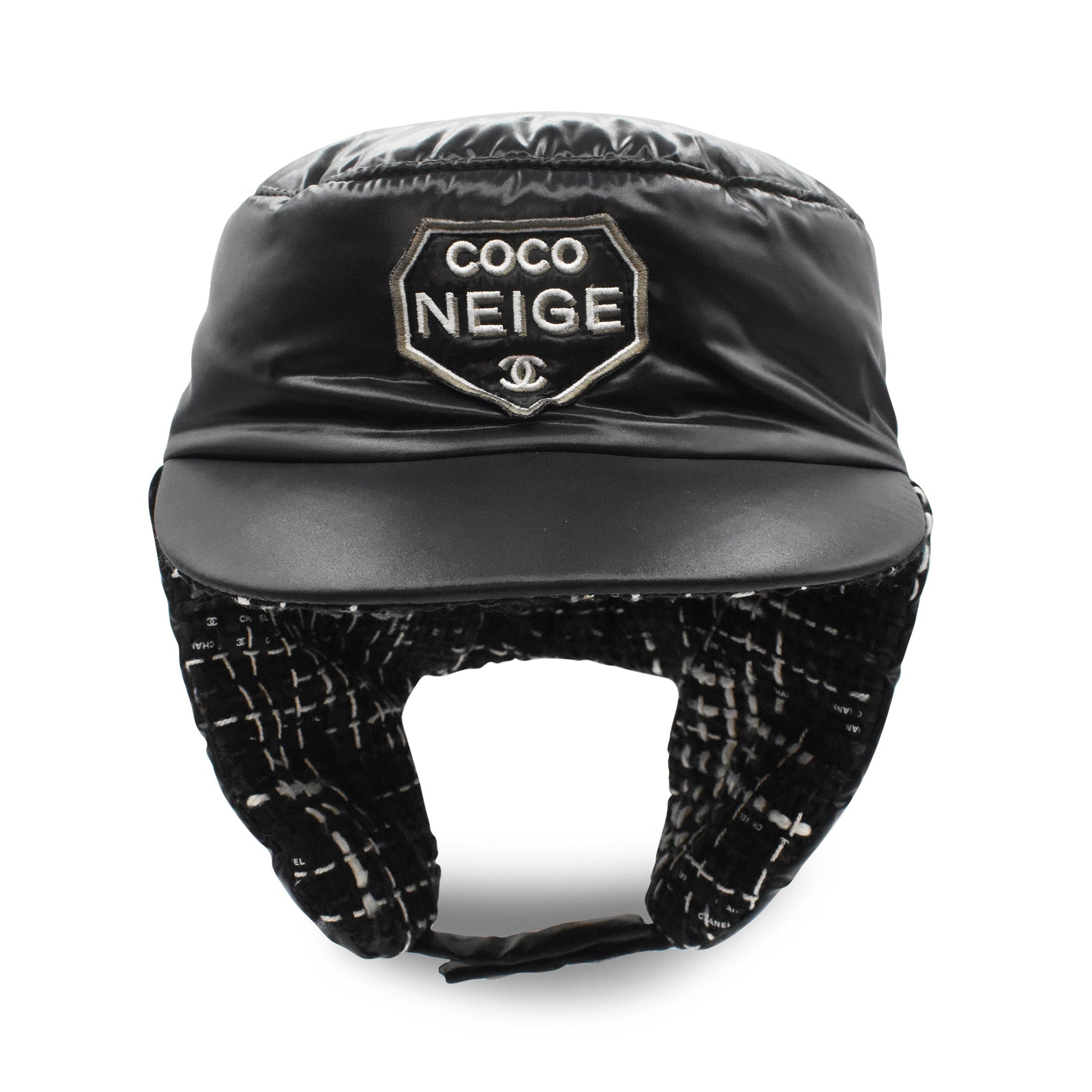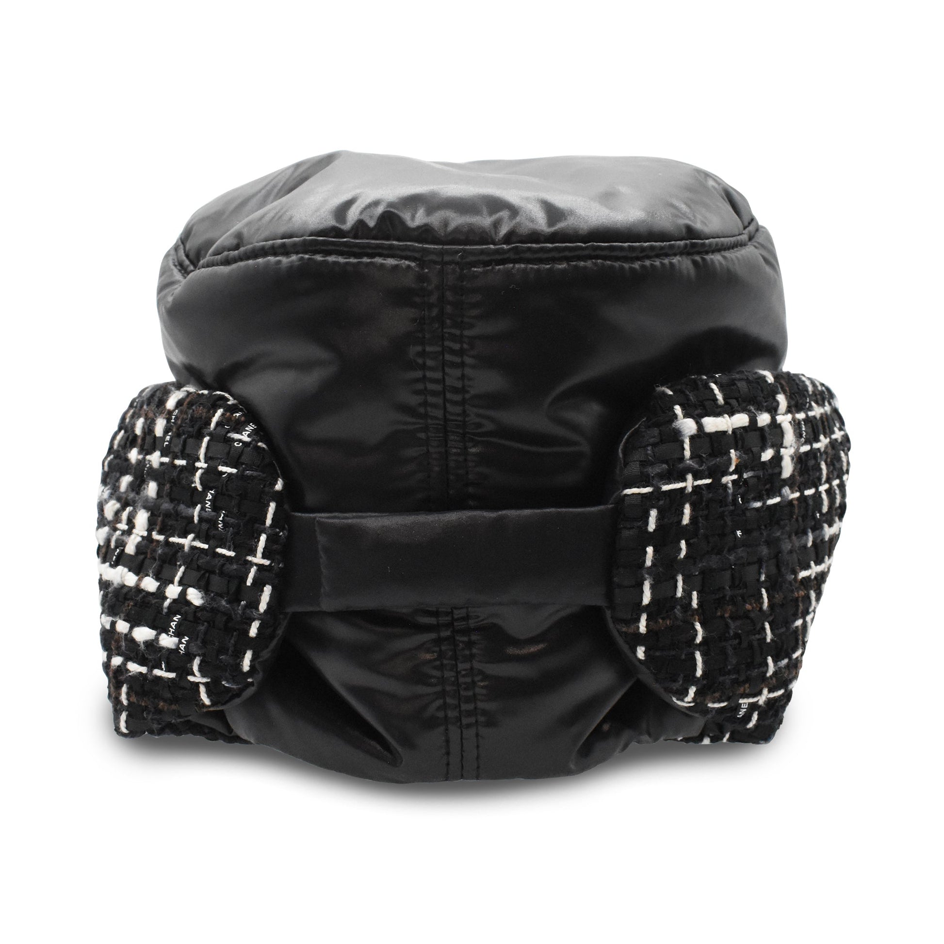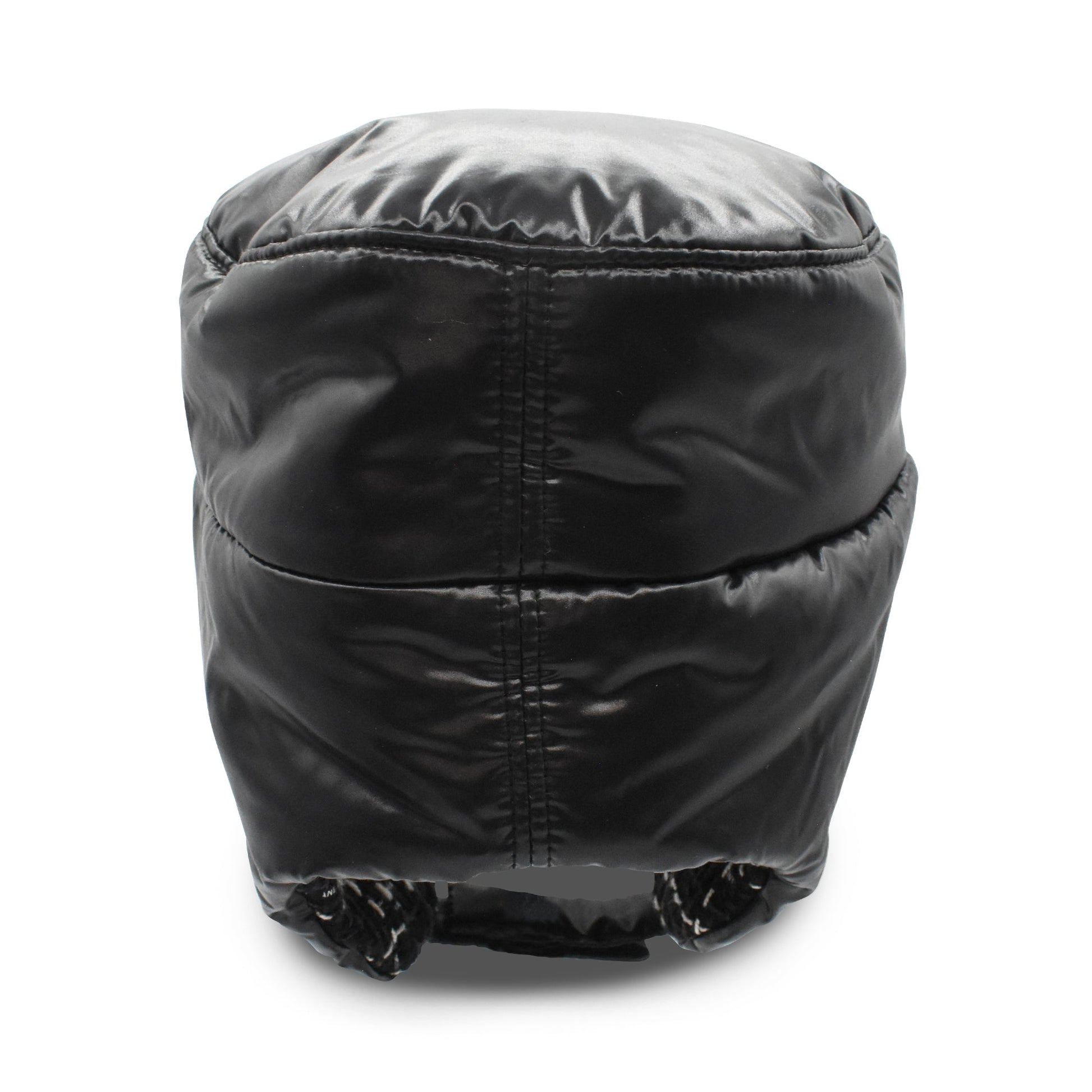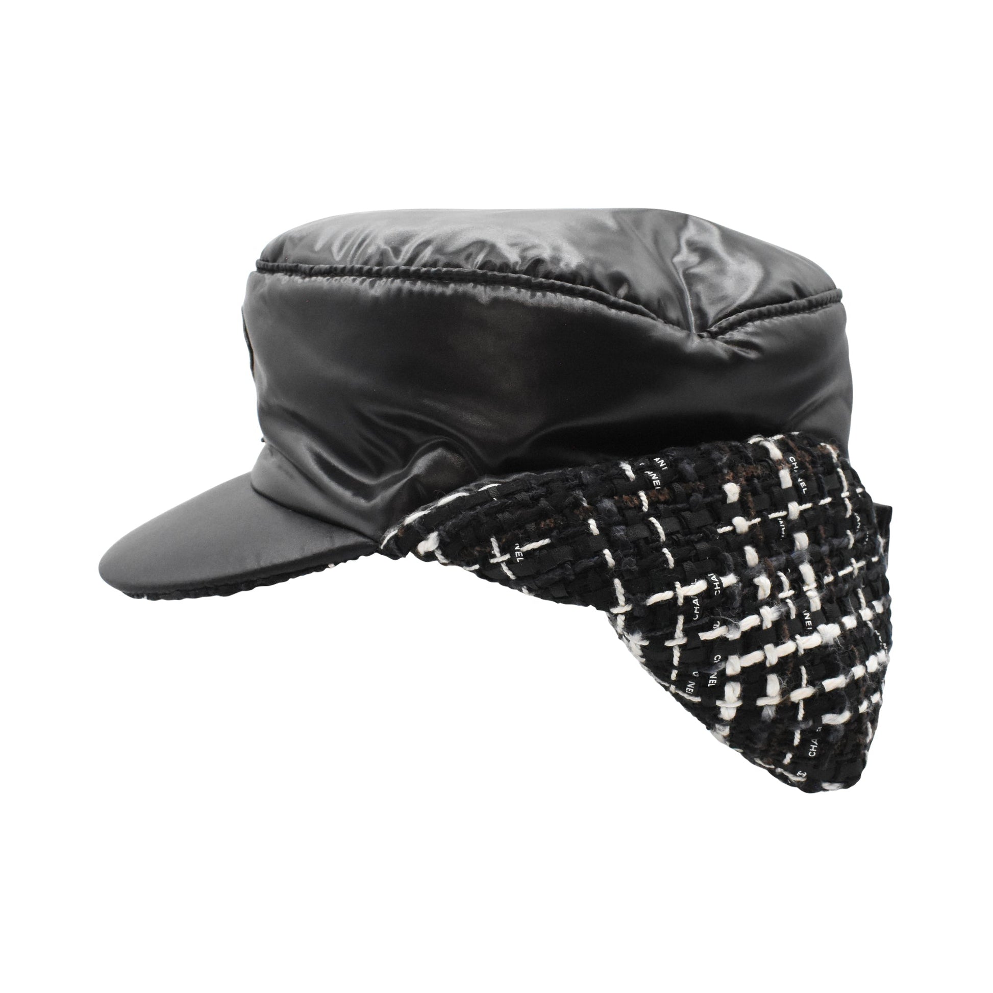Chanel 'Coco Neige' trapper hat in black shiny nylon with interior black, white, and navy blue tweed interior lining. Features white and beige logo patch on the front and adjustable ear flaps that can be worn down or up with snap-buttons. Circa F/W 2018.