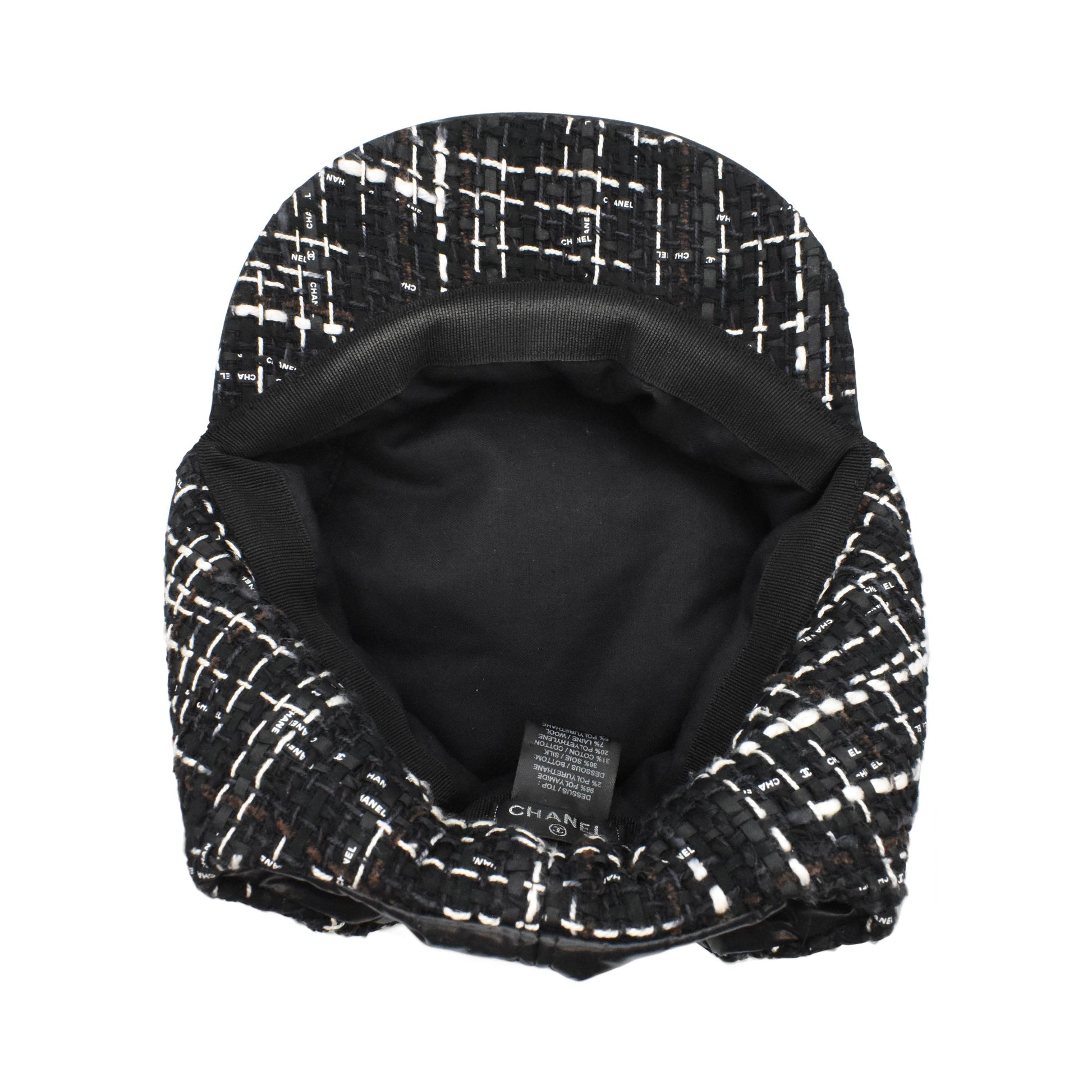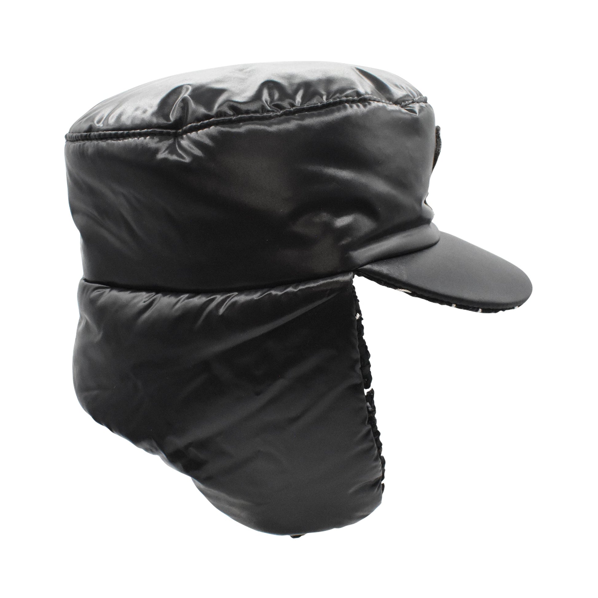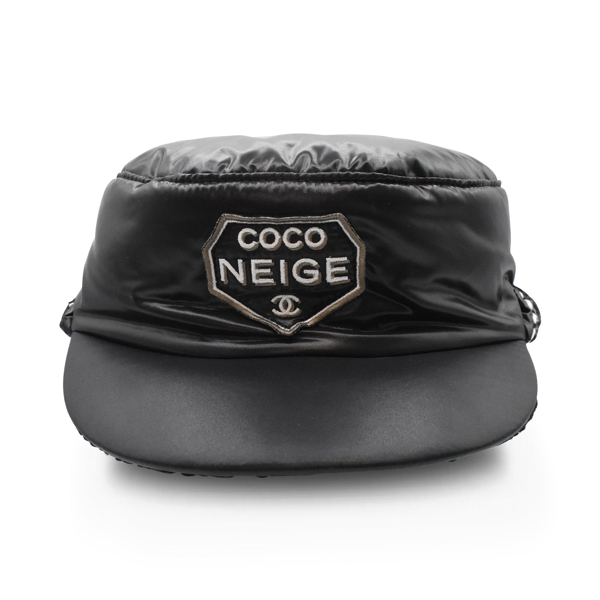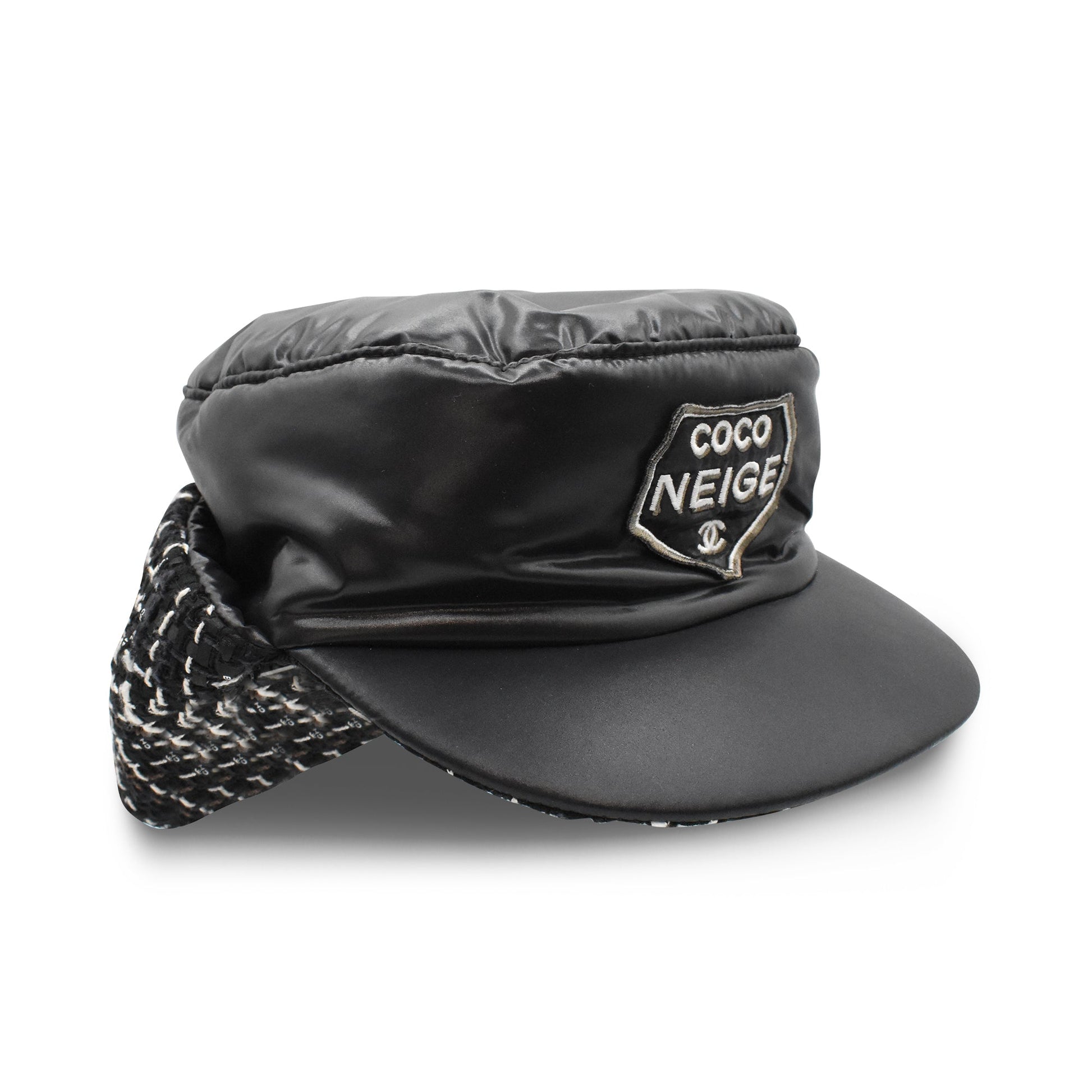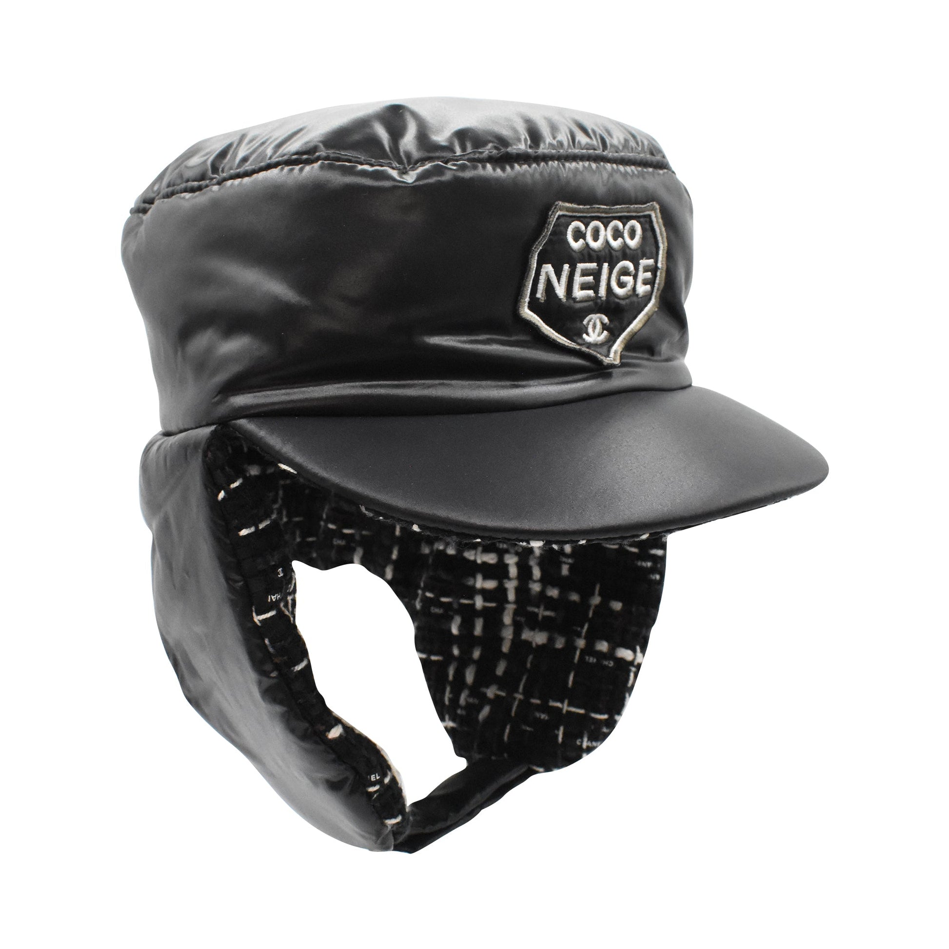Chanel 'Coco Neige' trapper hat in black shiny nylon with interior black, white, and navy blue tweed interior lining. Features white and beige logo patch on the front and adjustable ear flaps that can be worn down or up with snap-buttons. Circa F/W 2018.