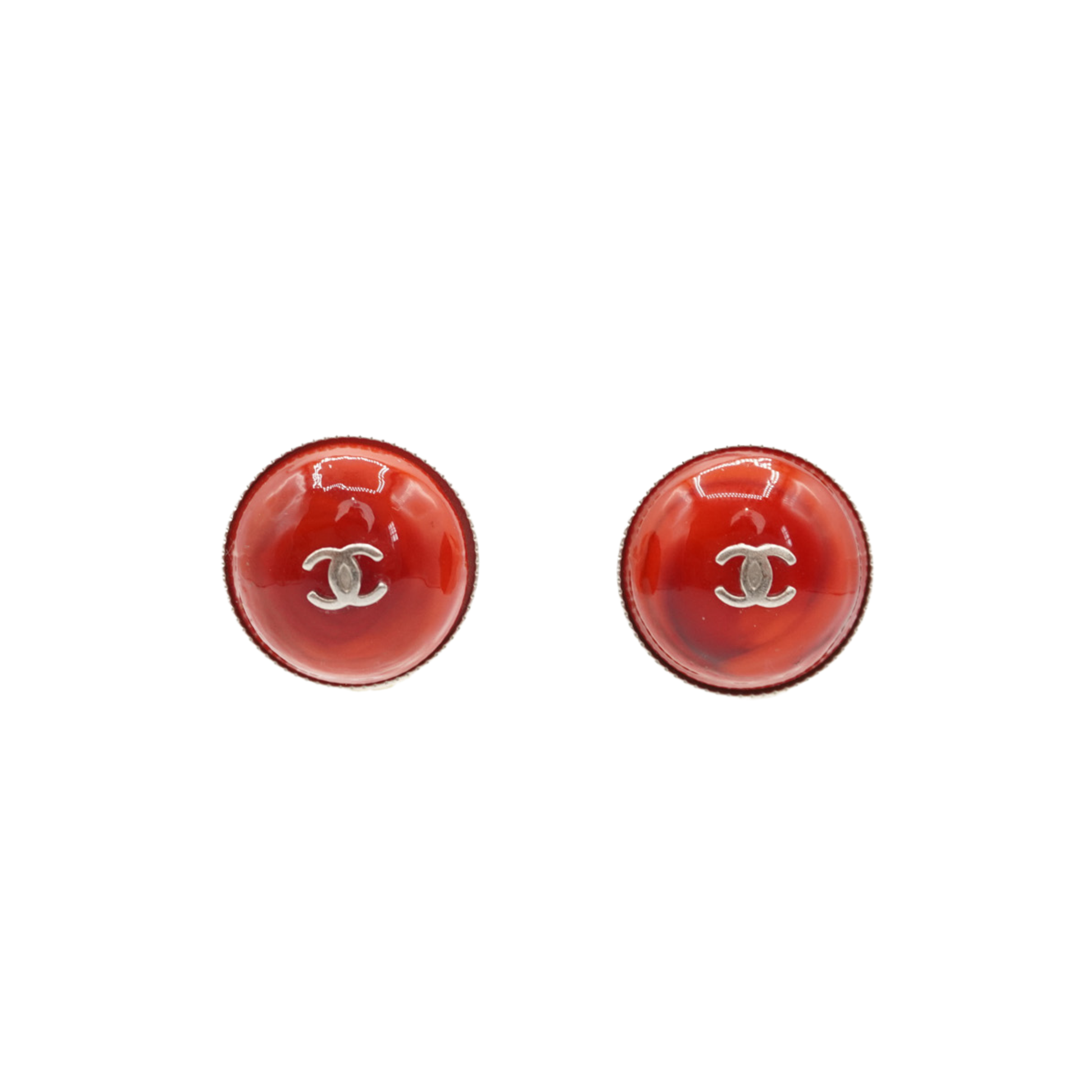 Chanel rounded red resin clip on earrings with silver interlocking CC Cocomark and silver backing.