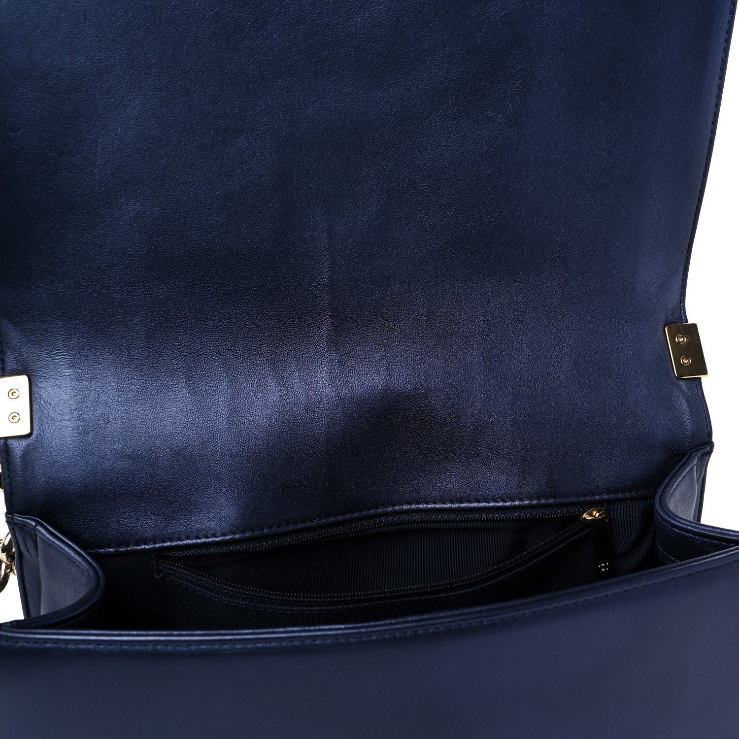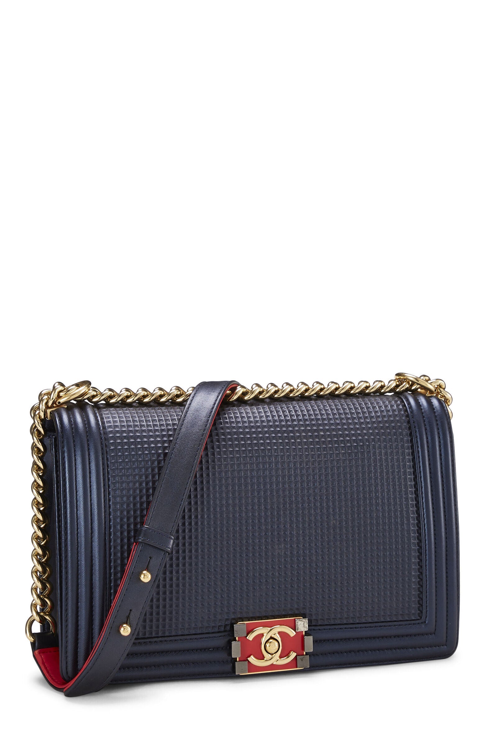 From the Cruise 2014 collection, with an embossed checkered pattern, the CC lock on the flap is decorated in enamel that matches the inner side of the leather shoulder rest. This bag is crafted from metallic navy blue leather, and it has a signature structured shape. The interior is lined with fabric, and lastly, the bag is complete with a shoulder strap.
