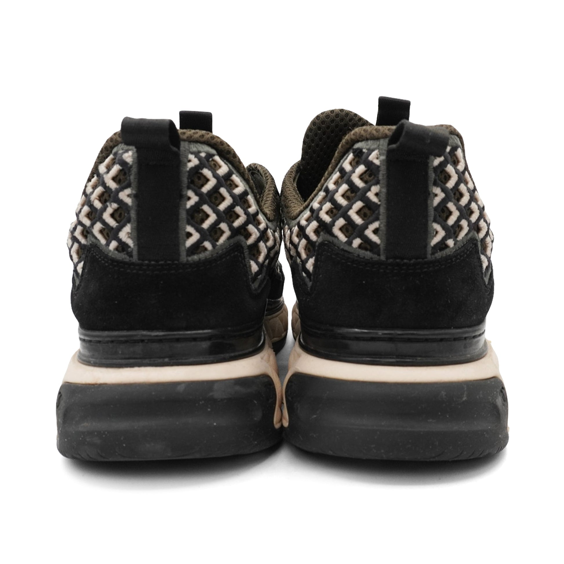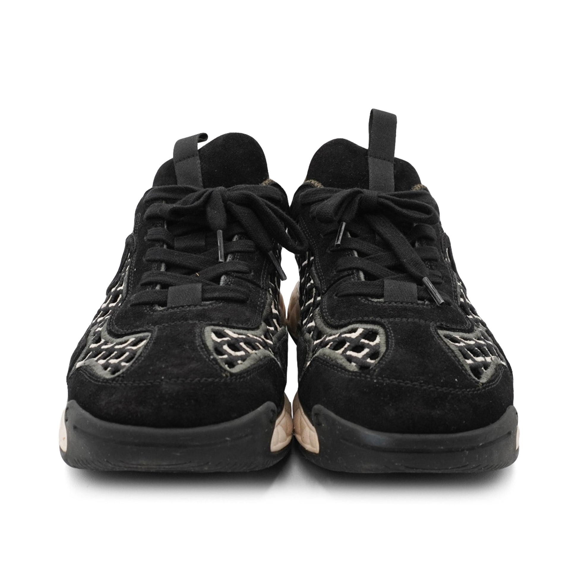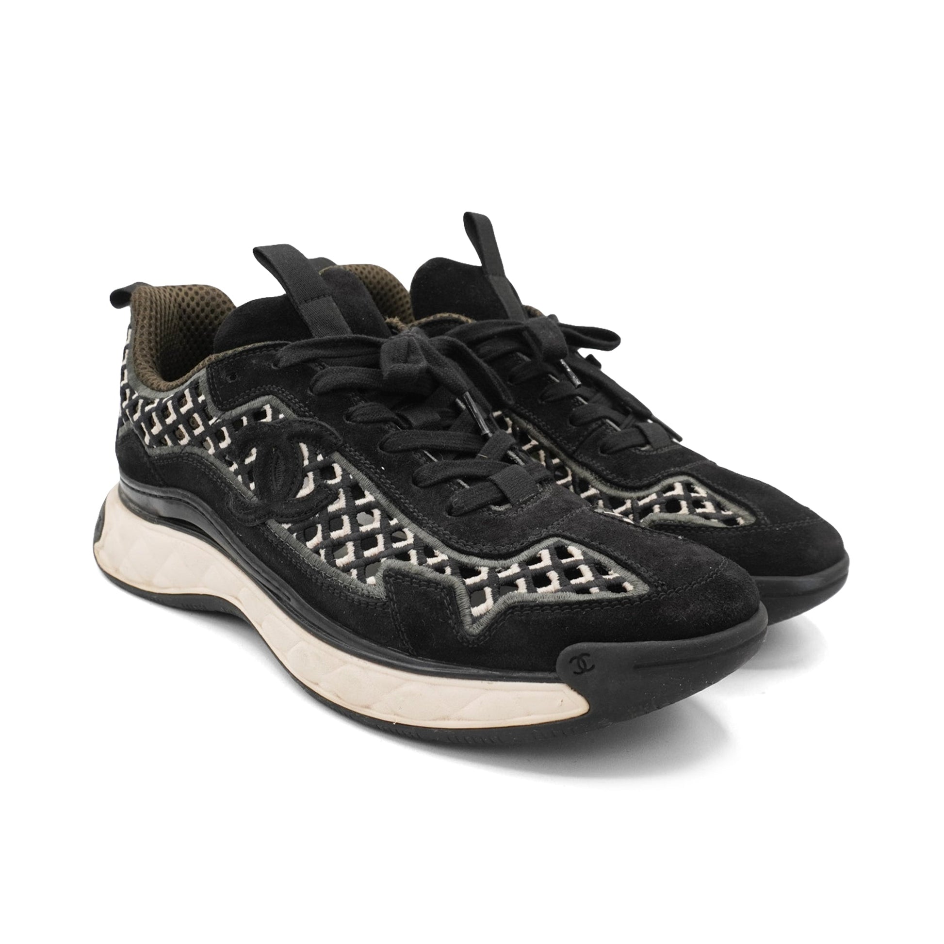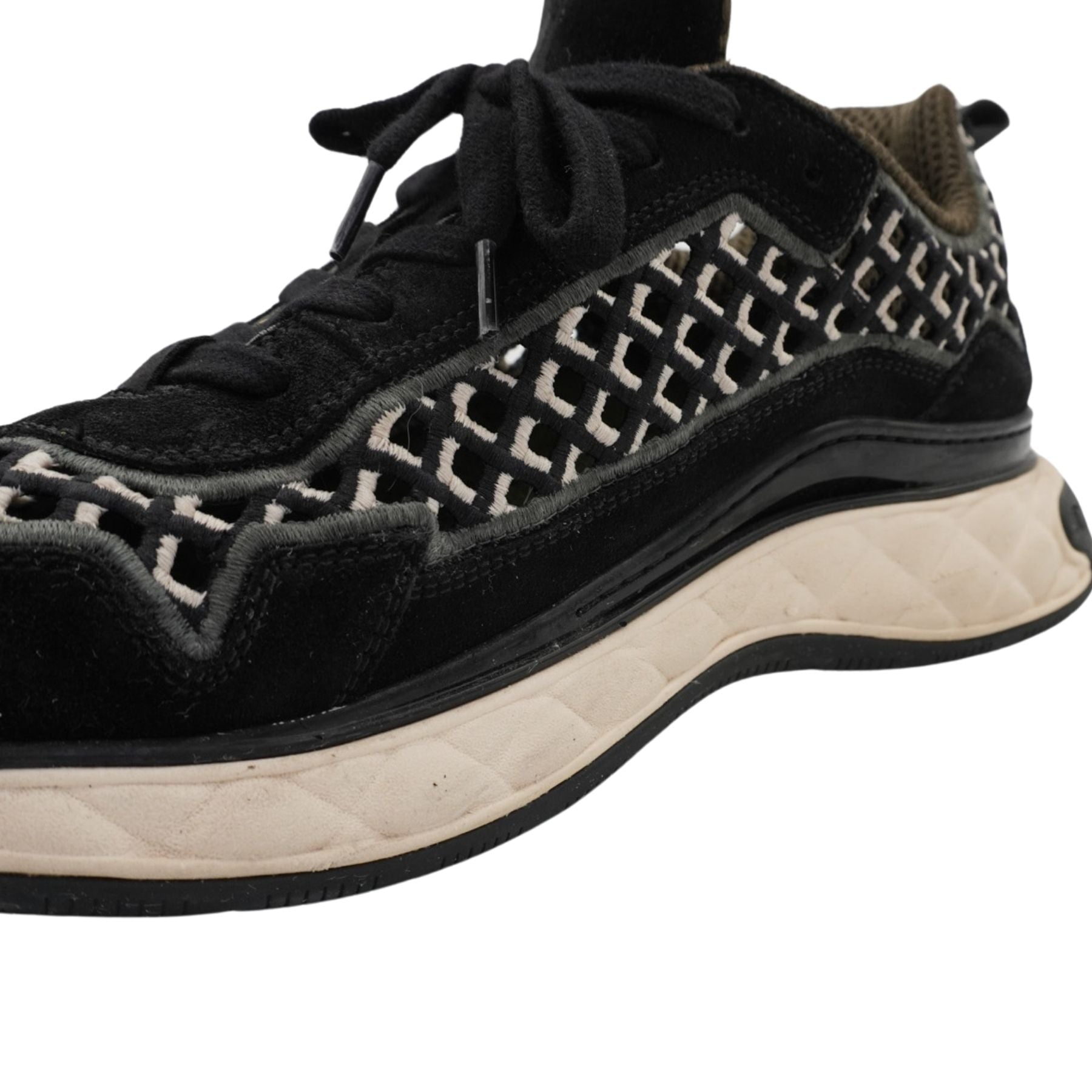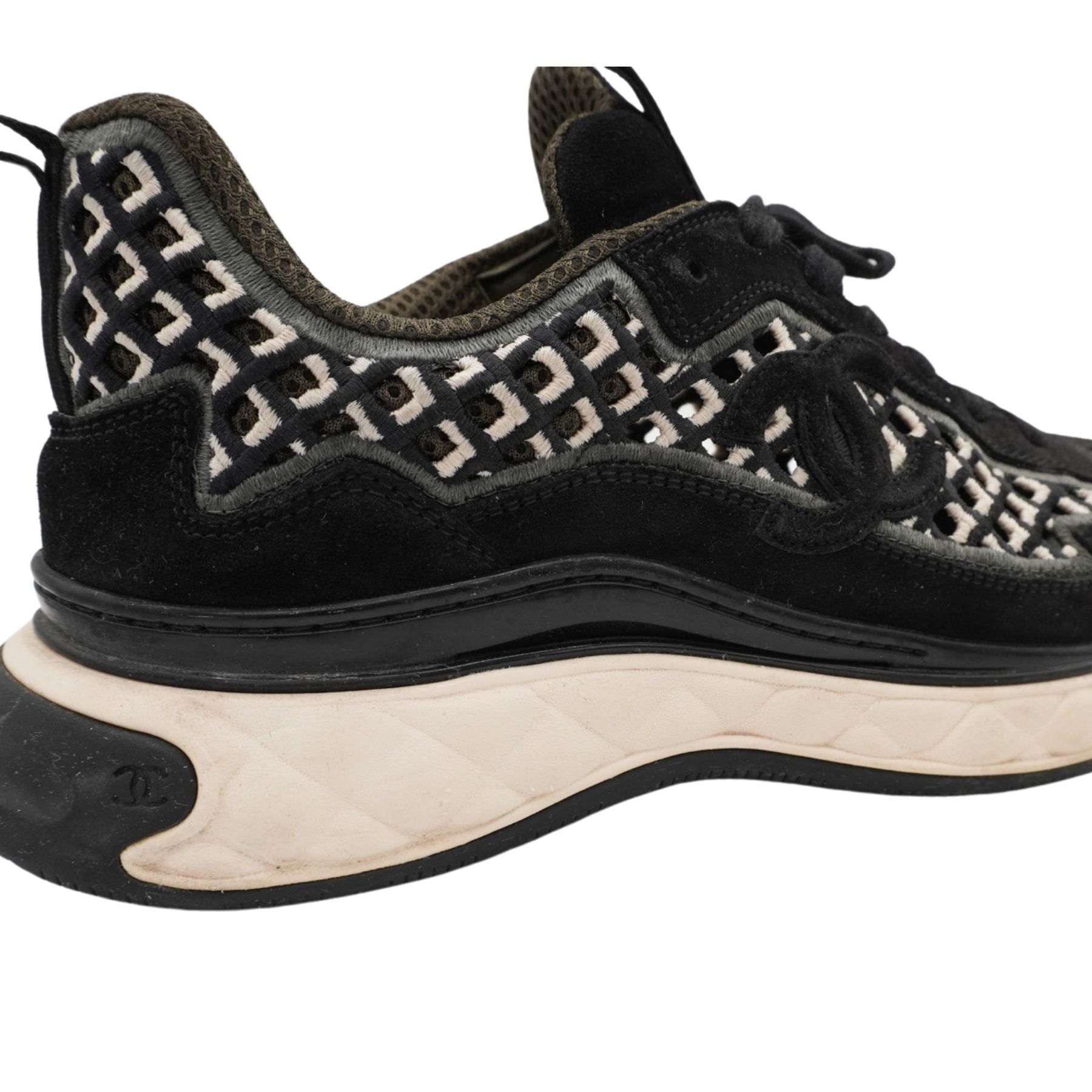 Chanel low top sneakers in black suede with grey and white embroidered cut out quilted design. Feature black CC logo patches and white quilted midsoles.