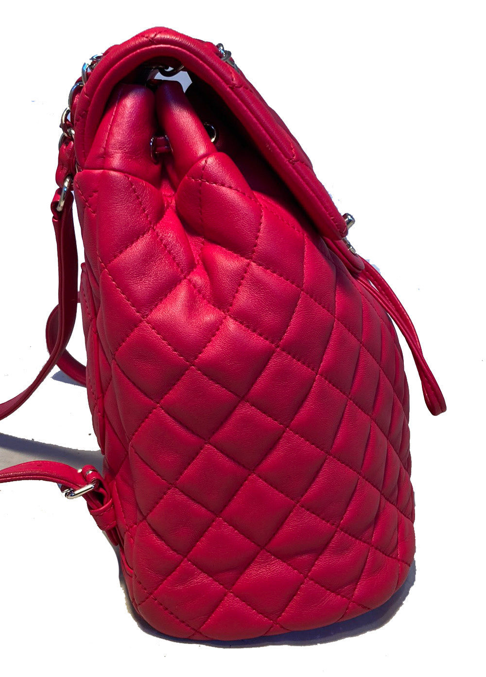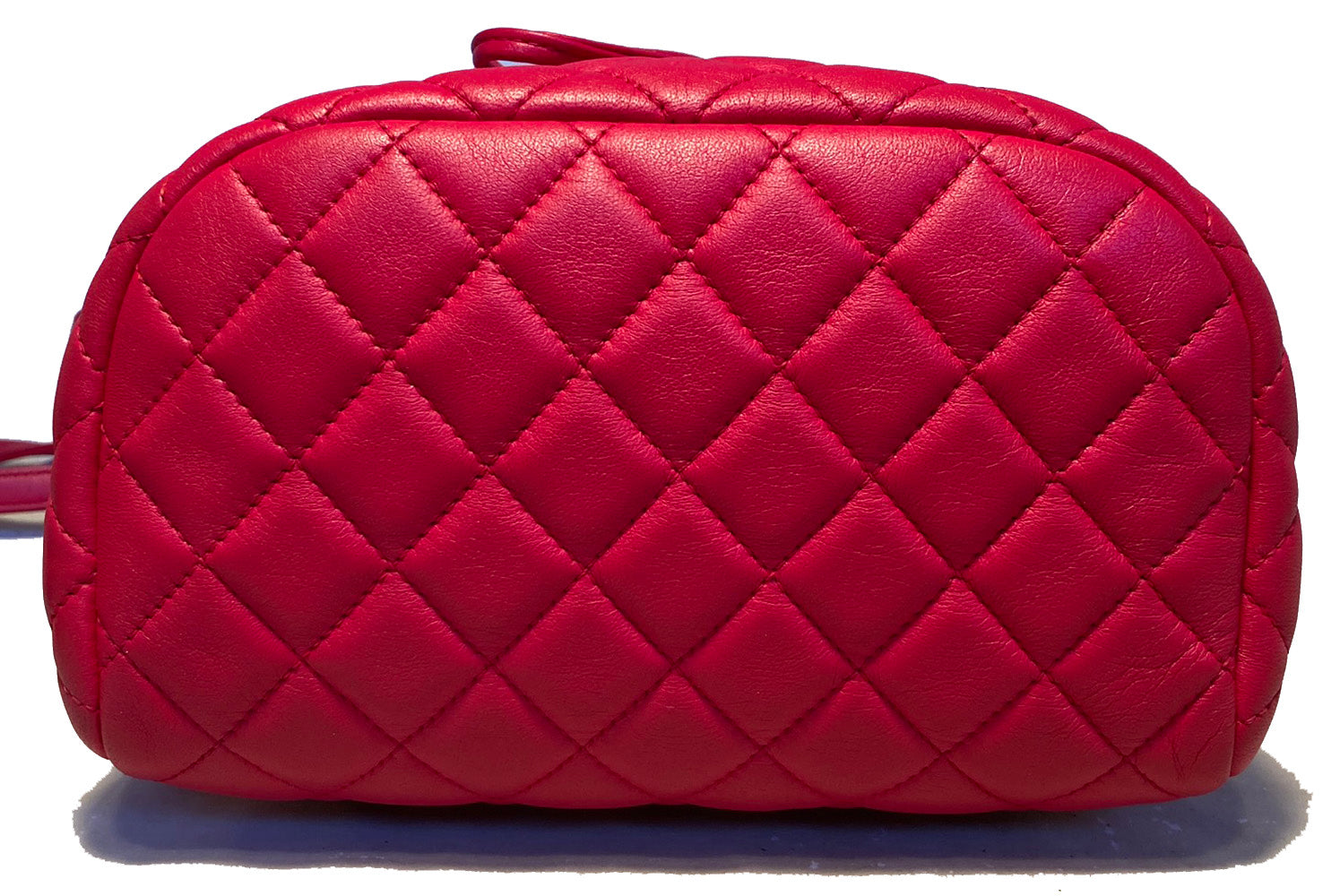 Chanel Urban Spirit Backpack in excellent condition. quilted lambskin exterior trimmed with silver hardware and adjustable woven leather and chain shoulder straps. Back exterior slit pocket. Front CC twist logo and drawstring closure opens to a pink nylon lined interior with one zipped and one slit side pockets. No stains, smells or scuffs. Clean corners, edges and interior. Perfect color and size for brightening up a variety of occasions. Purchase includes dust cover and ity card. Measurements: 12"x10"x6" 16-19 strap