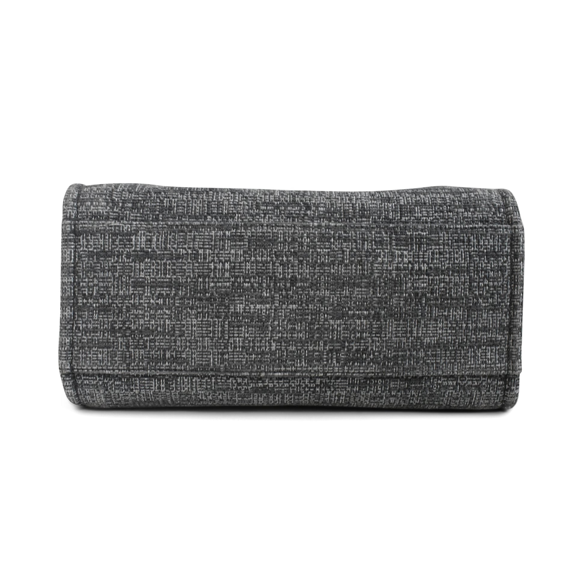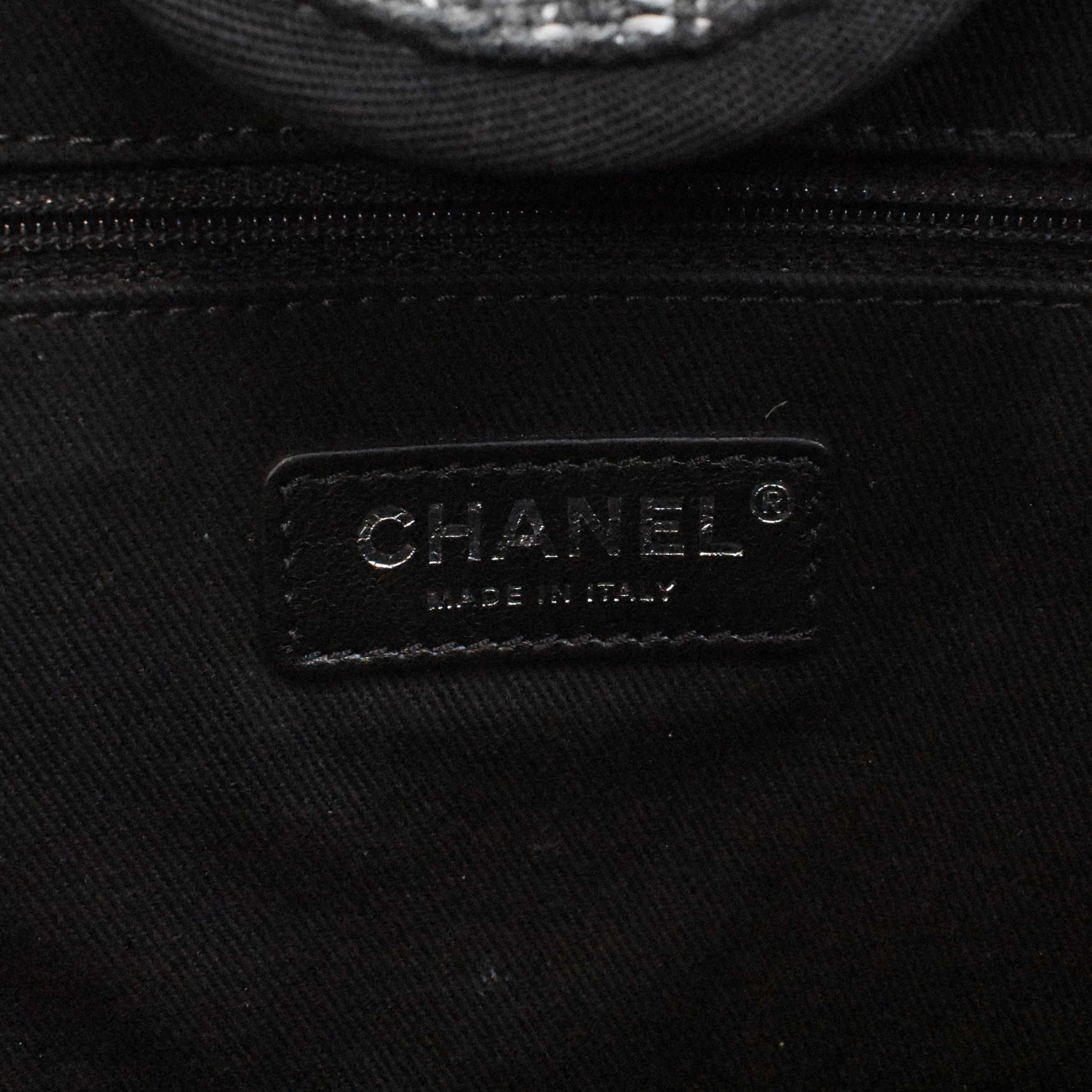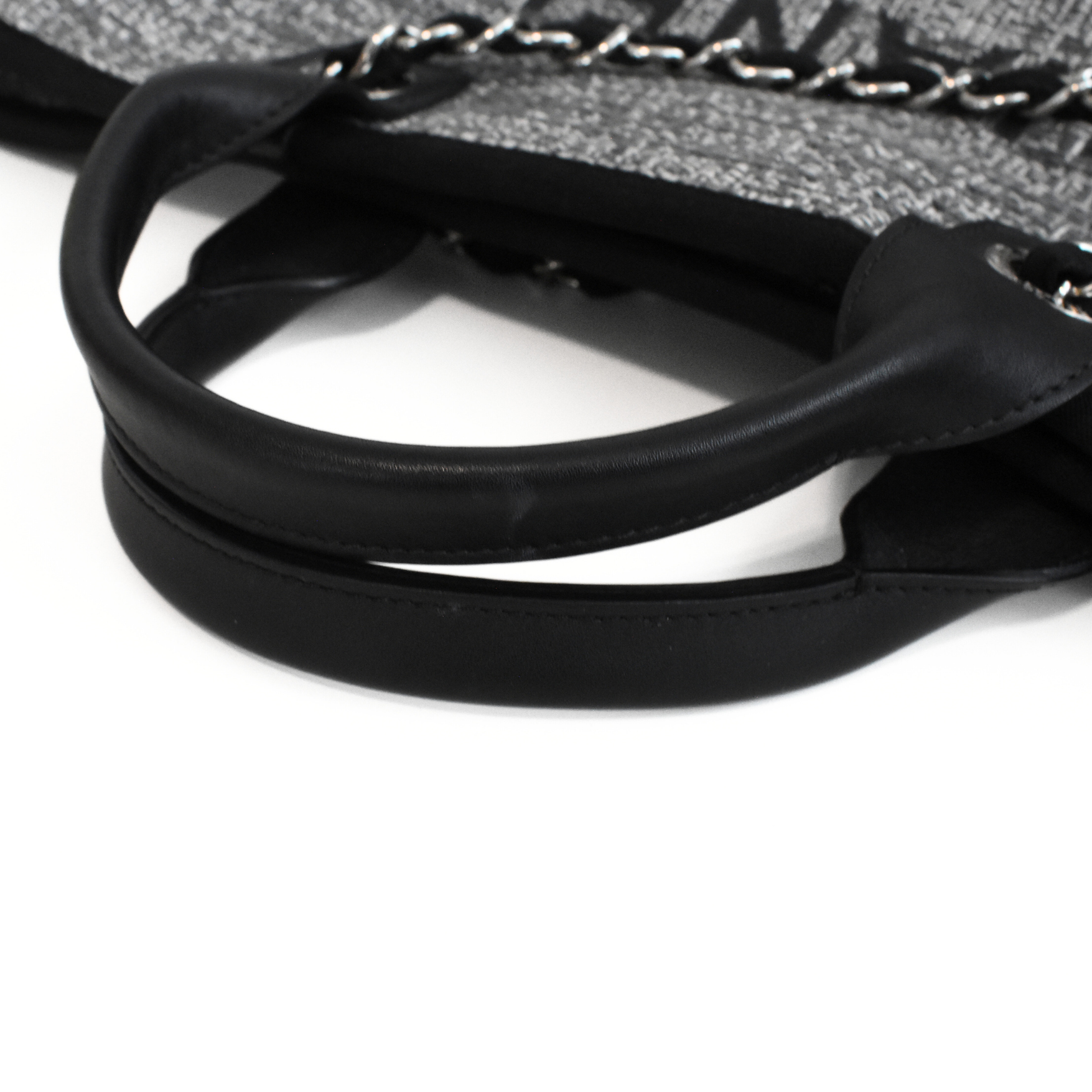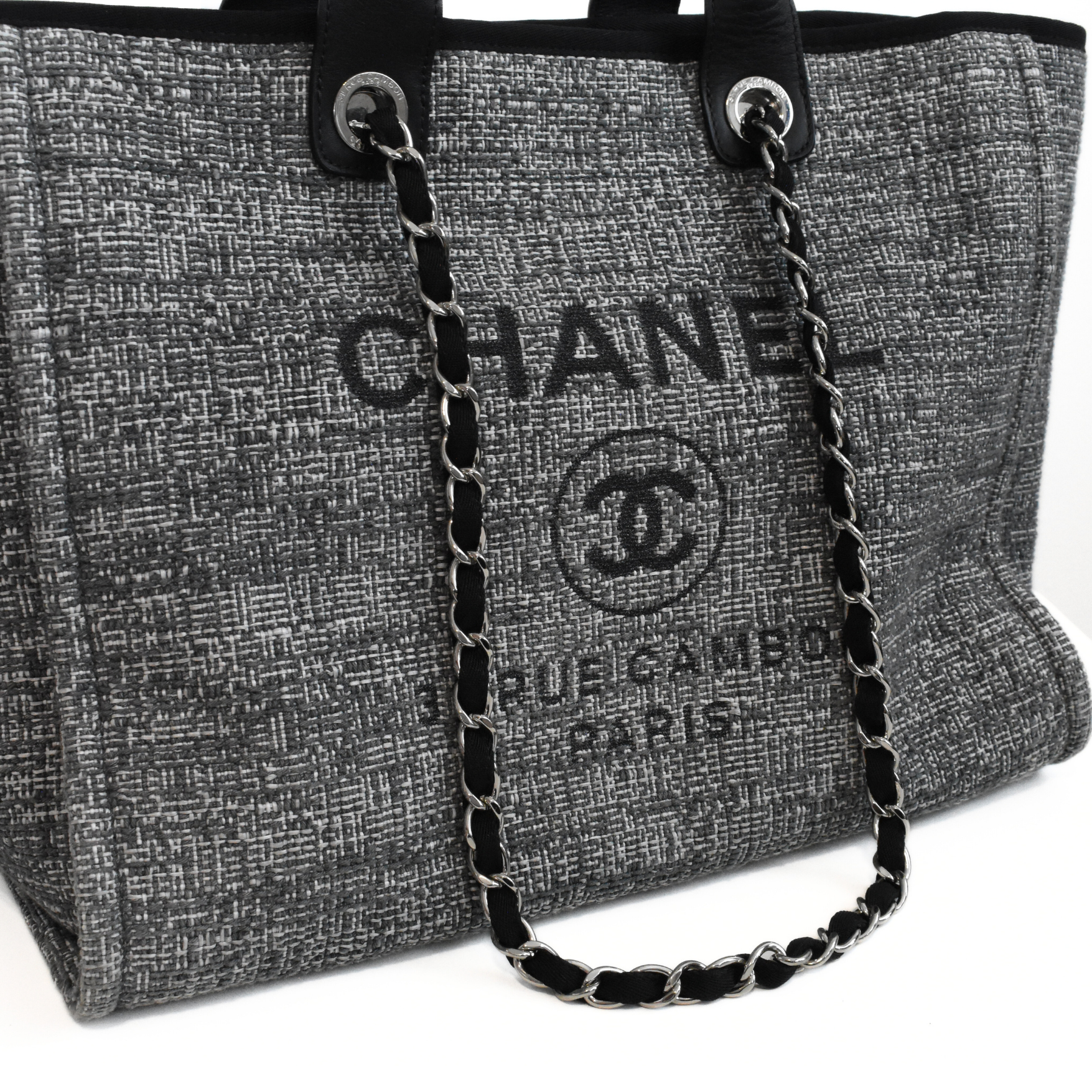 Chanel 'Deauville' tote bag in grey and white tweed. Features black cotton trim, black leather top handles, black embroidered logo print on the front, and two silver hardware chain long straps. The interior is black canvas lined with a magnetic button closure, a zip pocket, two slip pockets, and a keychain strap.