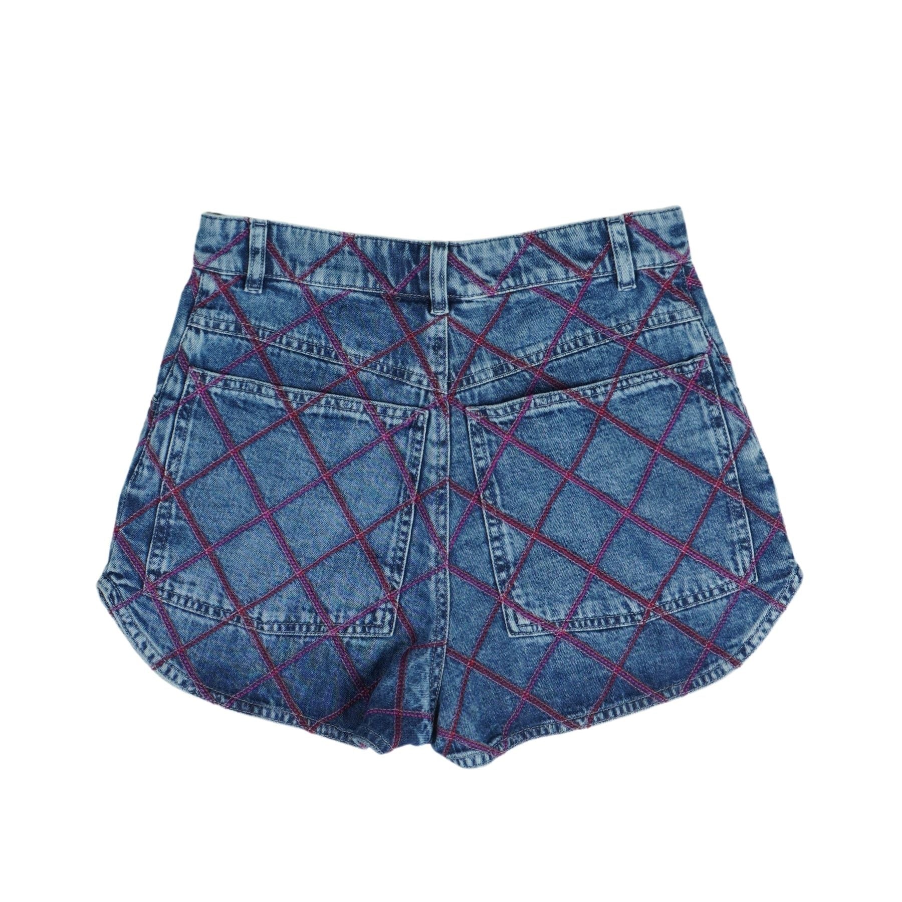 Chanel high-waisted shorts in blue medium-washed denim with pink, red and orange stitched quilt detailing, rounded hems, and a silver 'CC' embossed button.