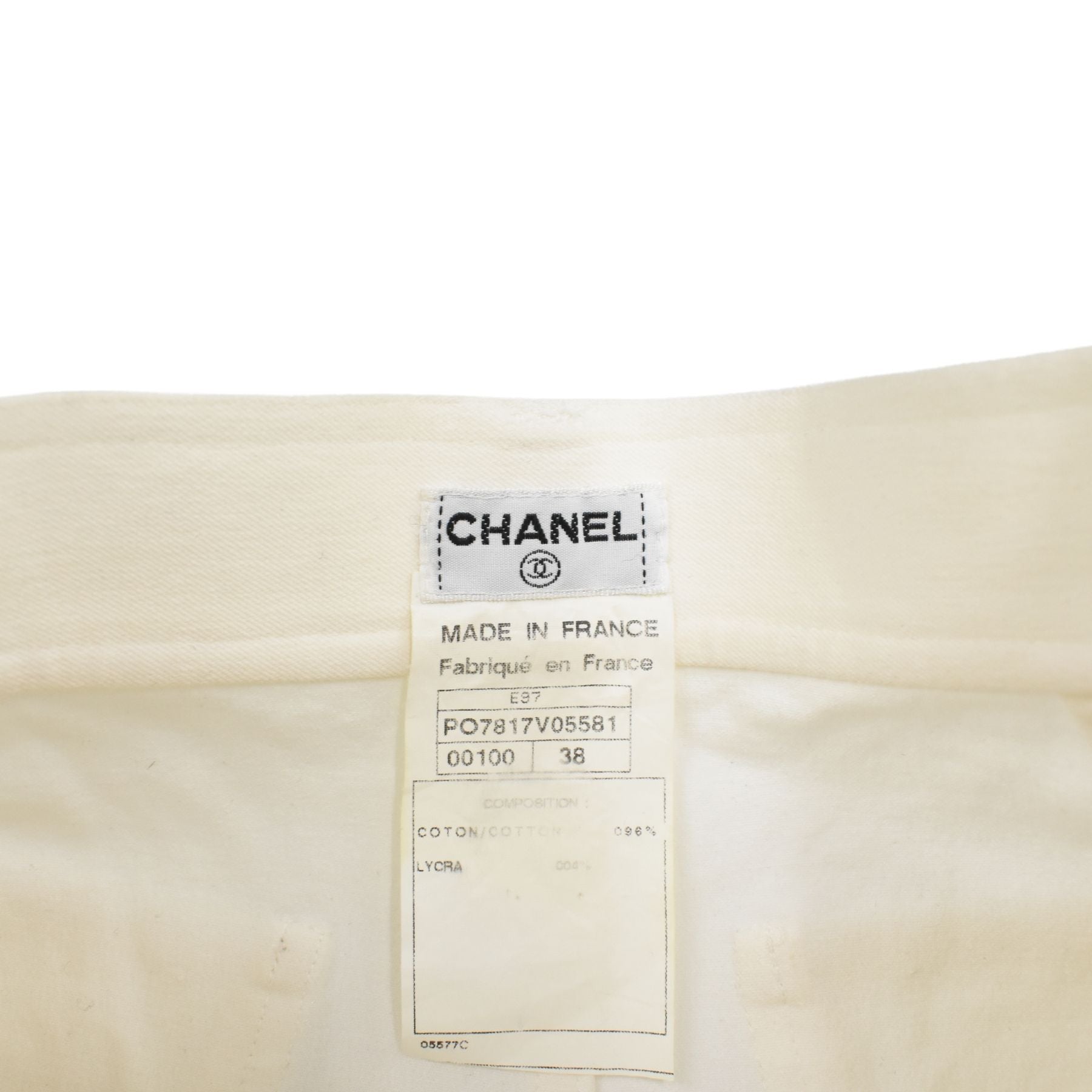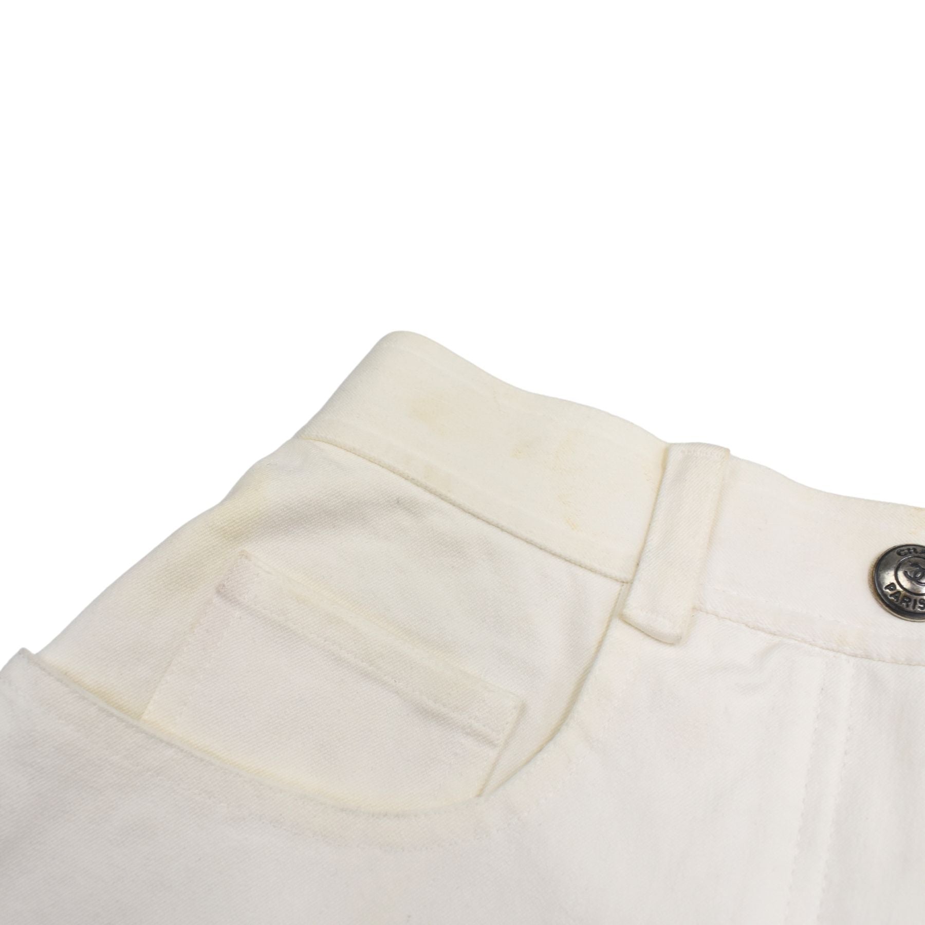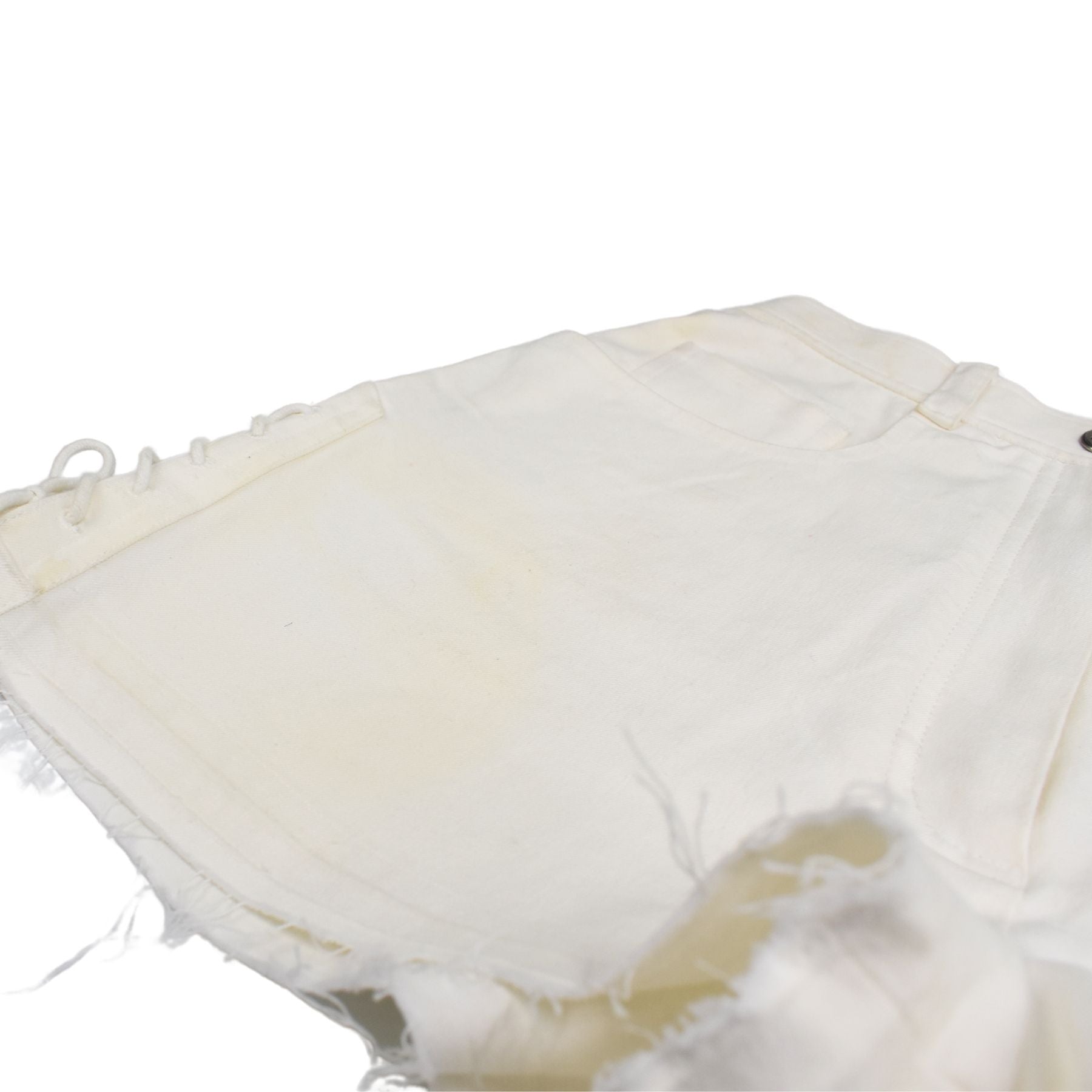 Chanel high waisted shorts in white denim with a lace up detail on the side seams, raw hems, a 'CC' stitch patch on the back pocket, and silver logo-embossed button hardware.