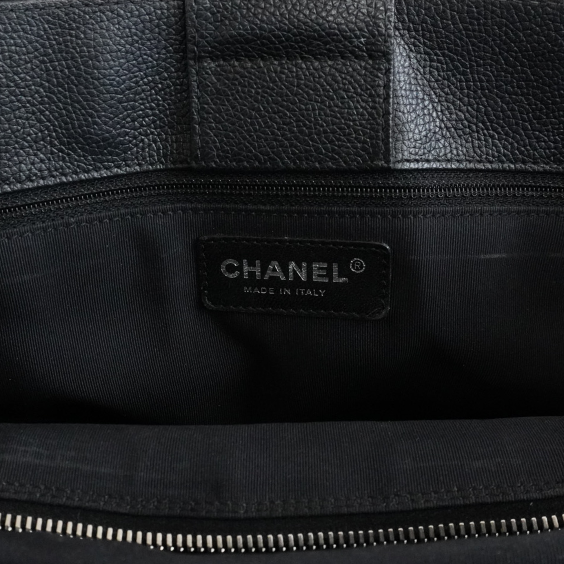 Chanel 'Executive' tote bag in black grained leather with silver hardware including a CC turnlock detail. Features a main grosgrain lined open pocket with removable zip pouch divider in the centre and two flat zip pockets on the sides. There are two exterior slip pockets, the front one can be closed with the CC turnlock.
