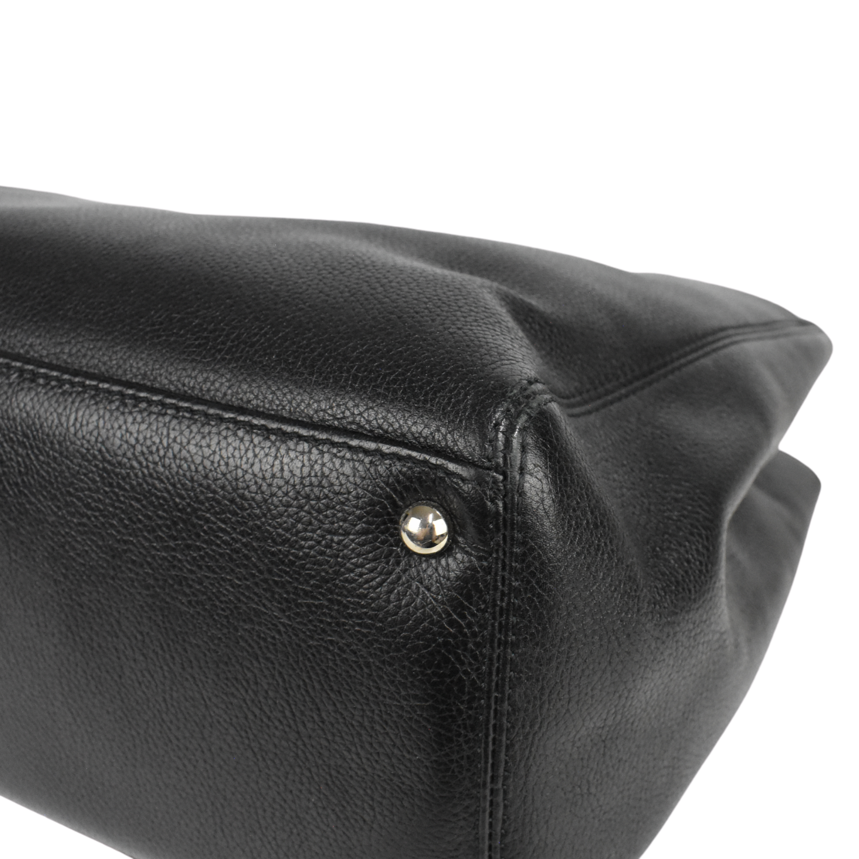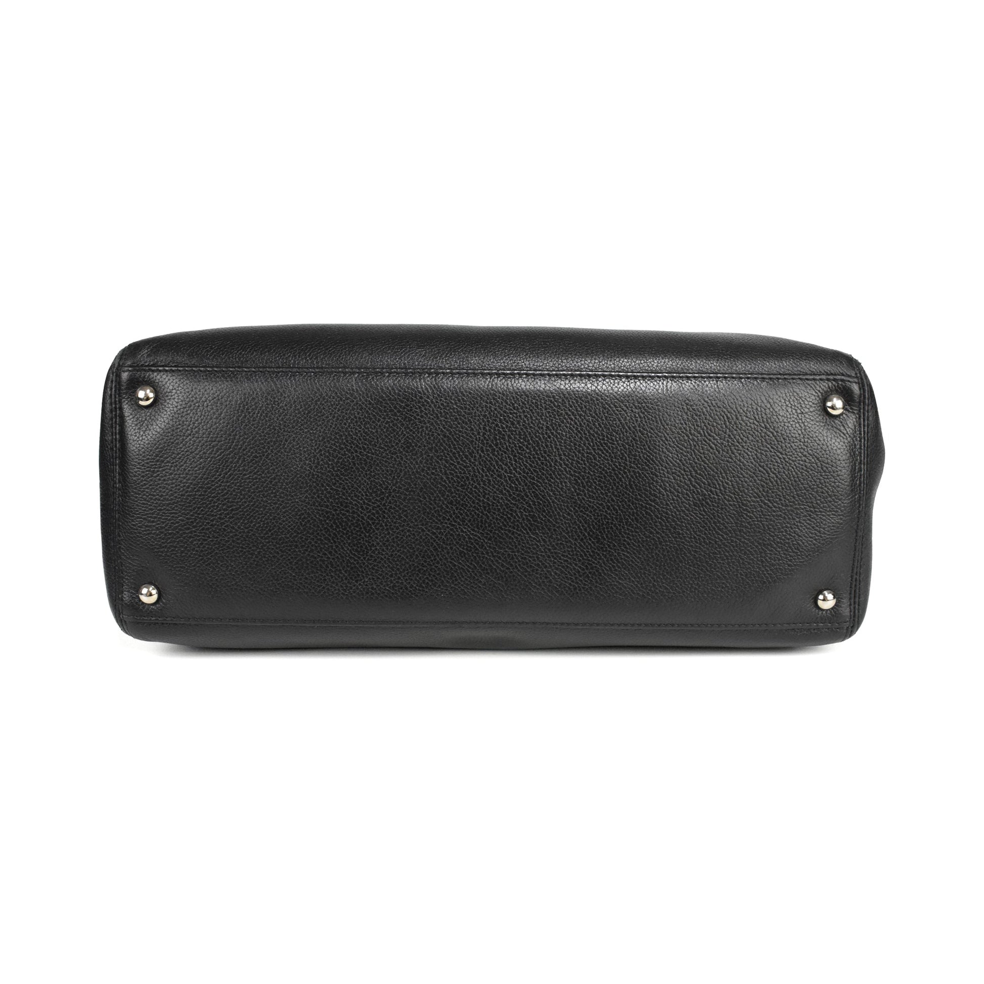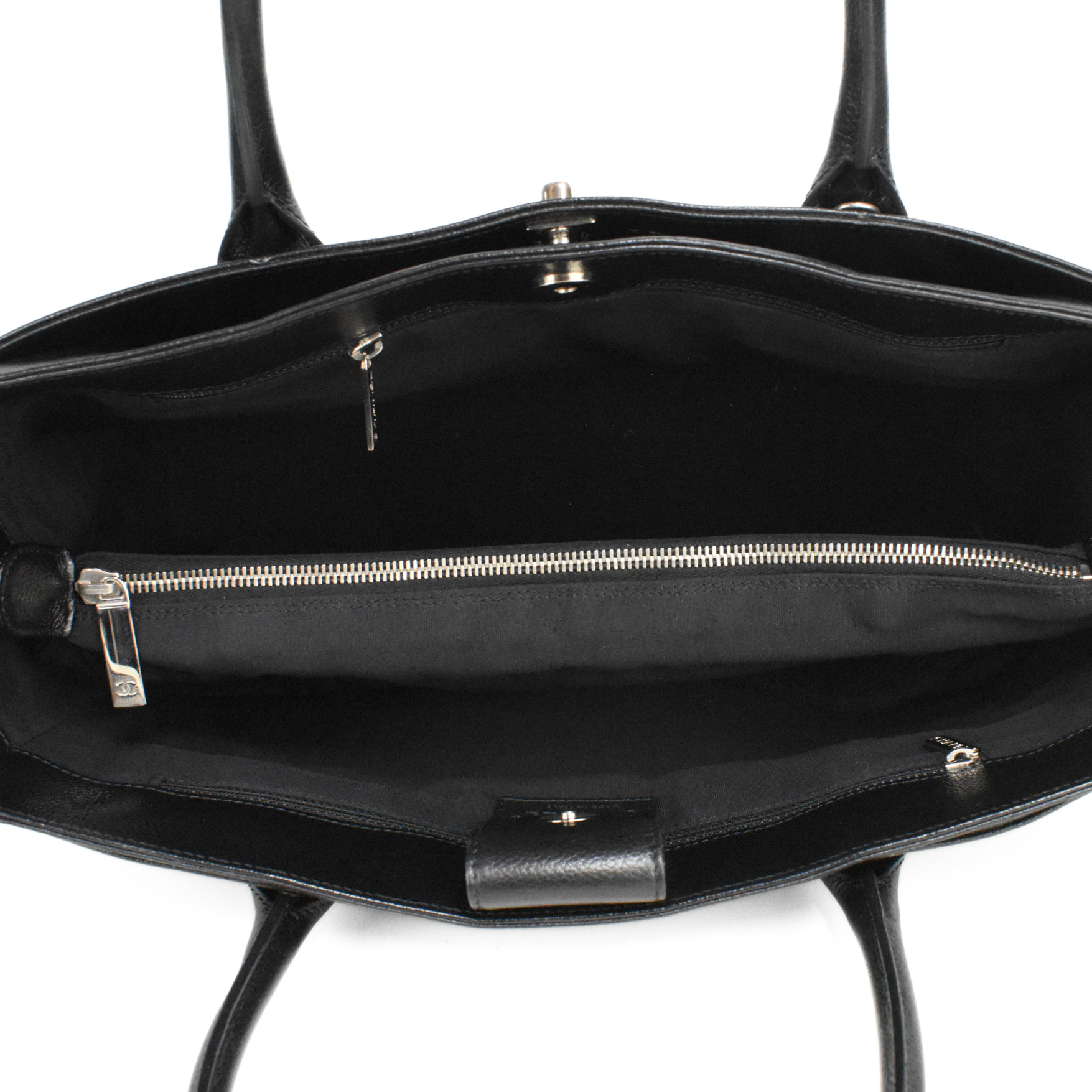 Chanel 'Executive' tote bag in black pebbled leather with rolled top handles, large outer slip pockets, and a 'CC' turnlock closure in silver hardware. Features a top-snap opening revealing a black canvas inner lining with two zip pockets and a large detachable zip pouch.