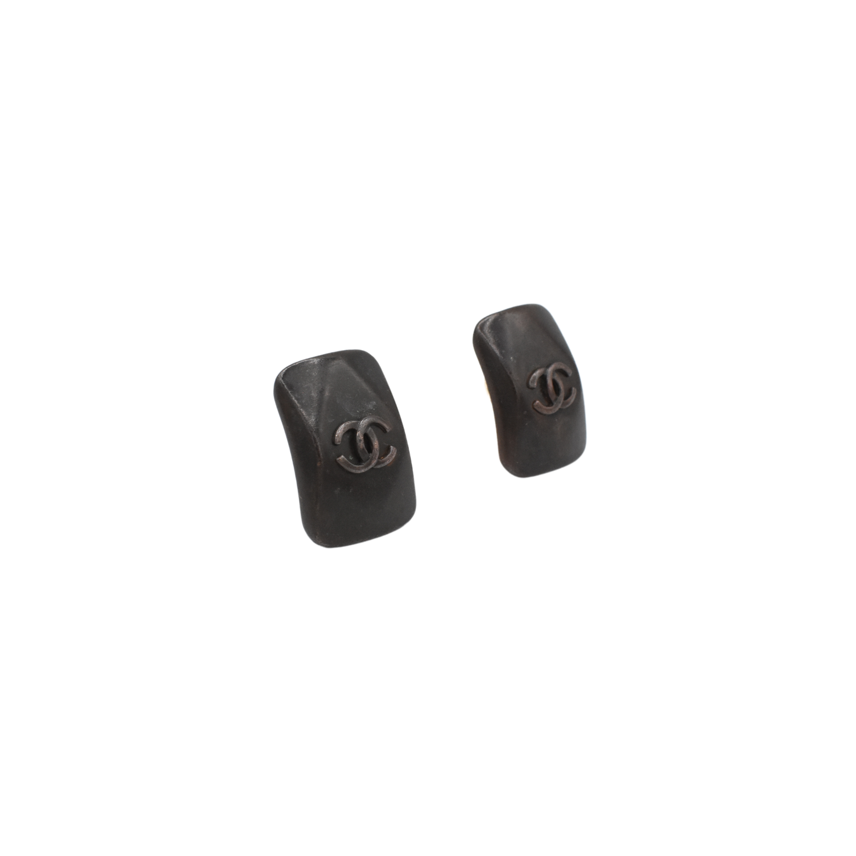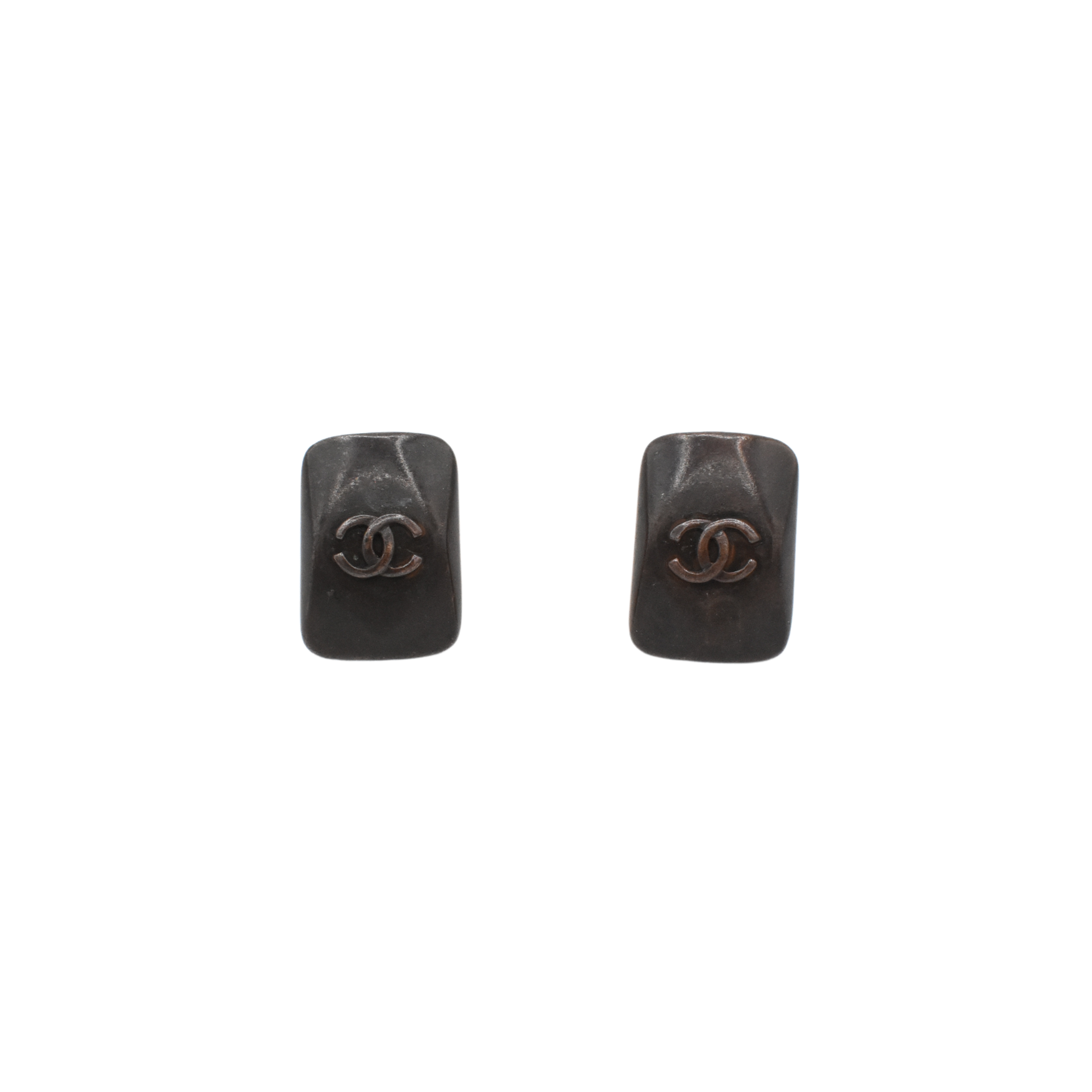 Chanel vintage clip earrings in bronze brown metal with an angular rectangle shape and an embossed 'CC' logo.