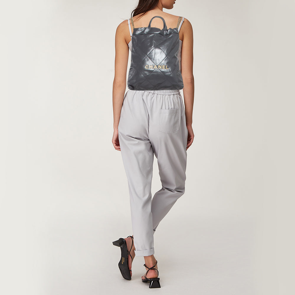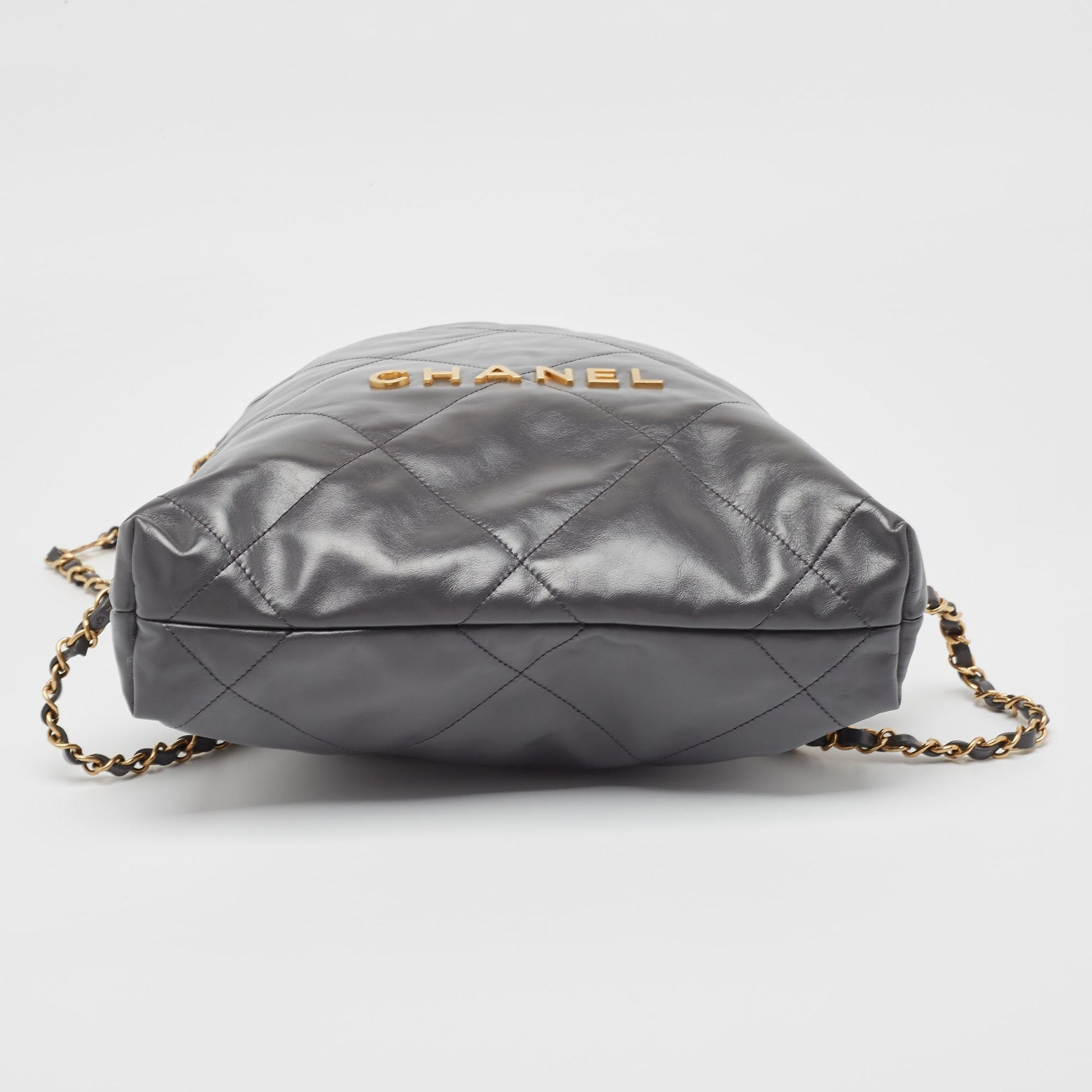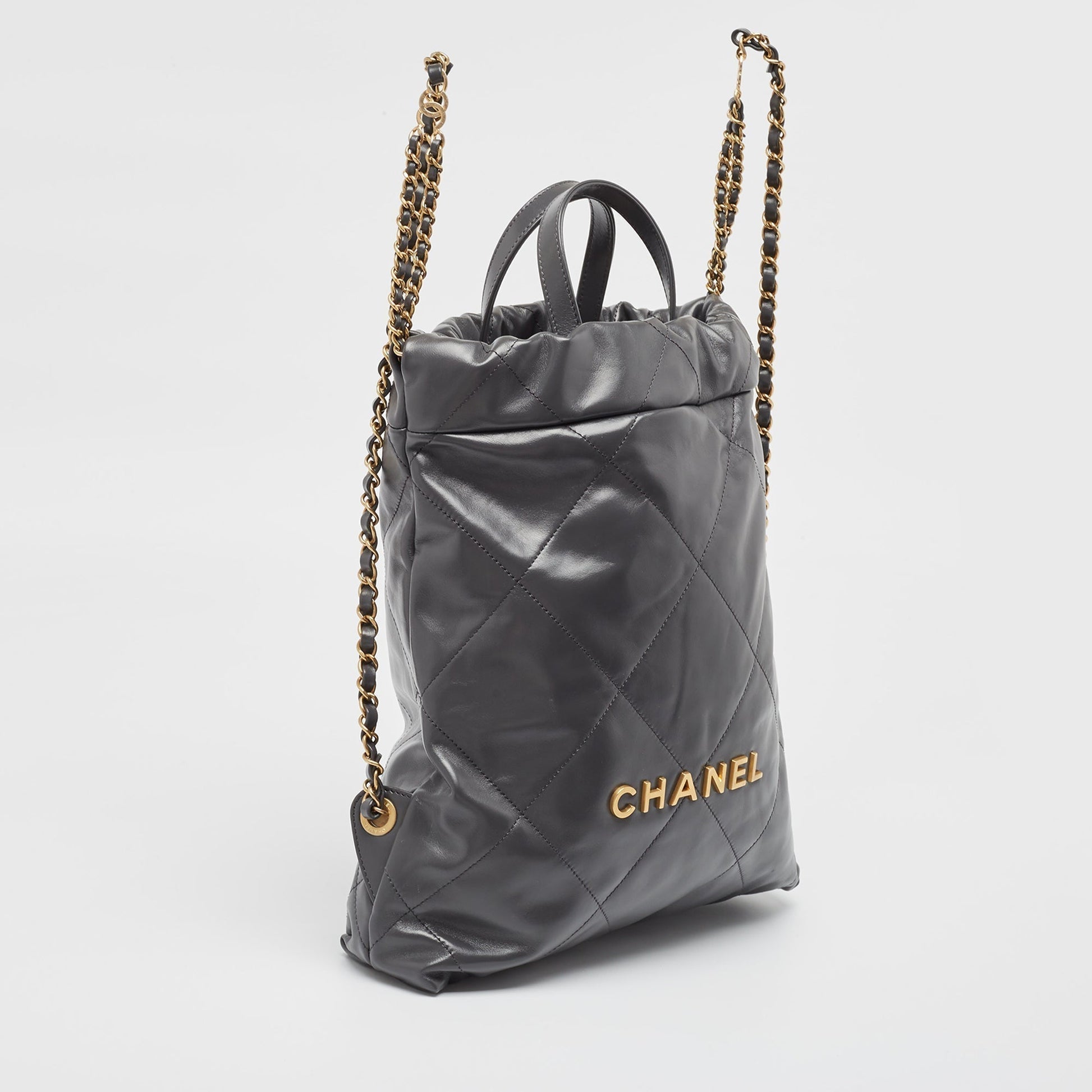 Crafted from sumptuous quilted leather, the Chanel backpack exudes timeless chic. Its compact 22cm silhouette boasts functionality and style, featuring adjustable leather straps for comfort and a spacious interior for essentials. The iconic interlocking CC logo subtly adorns the front, adding a touch of luxury to everyday adventures.