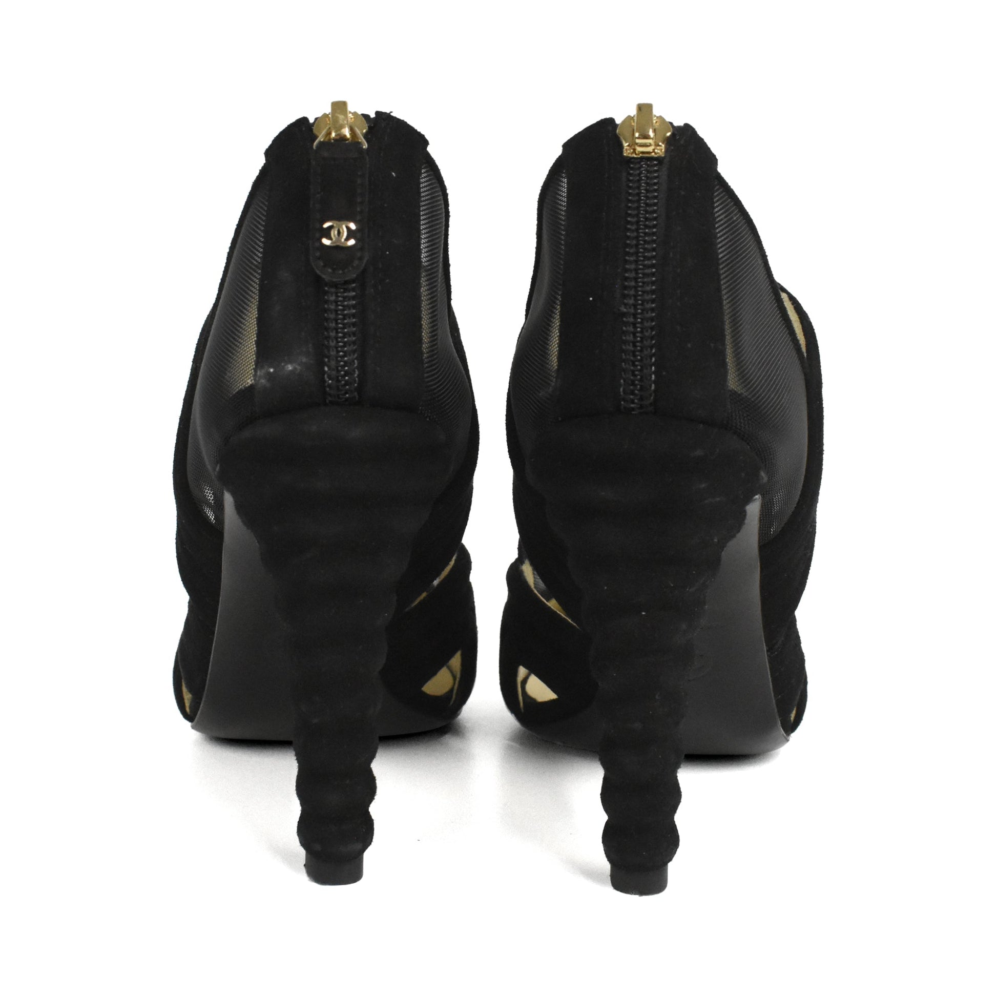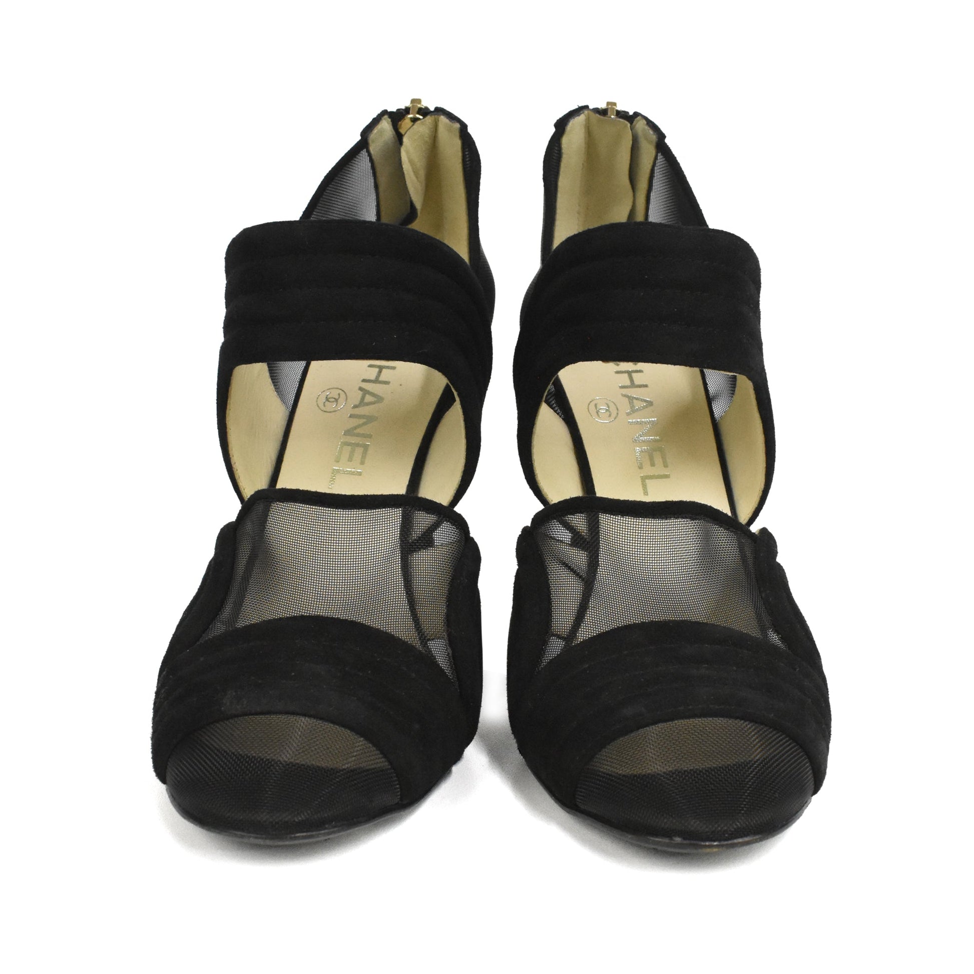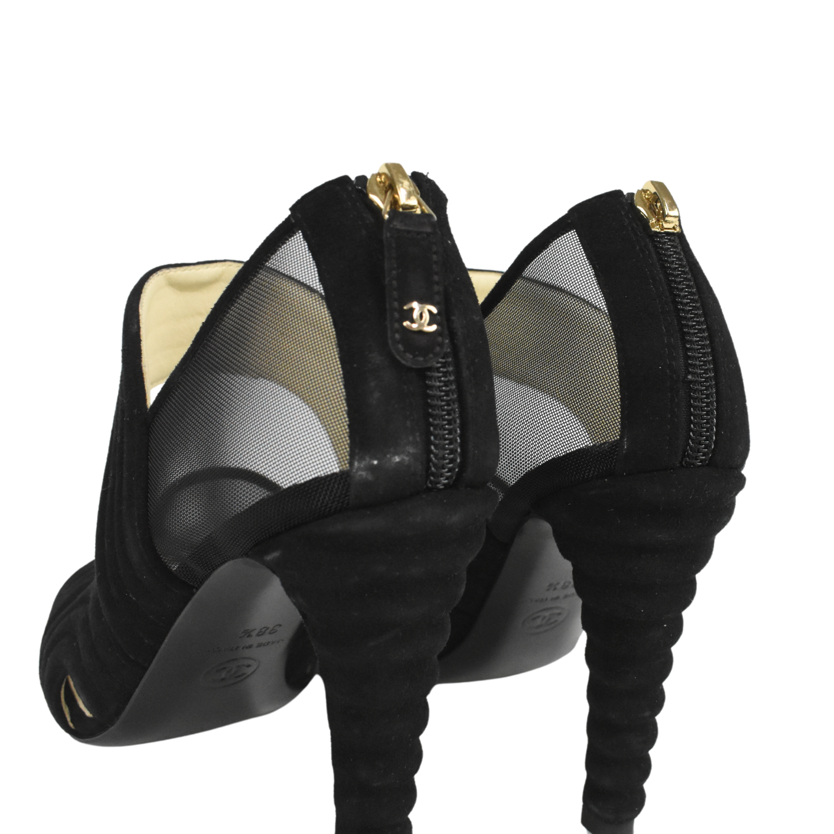 Chanel heels in black ribbed suede in a wave design with black mesh panels and an almond toe. Features a zip opening on the back heel in gold hardware with a gold metal 'CC' emblem.