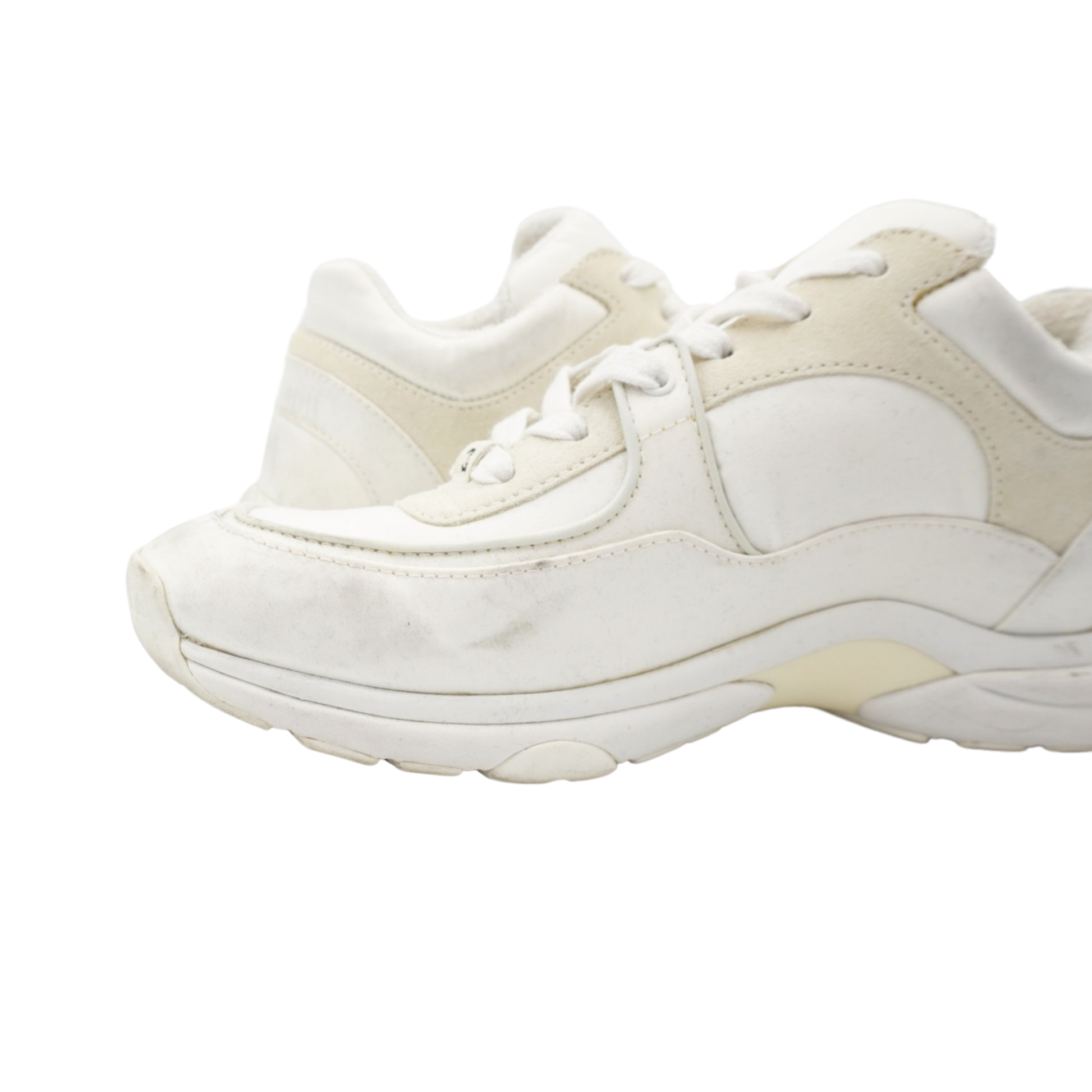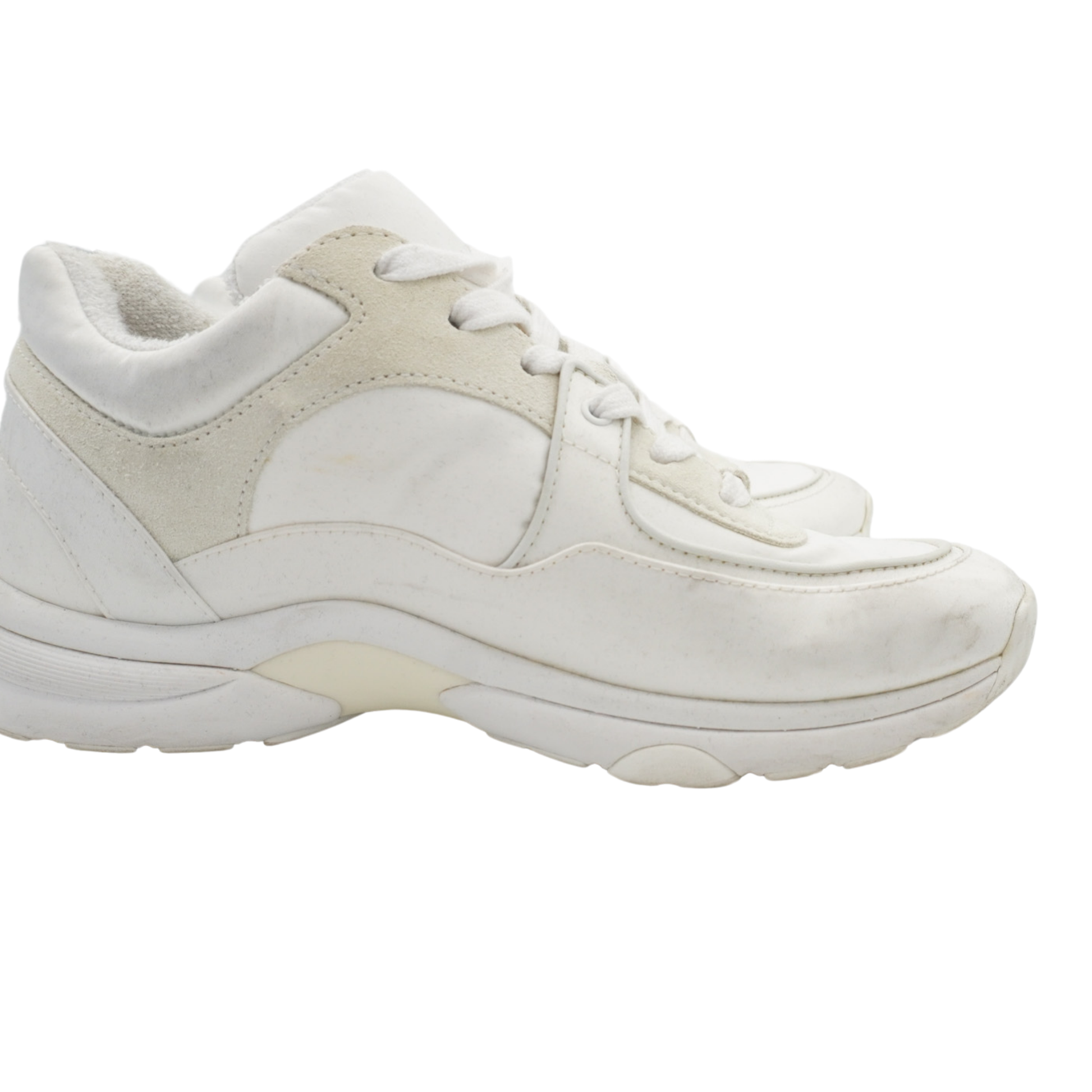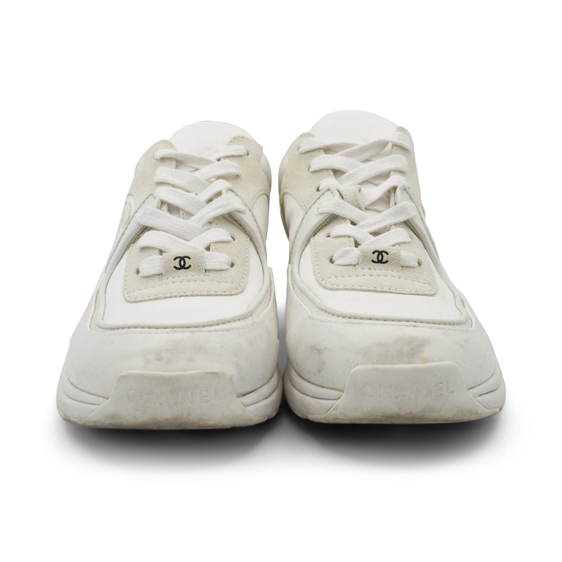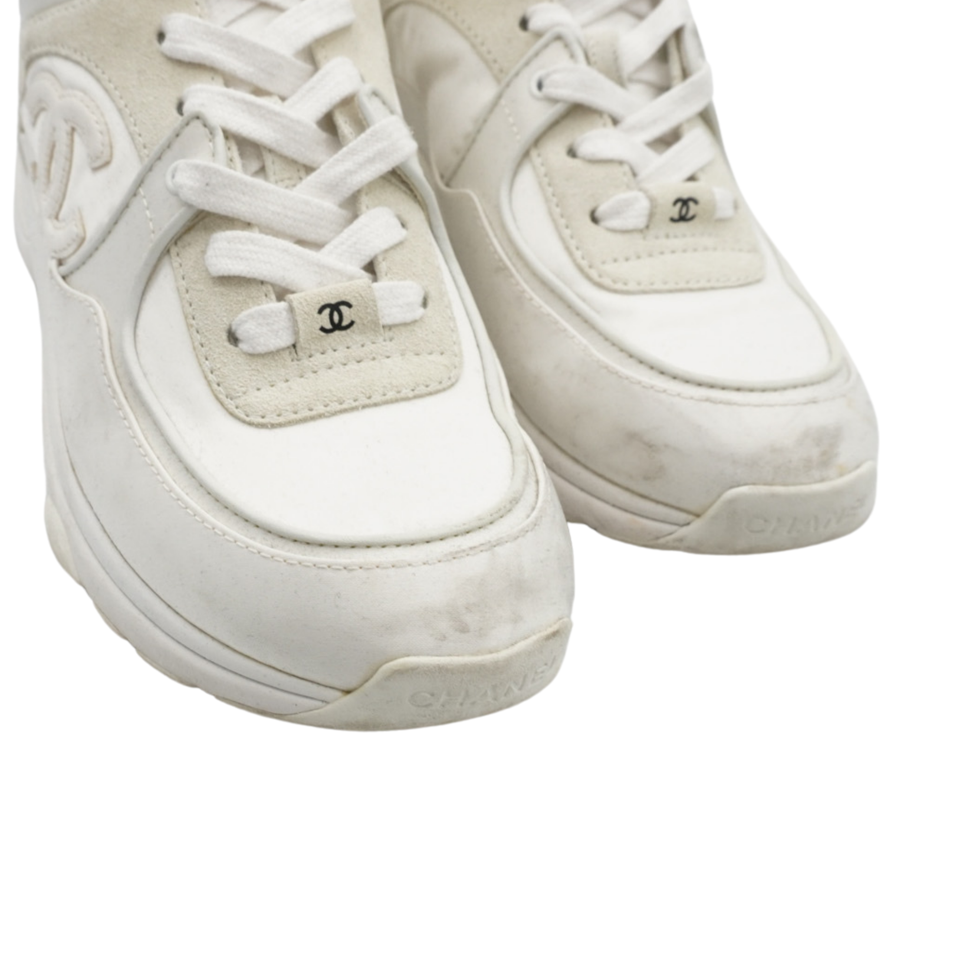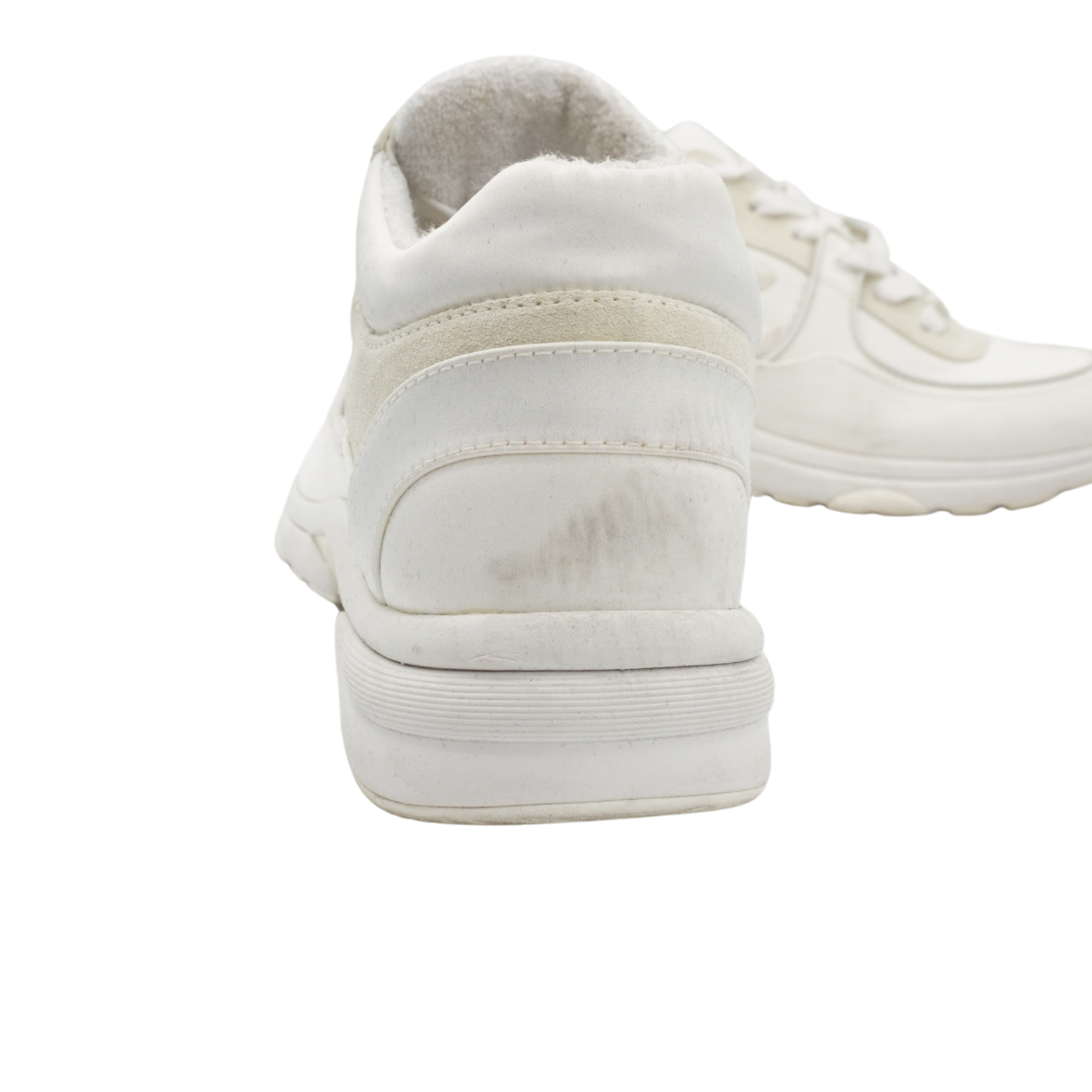 Chanel sneakers in white satin and cream suede with a tonal 'CC' logo on the sides and a white rubber sole.