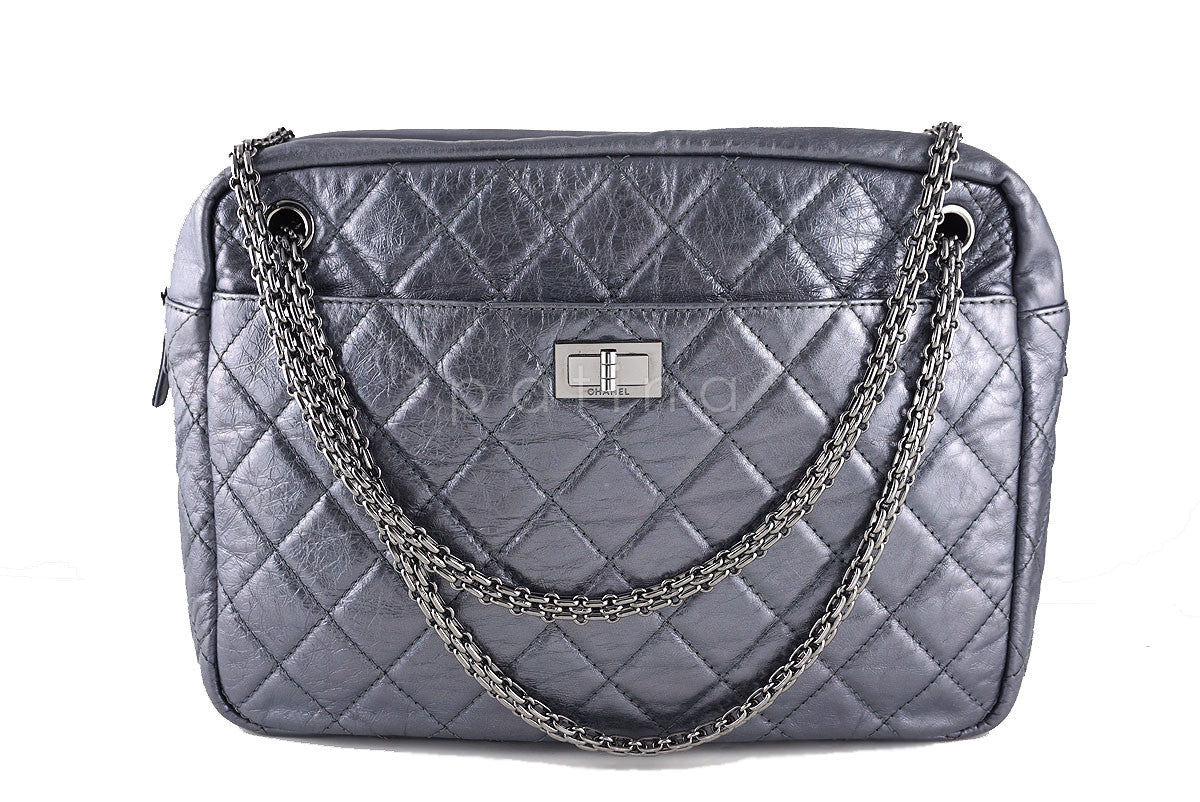 Chanel Dark Silver Classic 2.55 Reissue Camera Case Bag combines both - a timeless classic, distressed textured Dark Silver calfskin with dark silver (ruthenium) hardware bijoux chain, front "reissue" Mademoiselle clasp and Dark Silver lambskin interior.