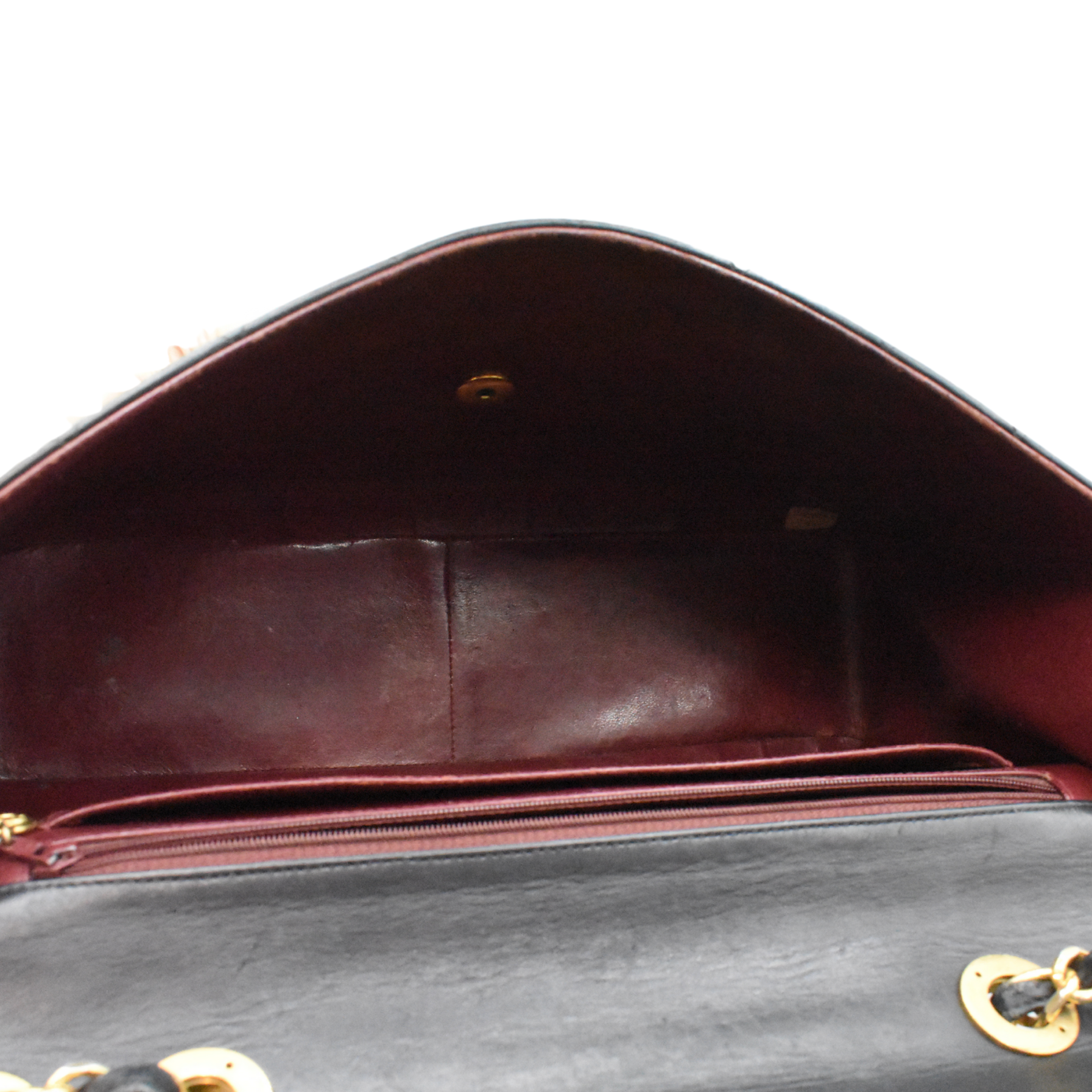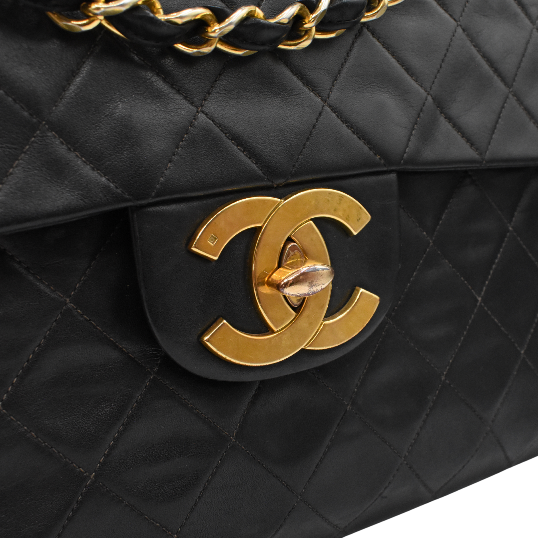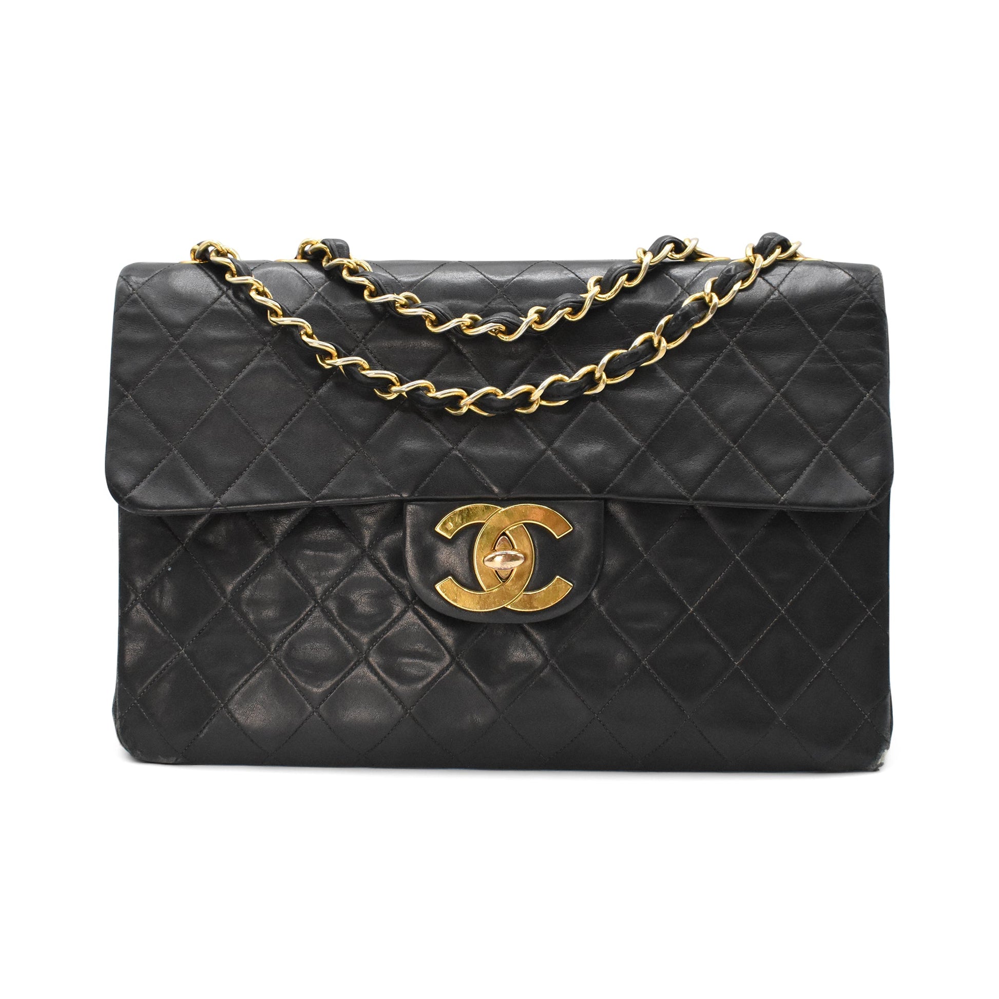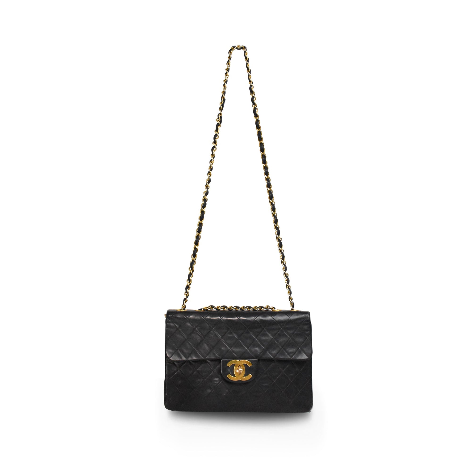 Chanel vintage 'Jumbo XL' flap. bag in quilted black lambskin leather with 24kt gold plated hardware and signature chain strap. Features an oversized CC turnlock closure, a slip pocket on the back, and burgundy leather lining with one interior zip pocket.