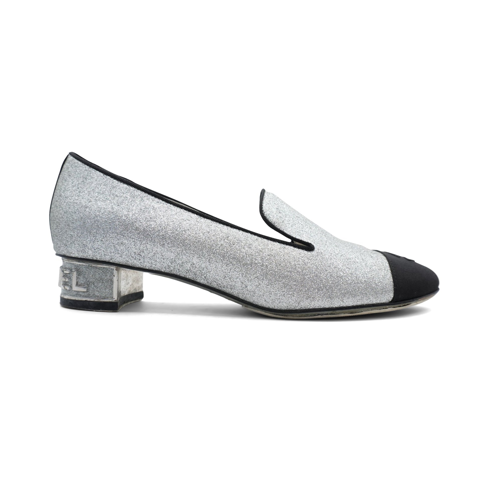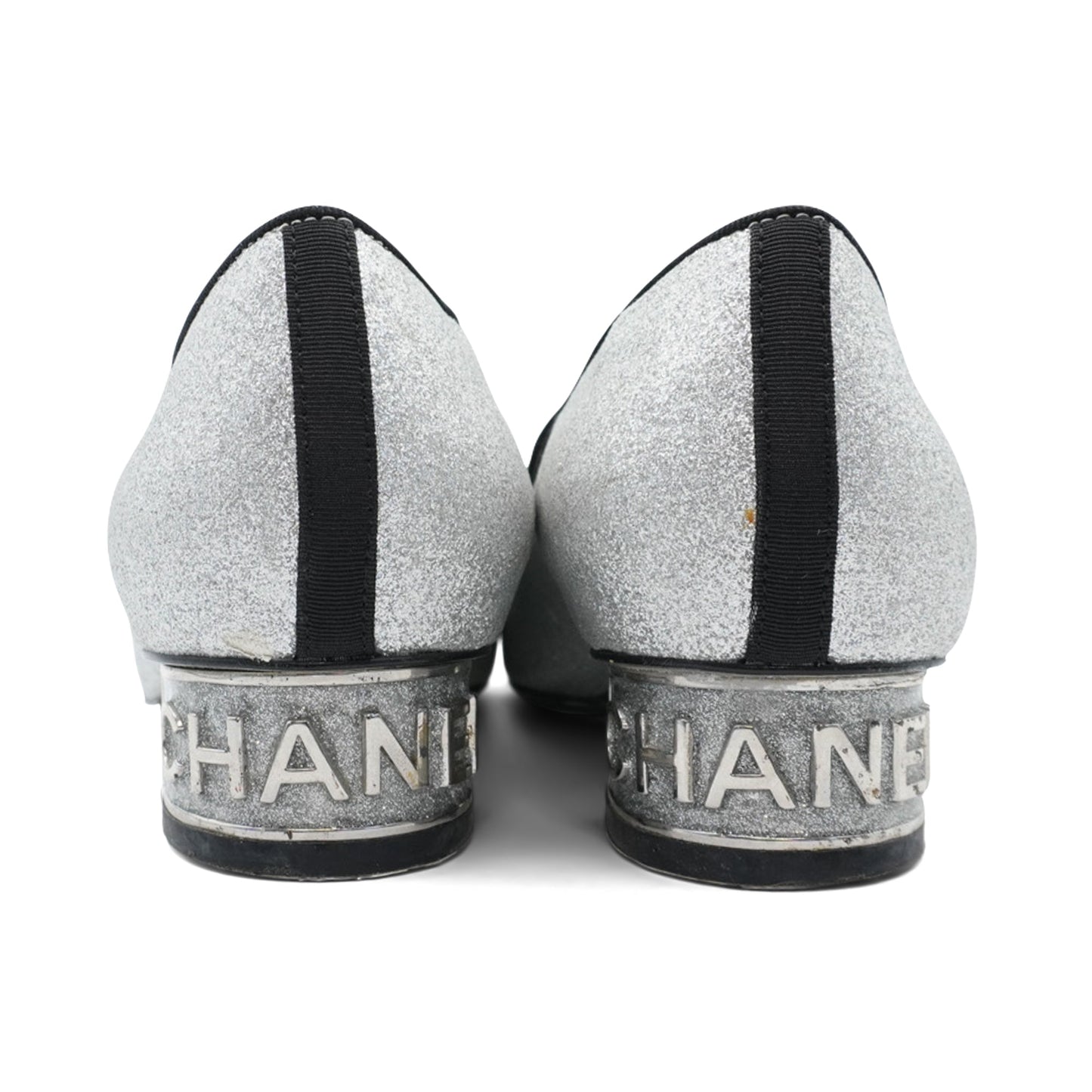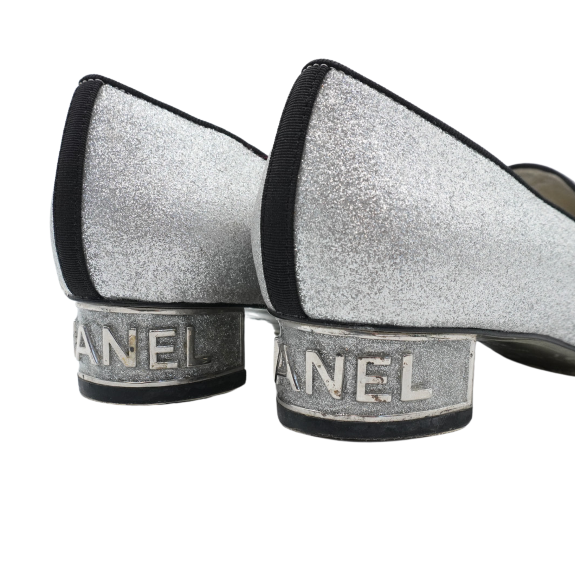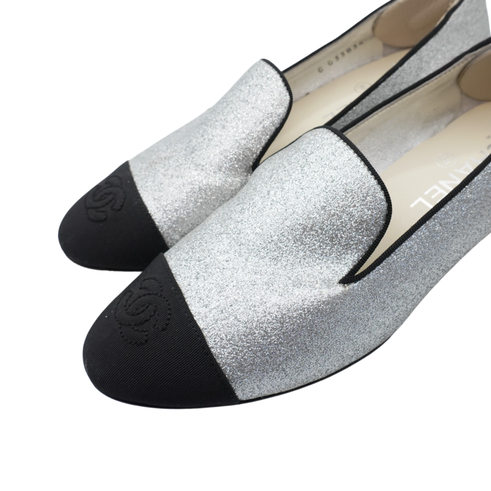 Chanel kitten heel loafers in silver glitter with a black grosgrain toe cap featuring CC embroidery and silver logo text on the heels.