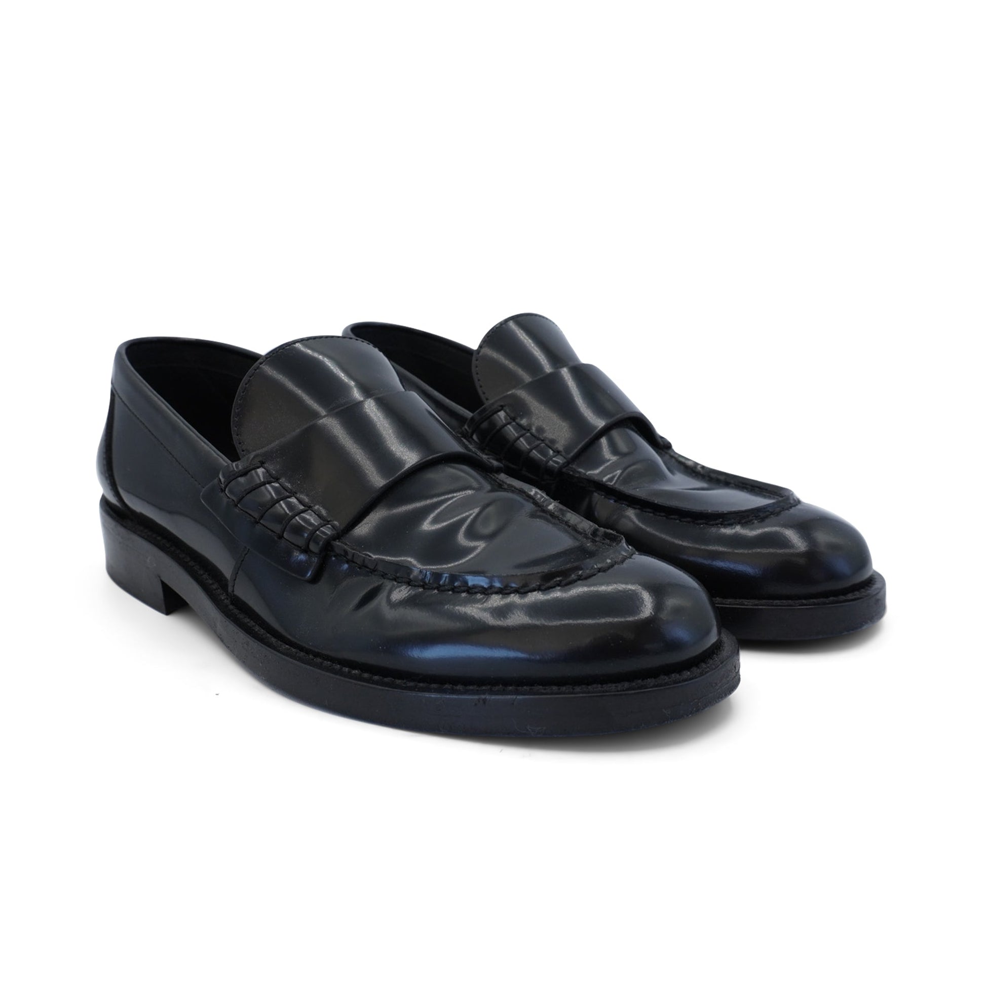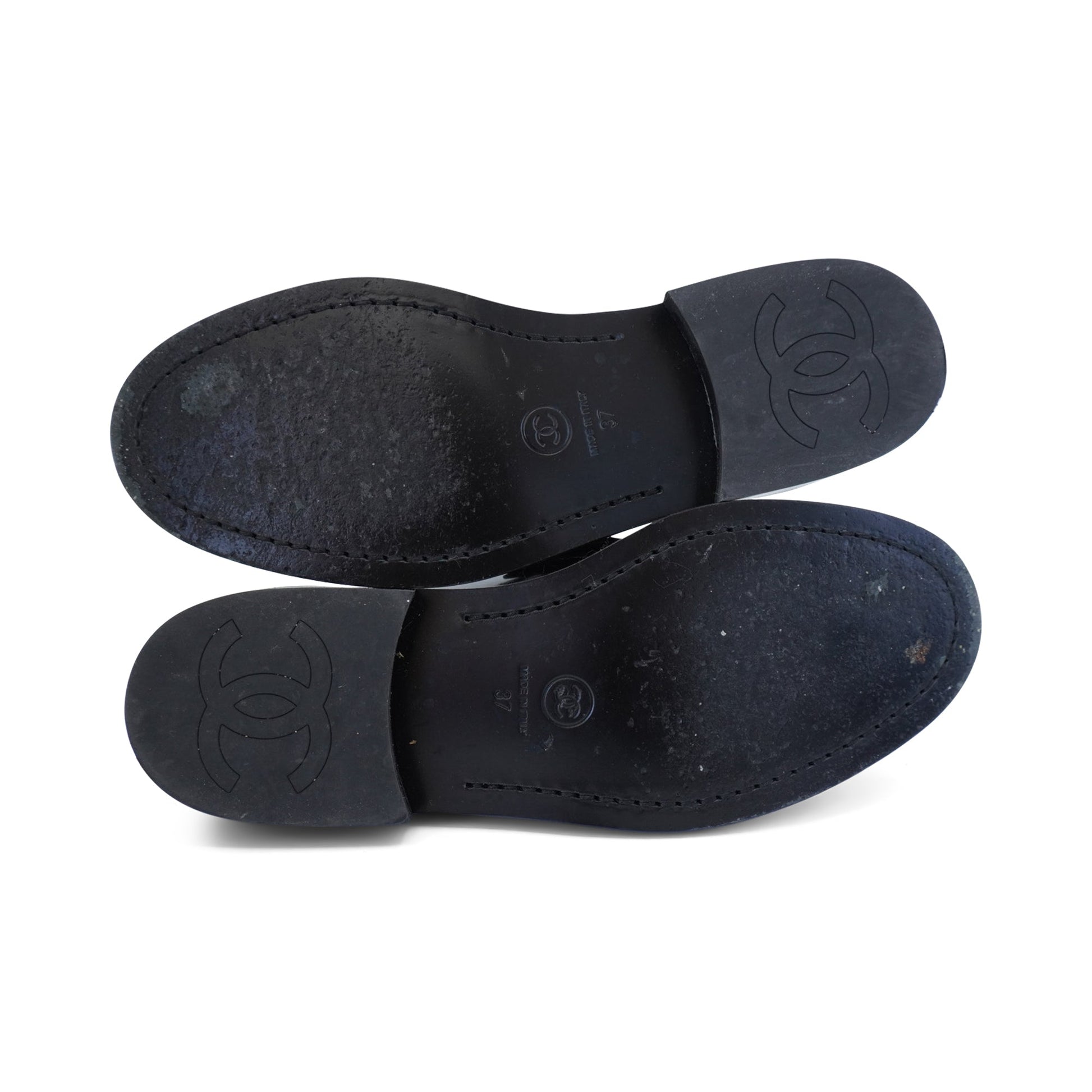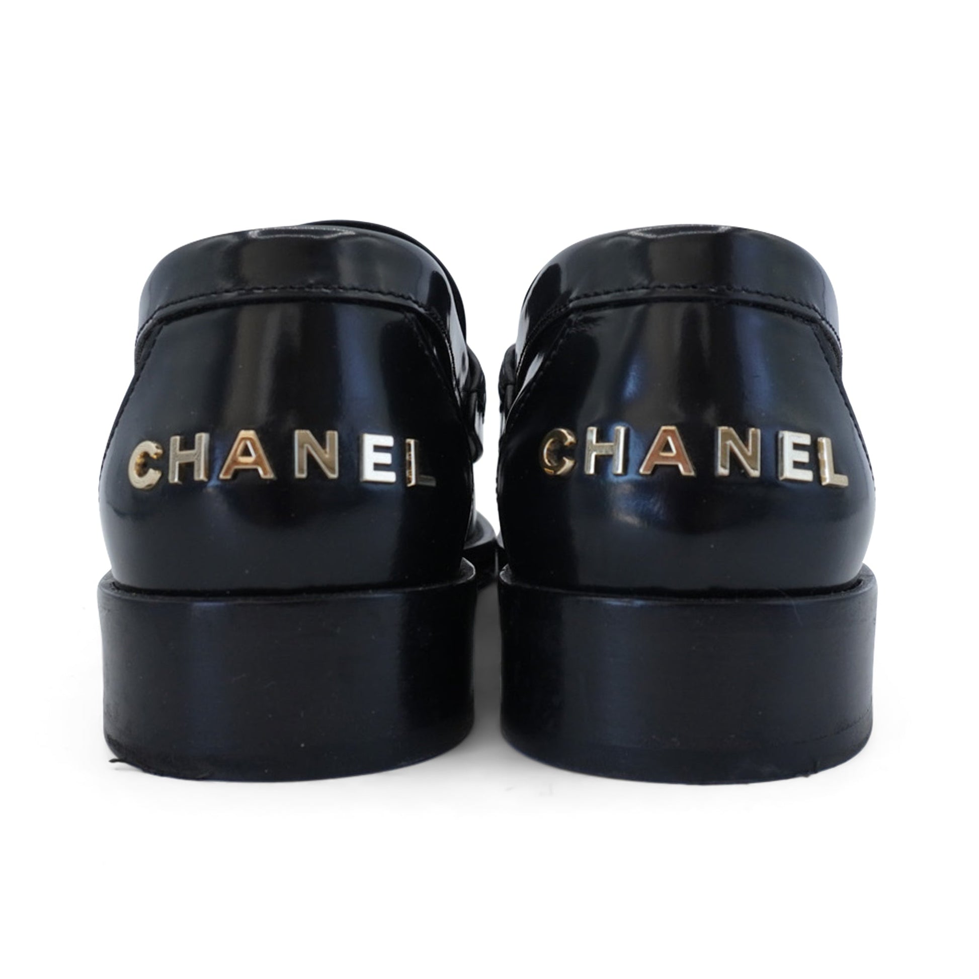 Chanel loafers in glossy black leather with gold logo letter across the heel.