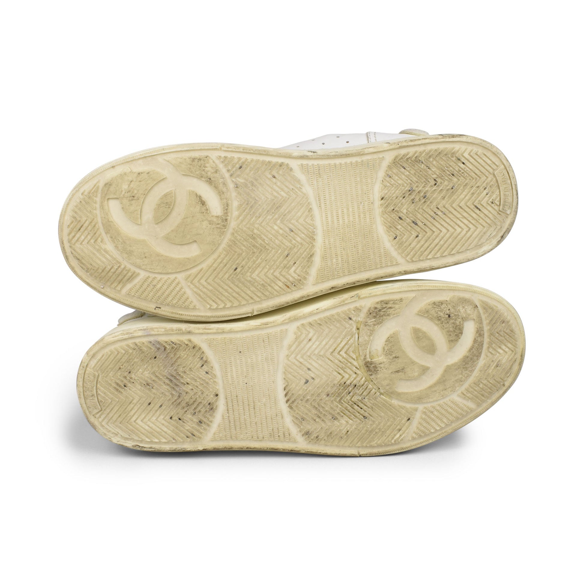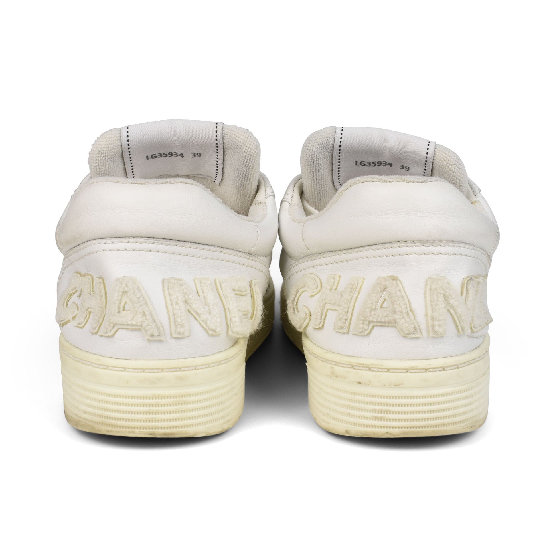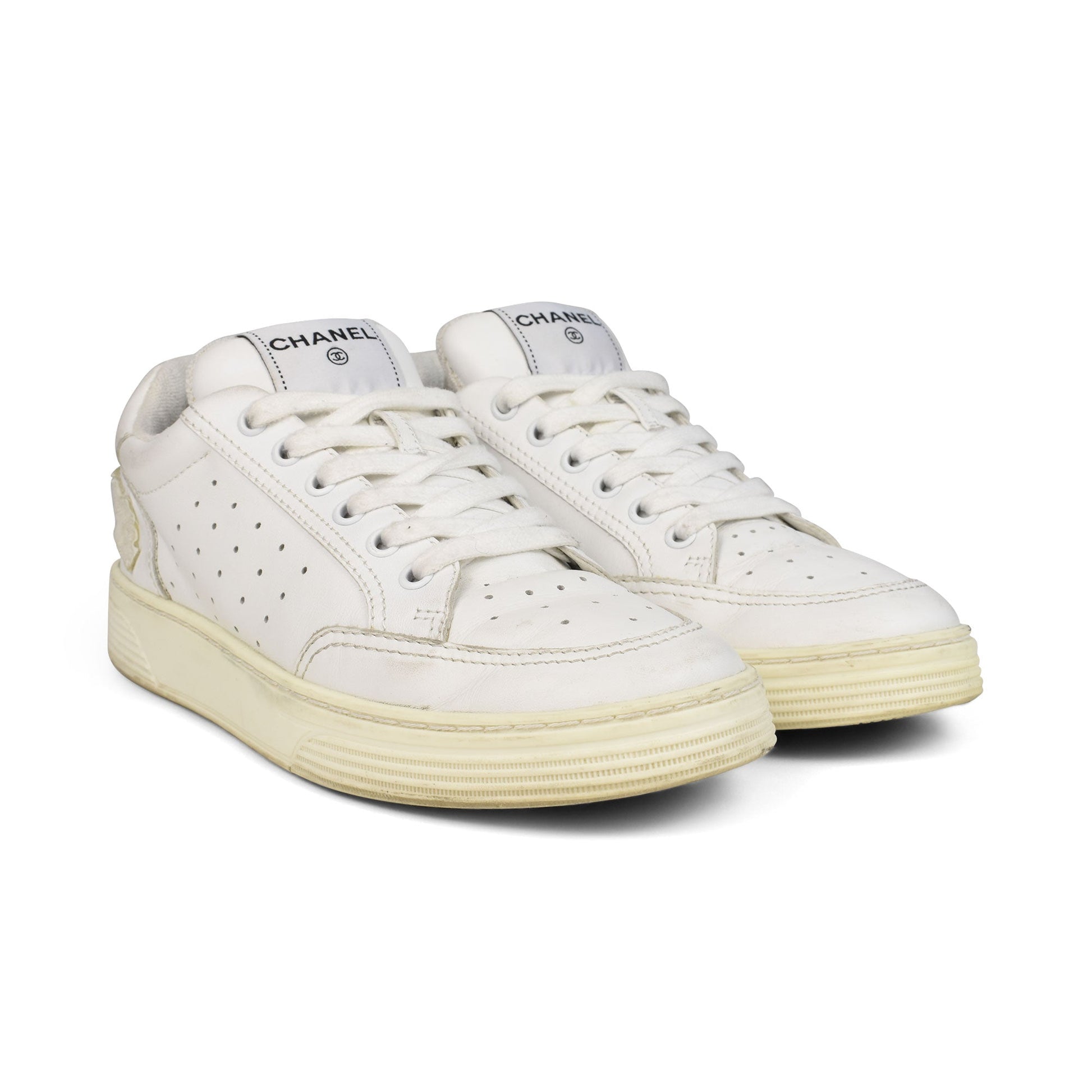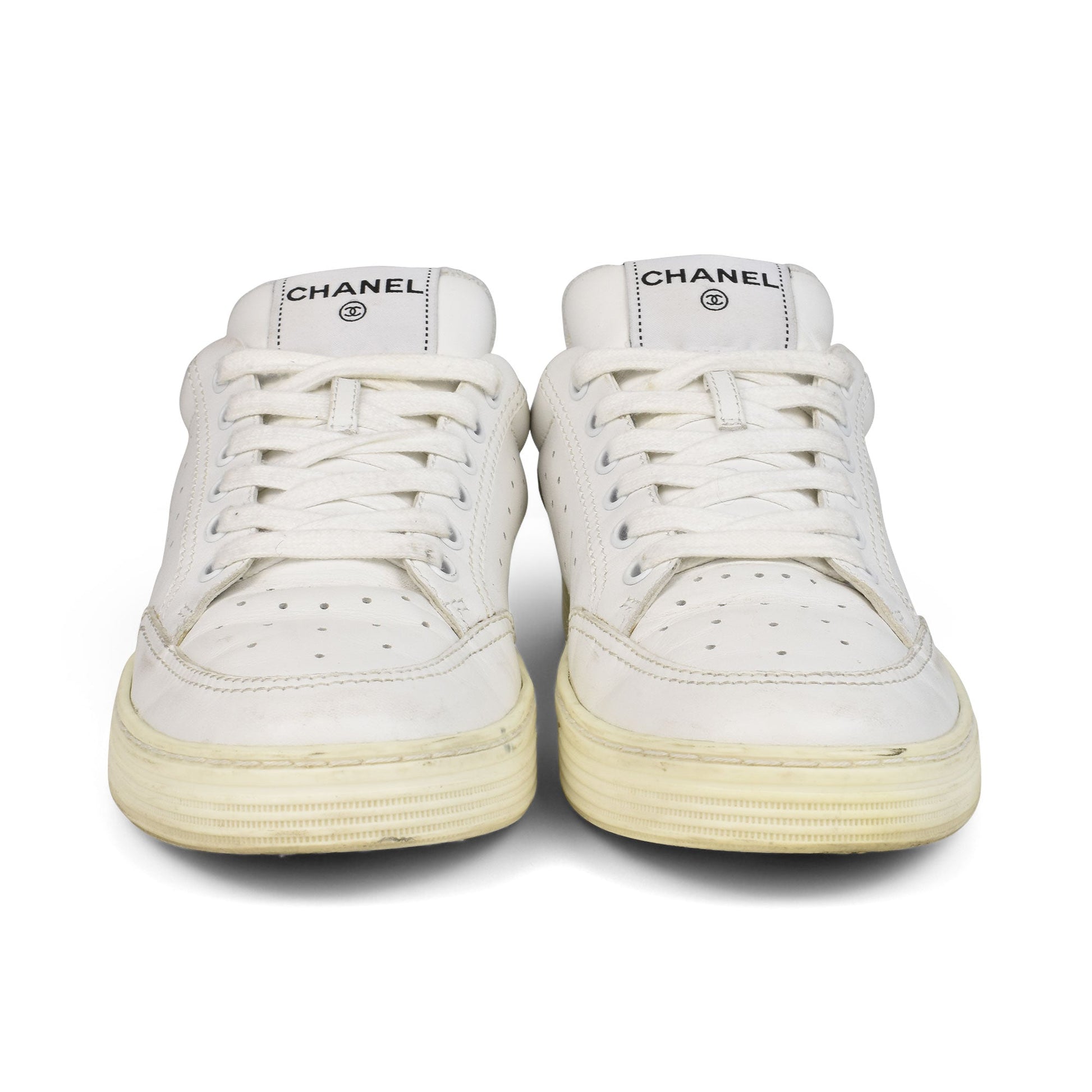 Chanel low-top sneakers in white leather with perforated side seam panels, thick cream rubber soles, and a raised logo across the back heel in white terrycloth.