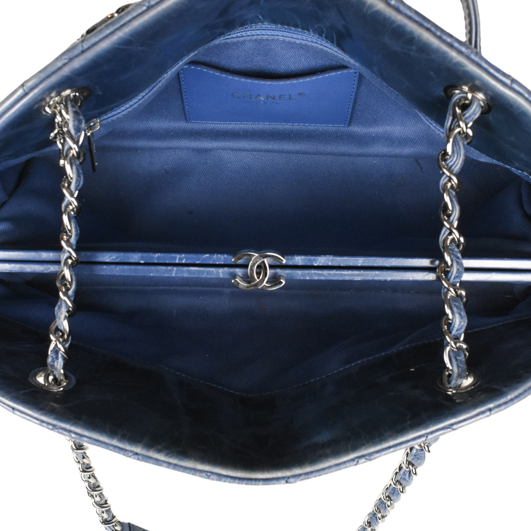 Chanel 'Mademoiselle' shoulder bag in blue quilted leather with two mademoiselle chain shoulder straps. Features a half-moon shape, silver hardware, and a silver 'CC' charm. The interior features blue canvas lining, two main compartments, a centre framed pocket with a 'CC' kiss-lock closure, a zip pocket, and a card slot. Circa 2011.