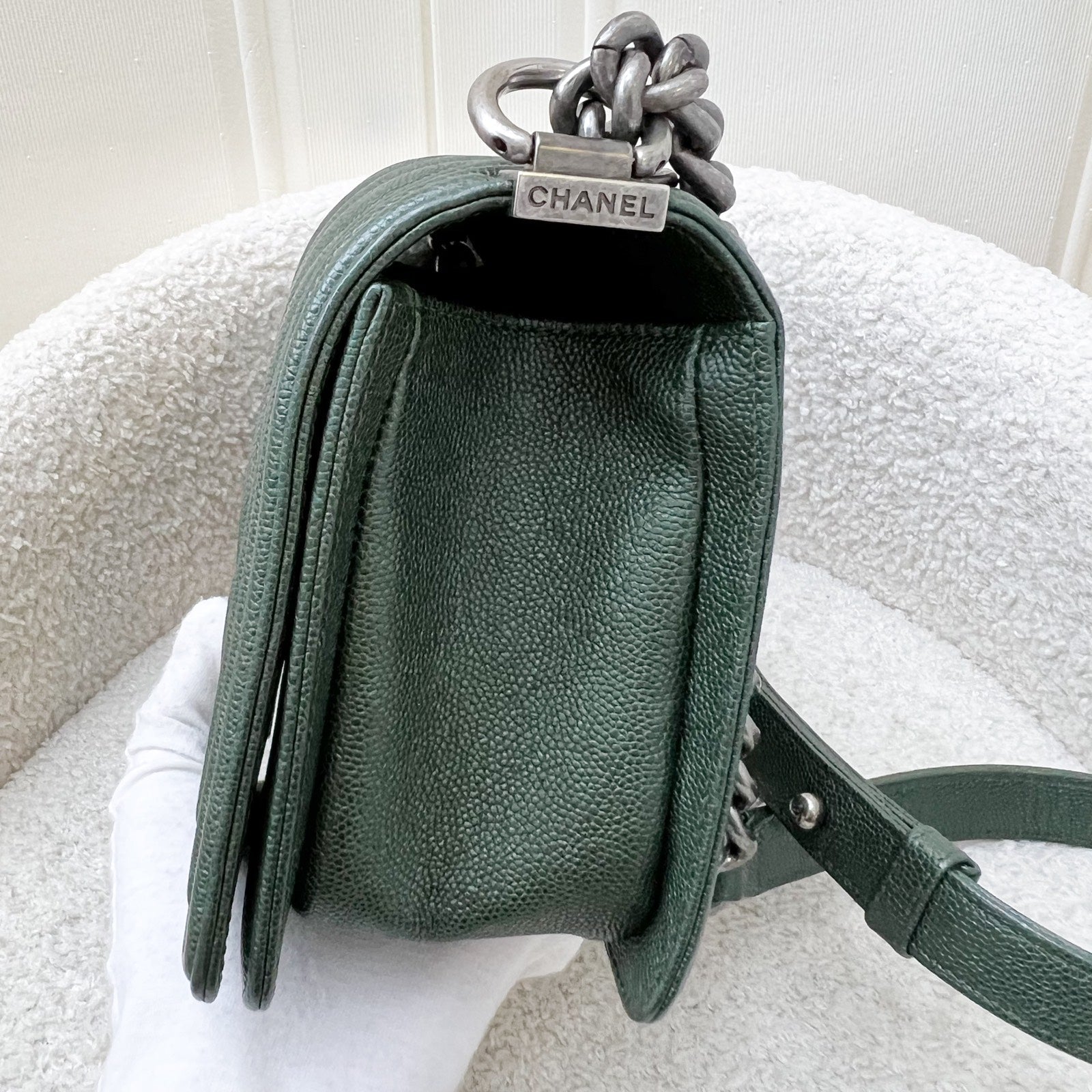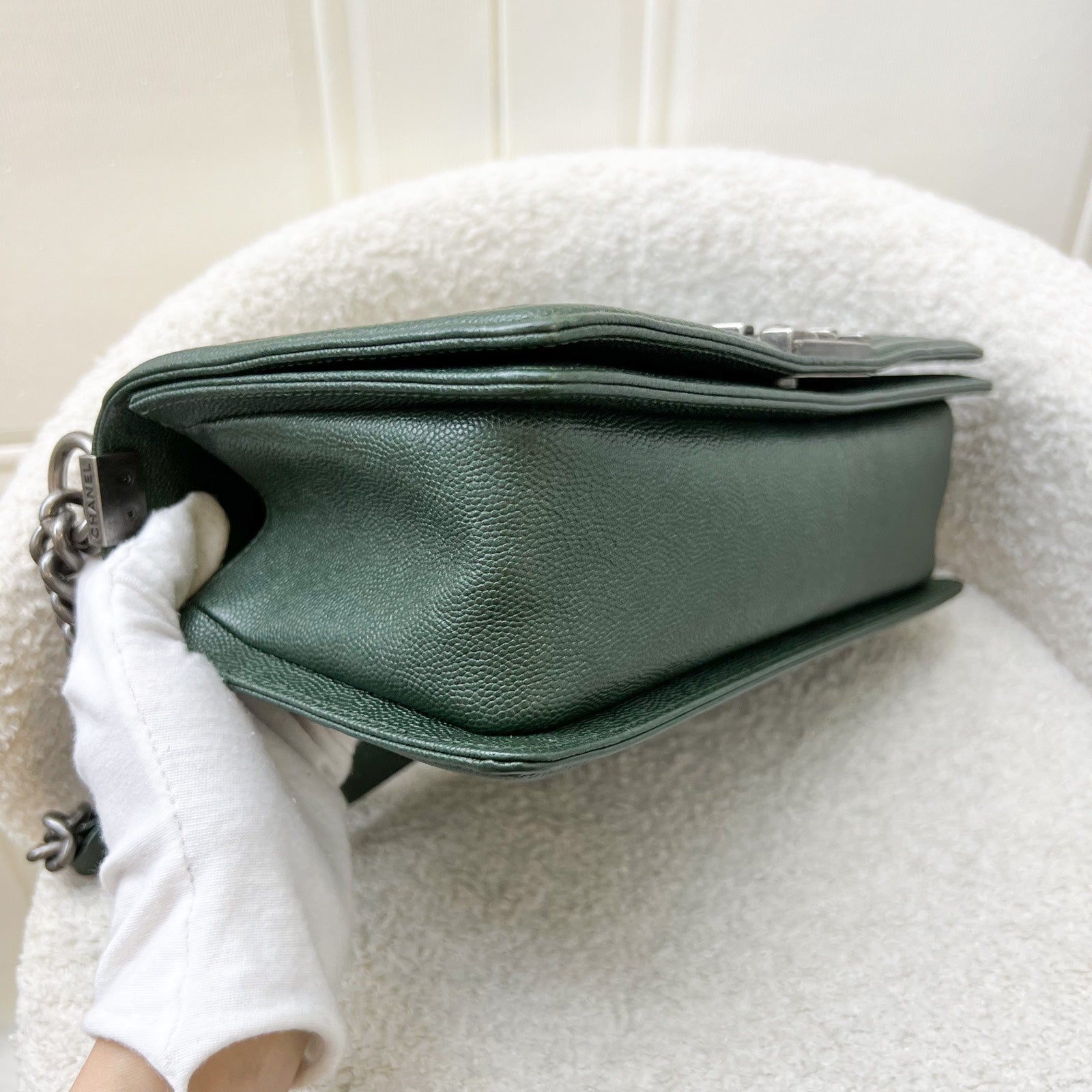 Chanel Medium 25cm Boy Flap in Chevron Quilted Forest Green Caviar and RHW (Model: A67086)