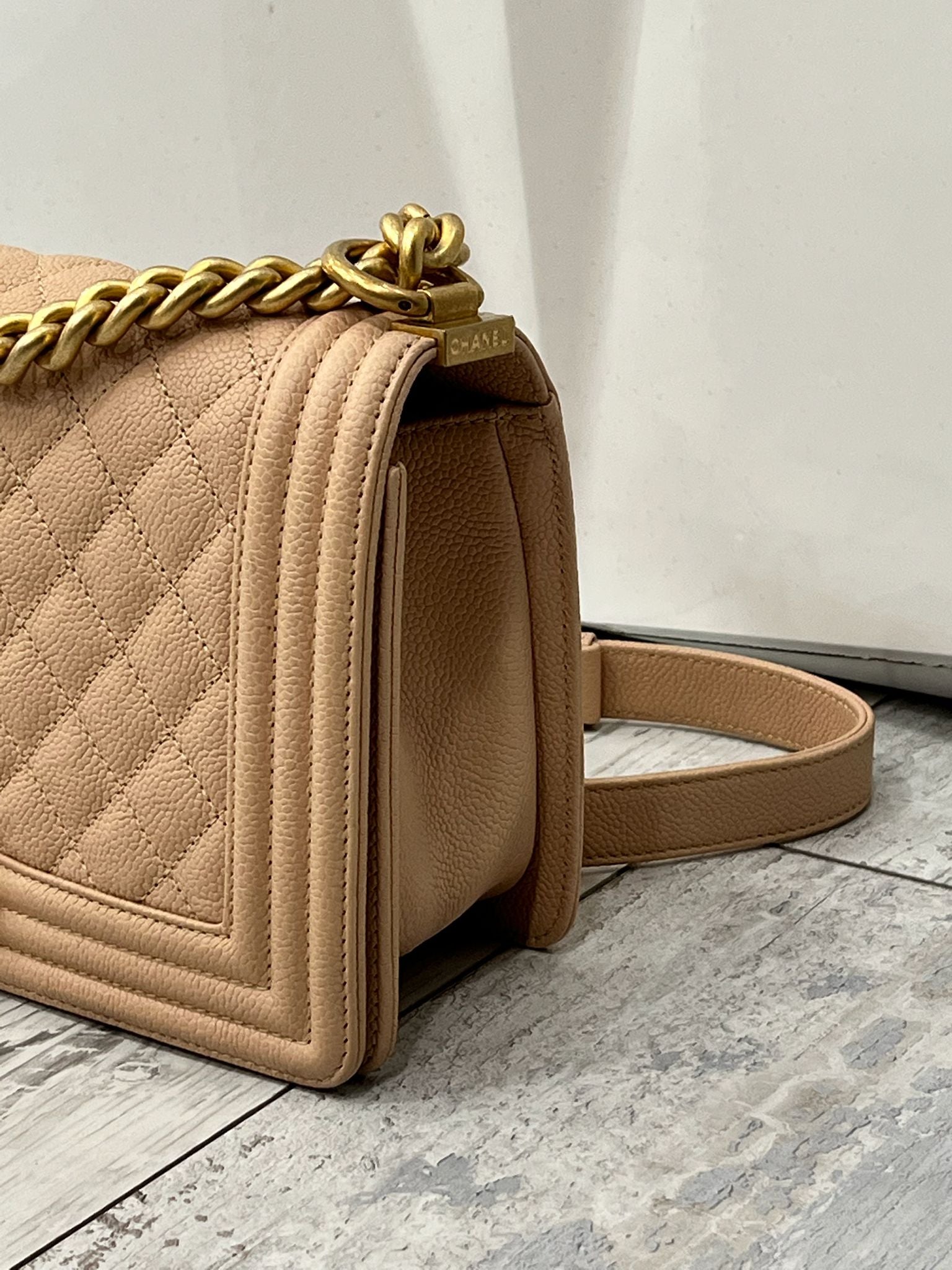 This Exquisite CHANEL Boy Flap bag is crafted from luxurious beige Caviar leather with signature diamond quilting and bold linear-stitched borders. A timeless yet edgy silhouette, it features gleaming gold-tone hardware, including the iconic CC Boy push-lock closure. The structured flap opens to a fabric-lined interior with a flat pocket, ideal for keeping essentials organized. A gold chain-link shoulder strap with a leather pad offers comfortable, hands-free wear.