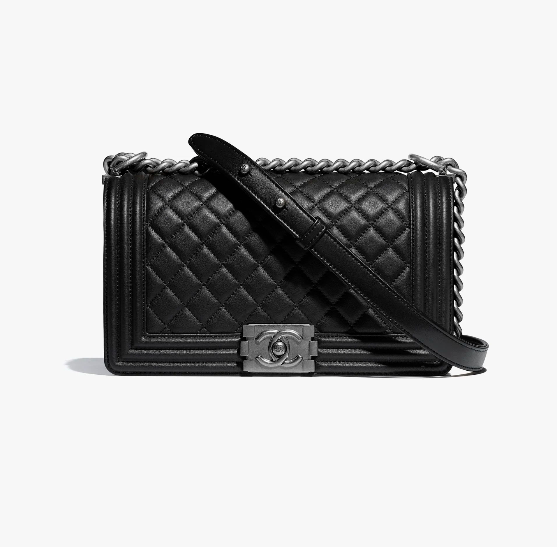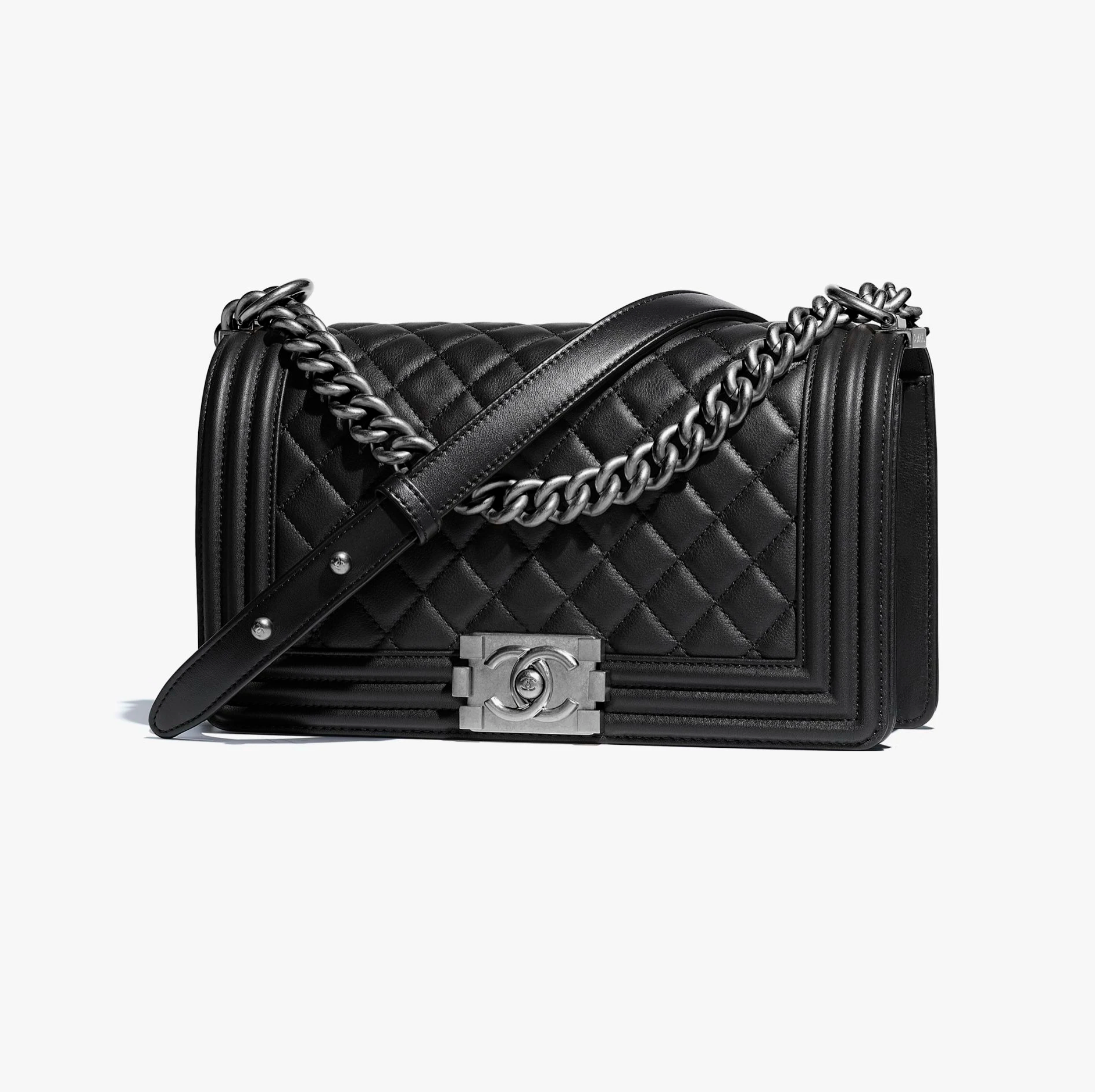 The bag features a Ruthenium-Finish Metal chain link & Hardware, a shoulder strap with a leather shoulder pad, and a Ruthenium Finis Chanel boy CC press lock.