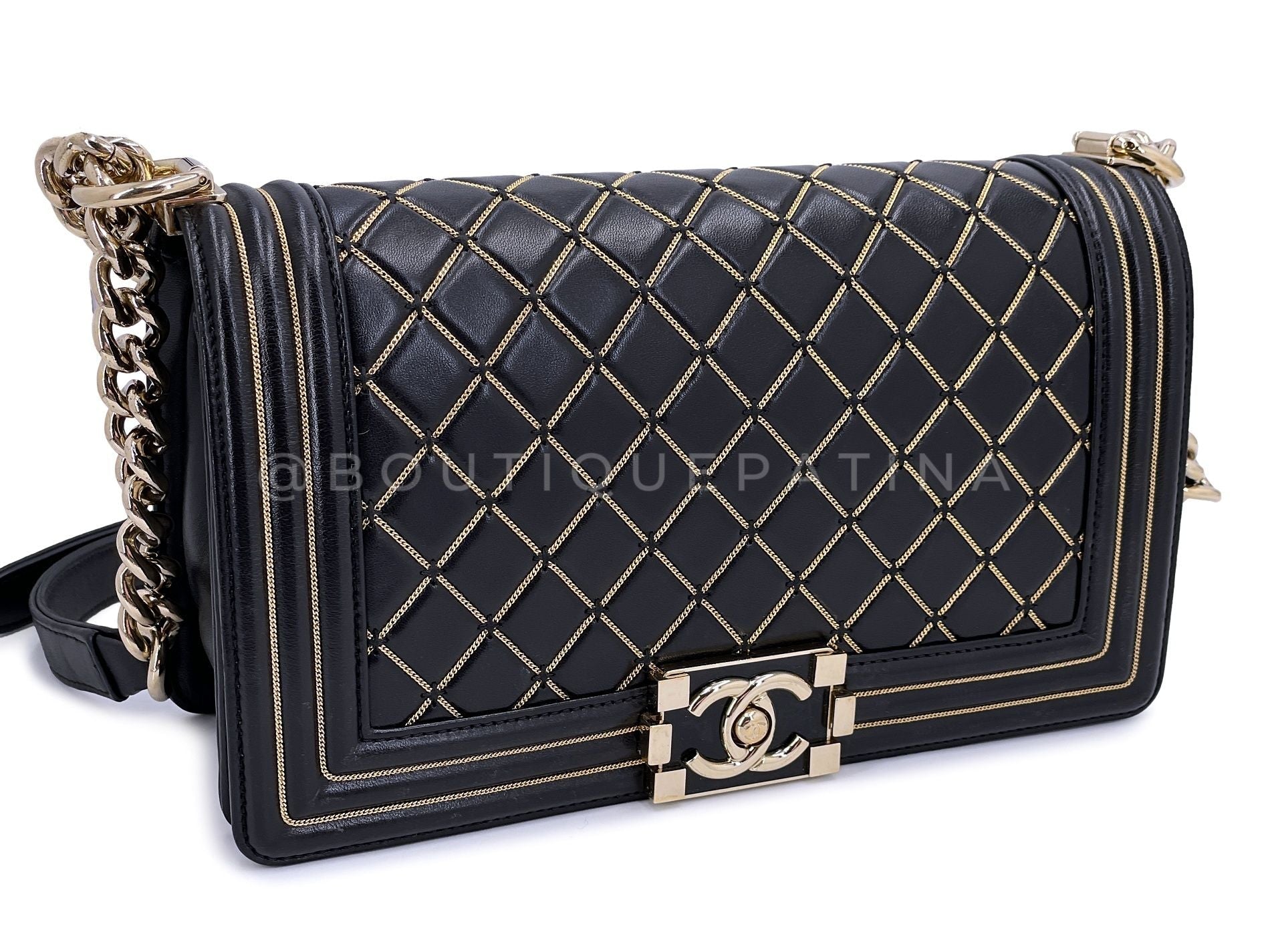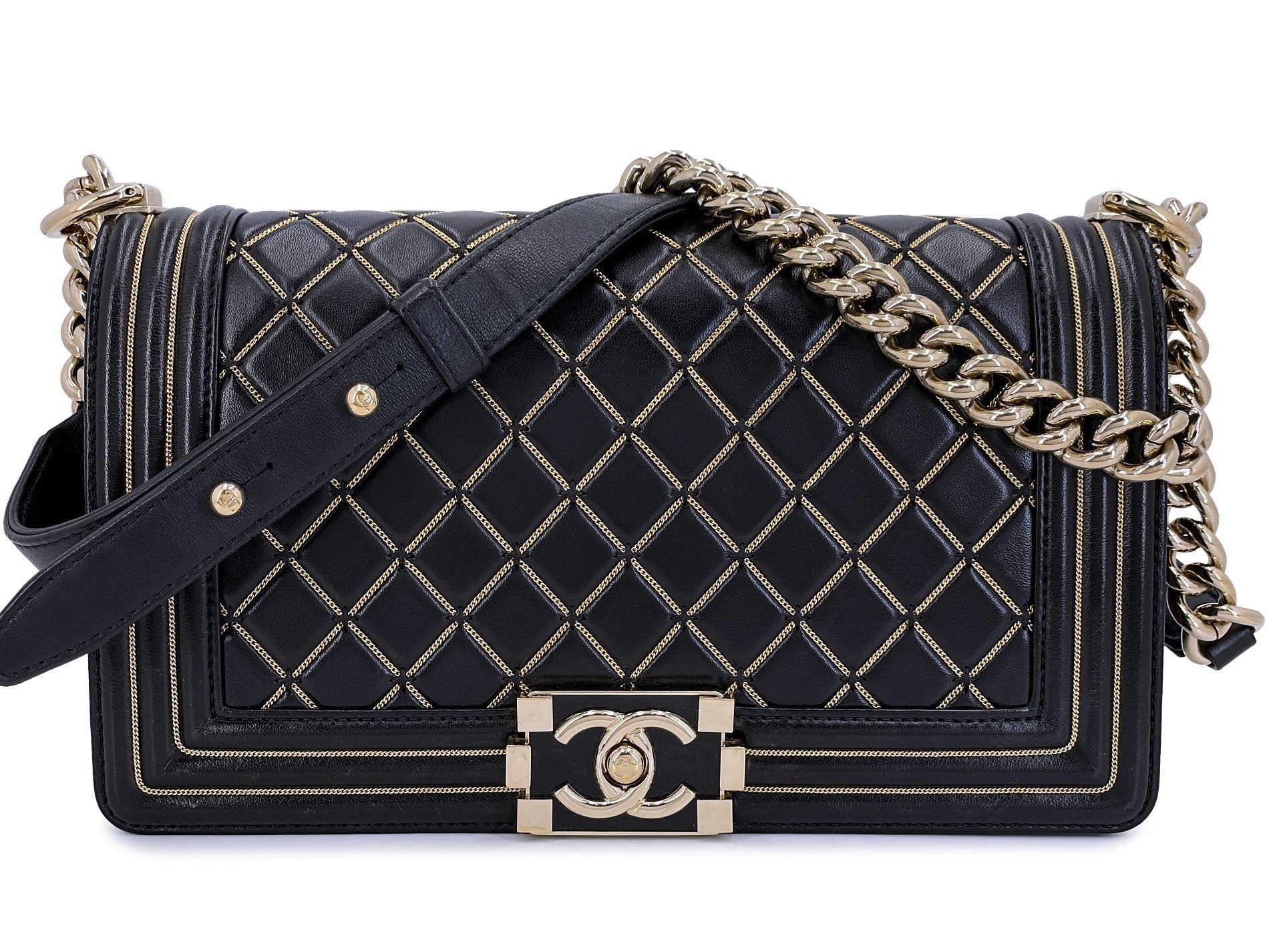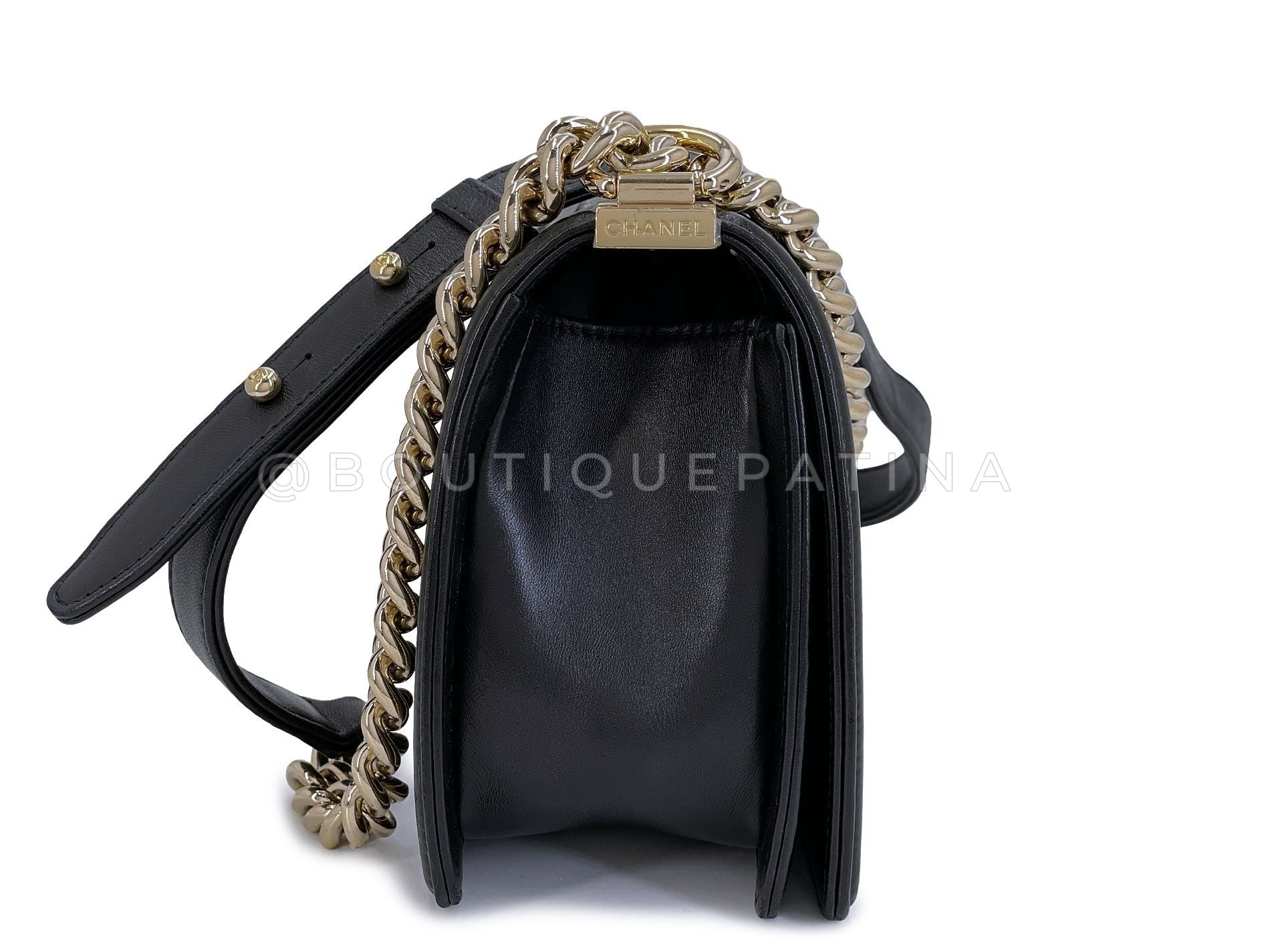 In black lambskin leather and gold hardware. The boy bag in lambskin leather gives the bag the classic quintessential look of Chanel. Beautiful quilted panels are made even more luxurious with this premium leather made of the finest lambskin.