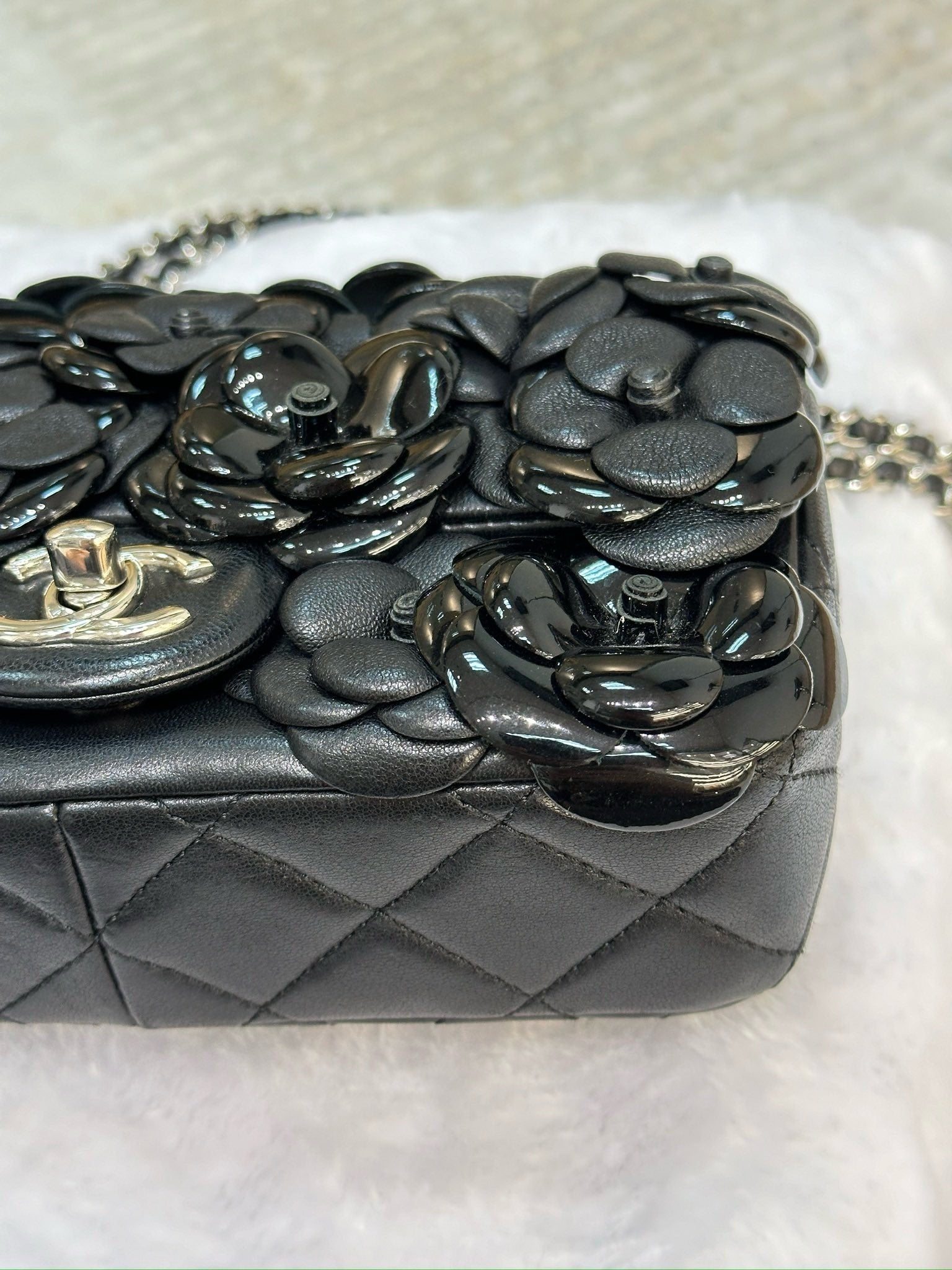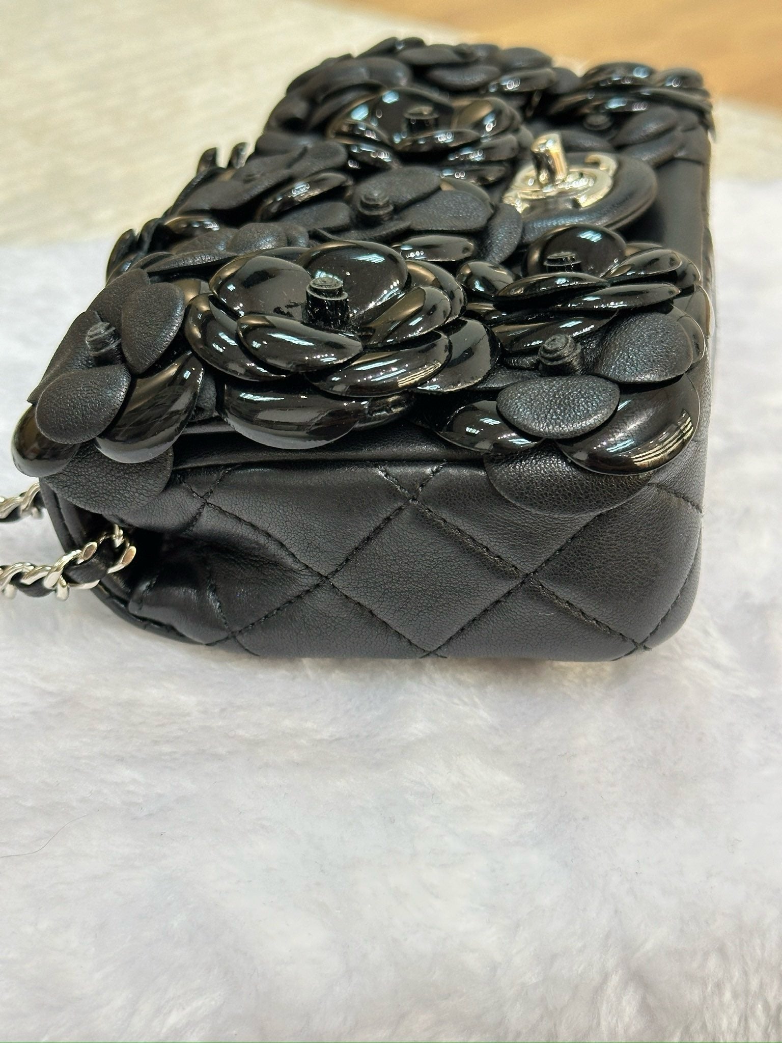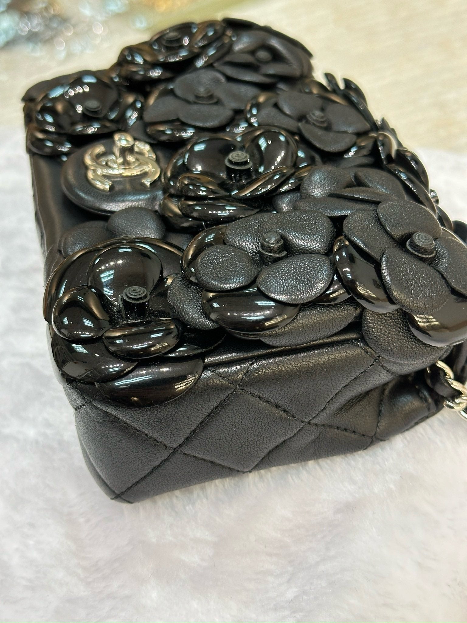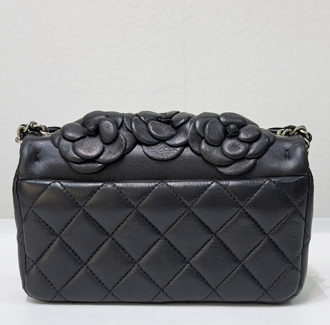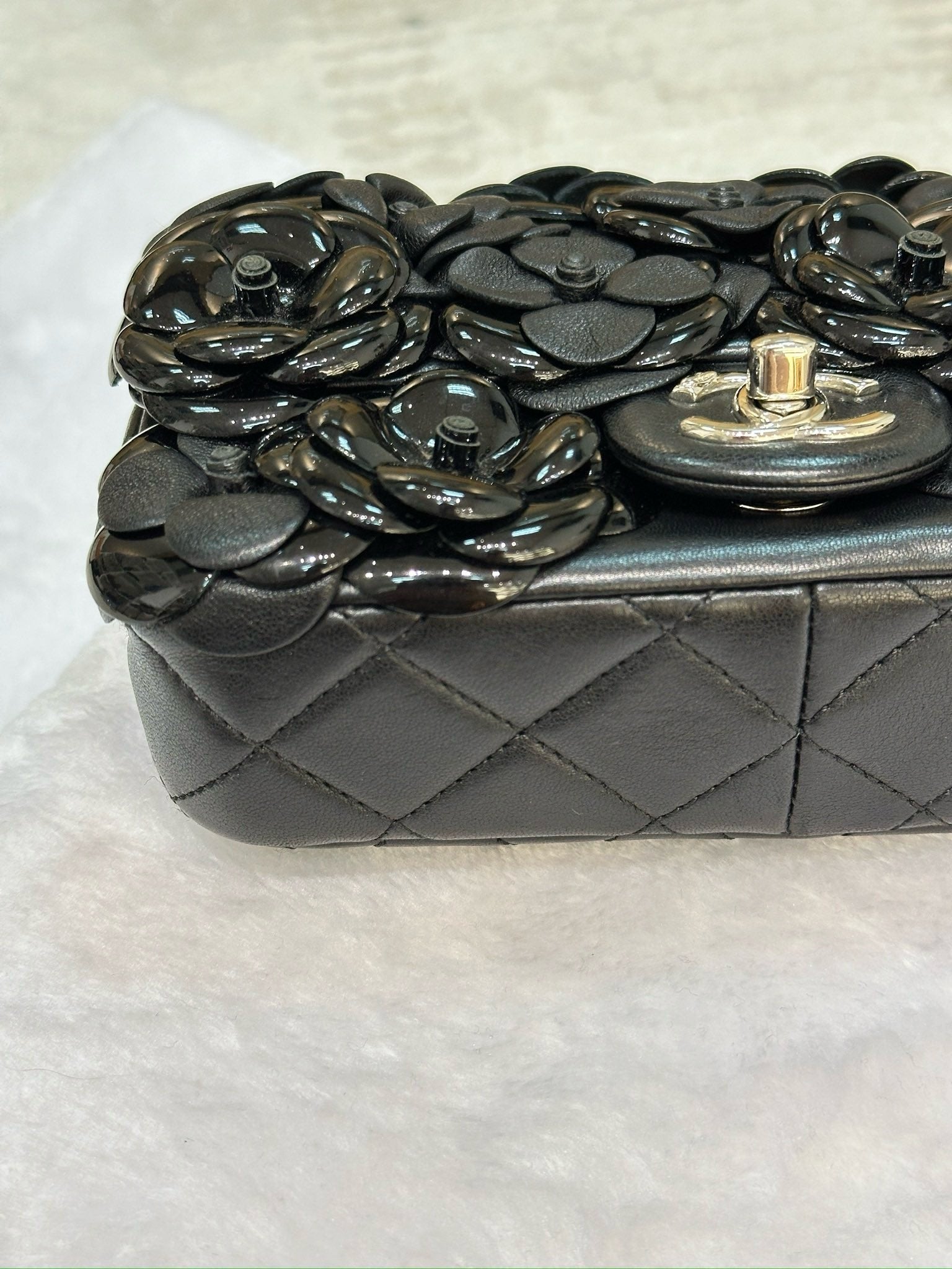 Chanel Mini Limited Edition Black Camellia Lambskin Flap Bag