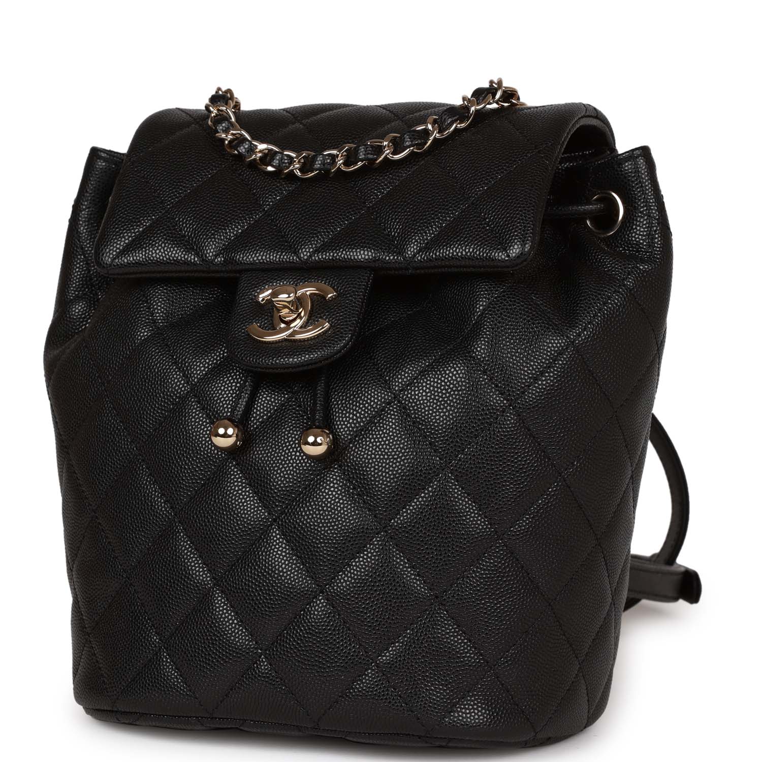 This Mini Urban Spirit backpack is of black caviar leather with gold tone hardware and has a front flap with signature CC logo, rear slip pocket, single interwoven black leather and gold tone chain link top handle and adjustable straps.